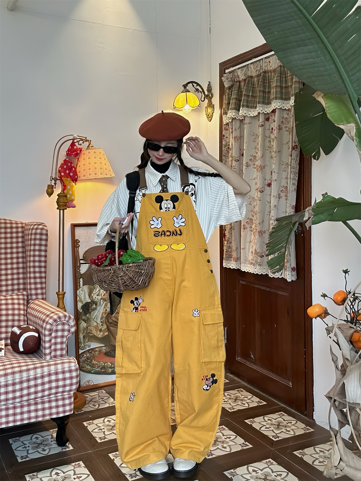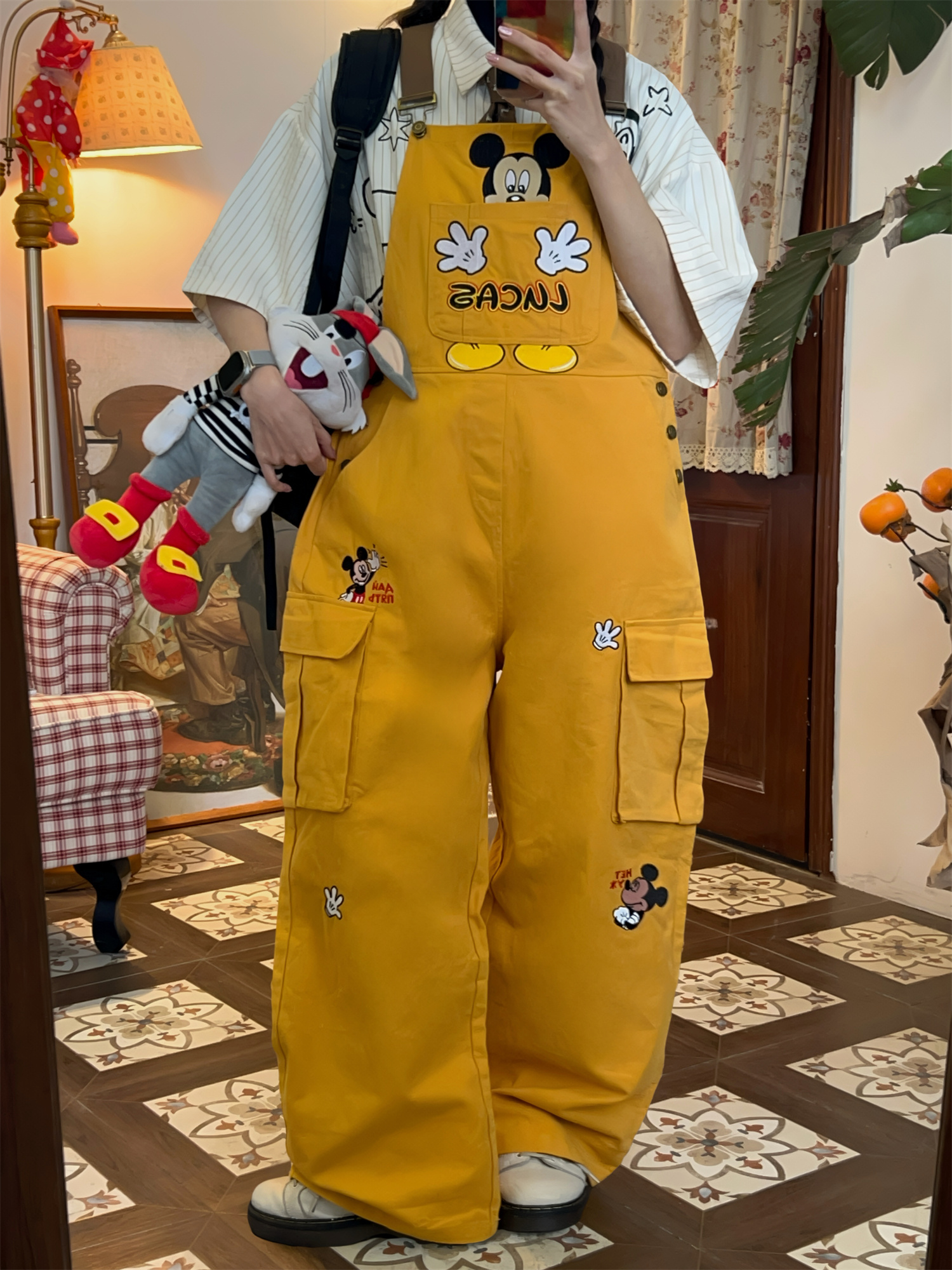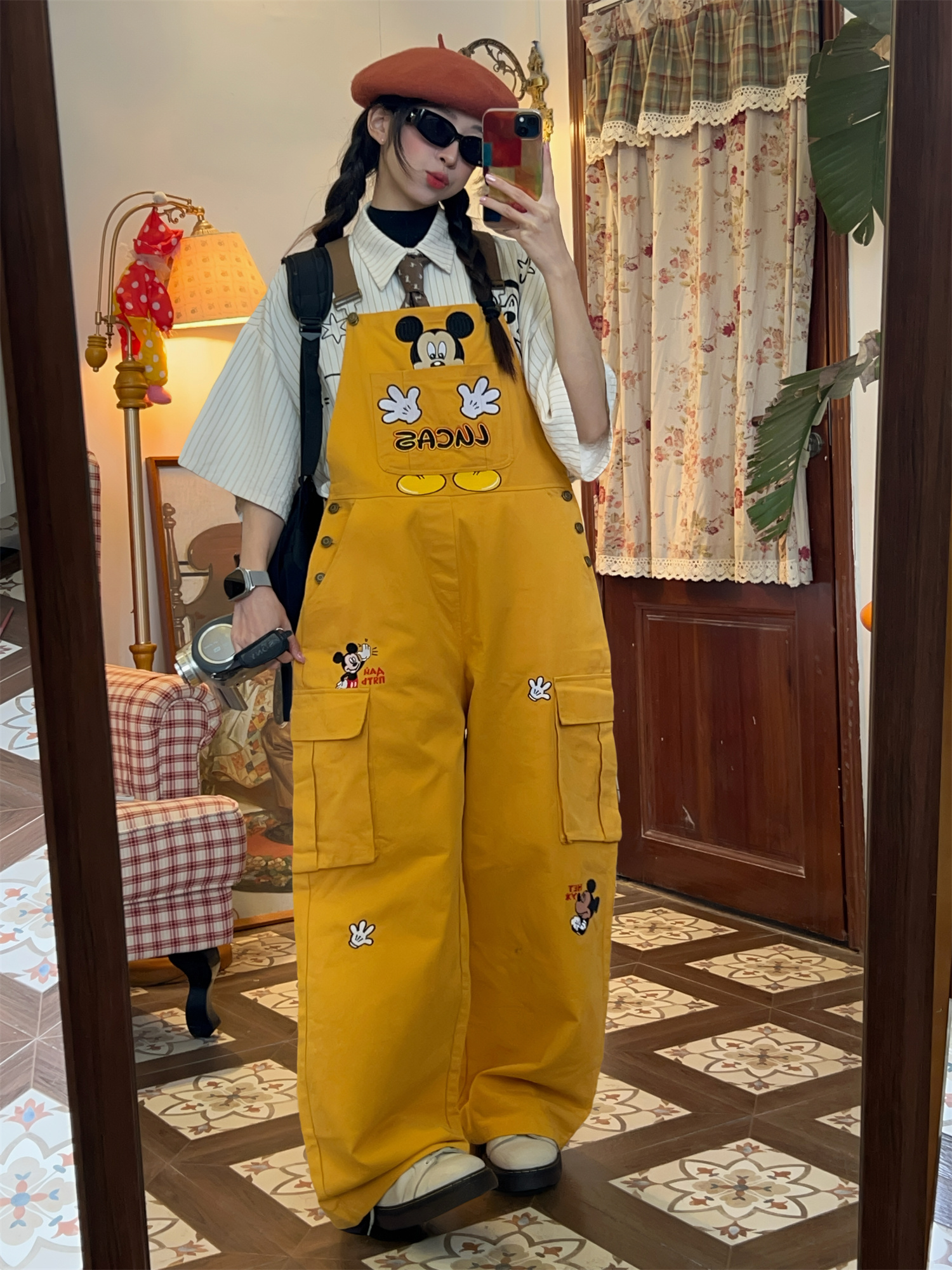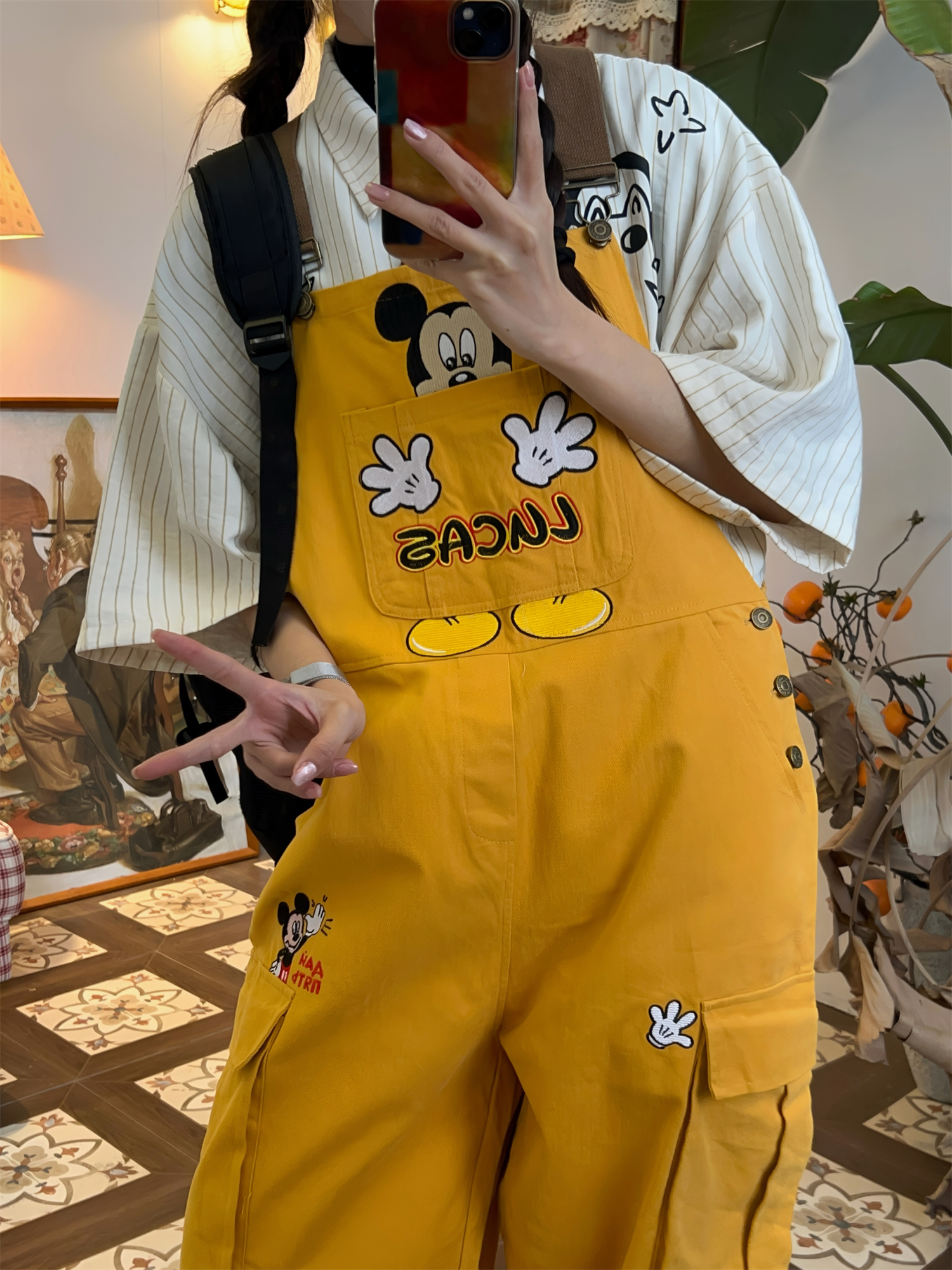 Vintage Mickey Mouse retro casual overalls, loose-fitting boyfriend style, American yellow wide-leg jumpsuit, spring and autumn.