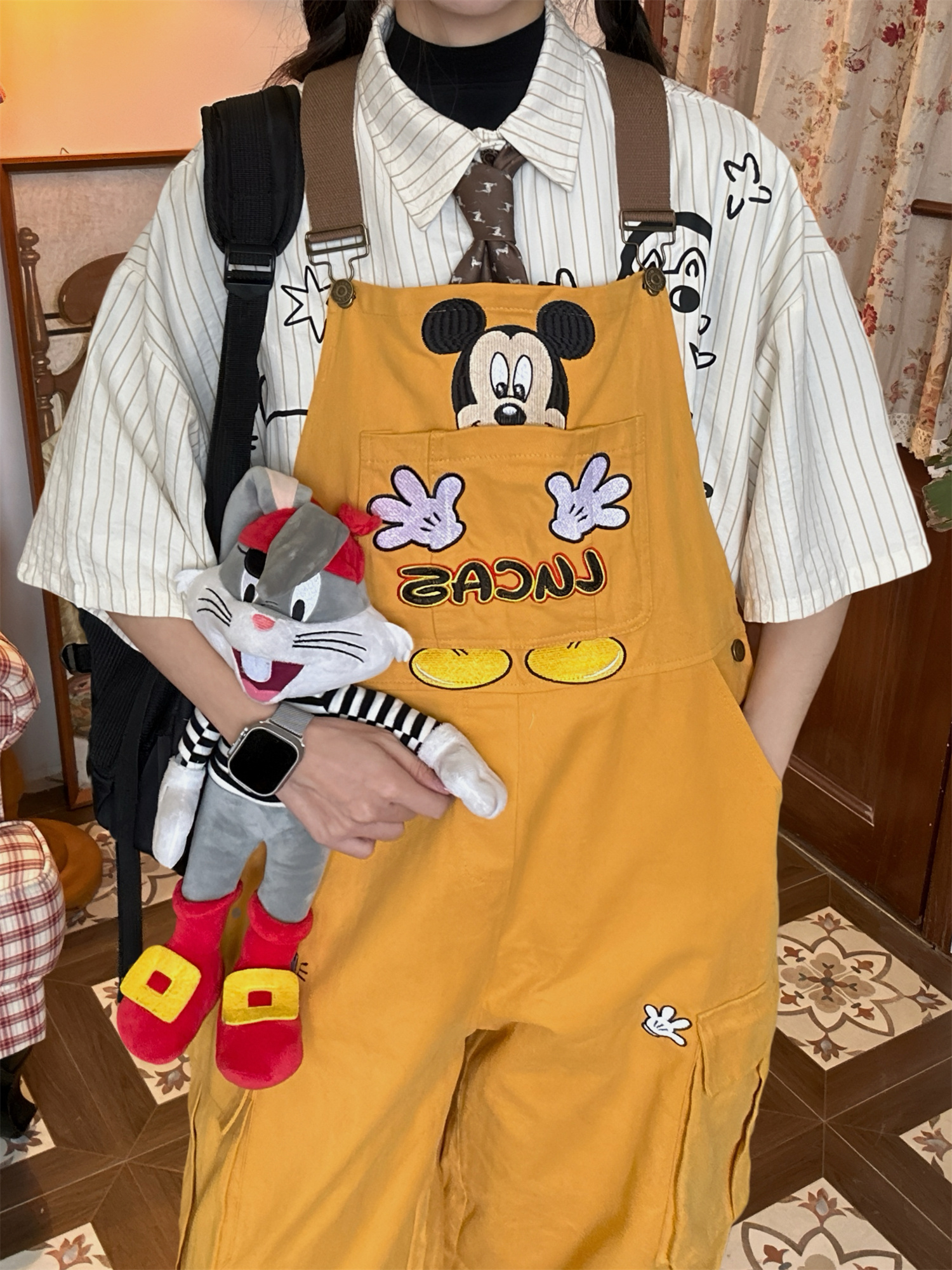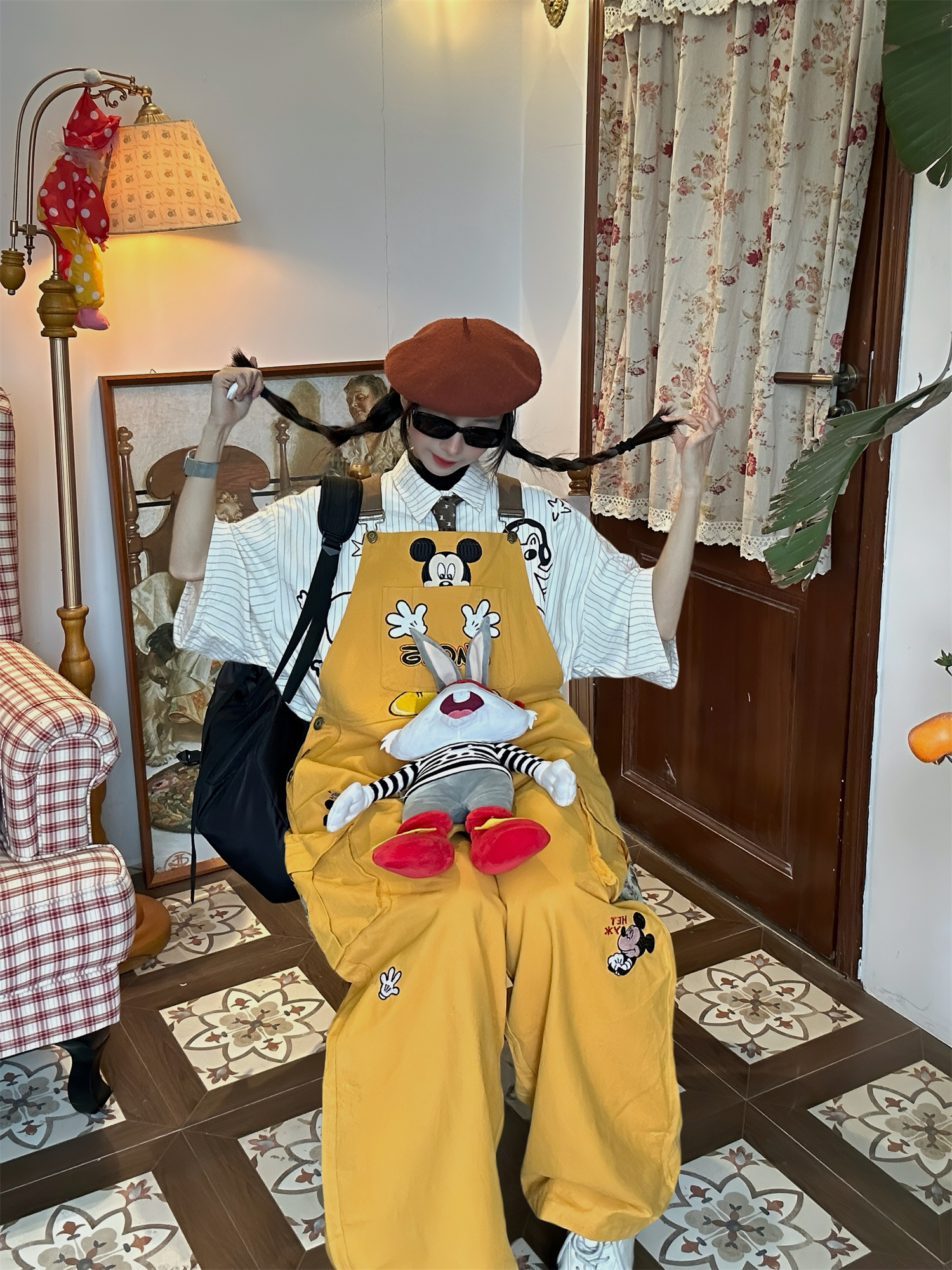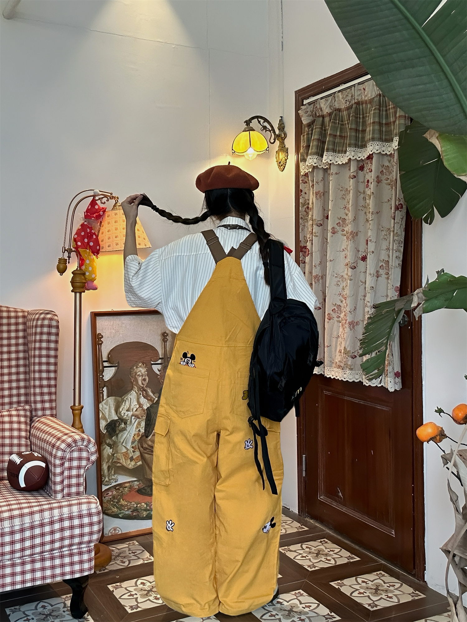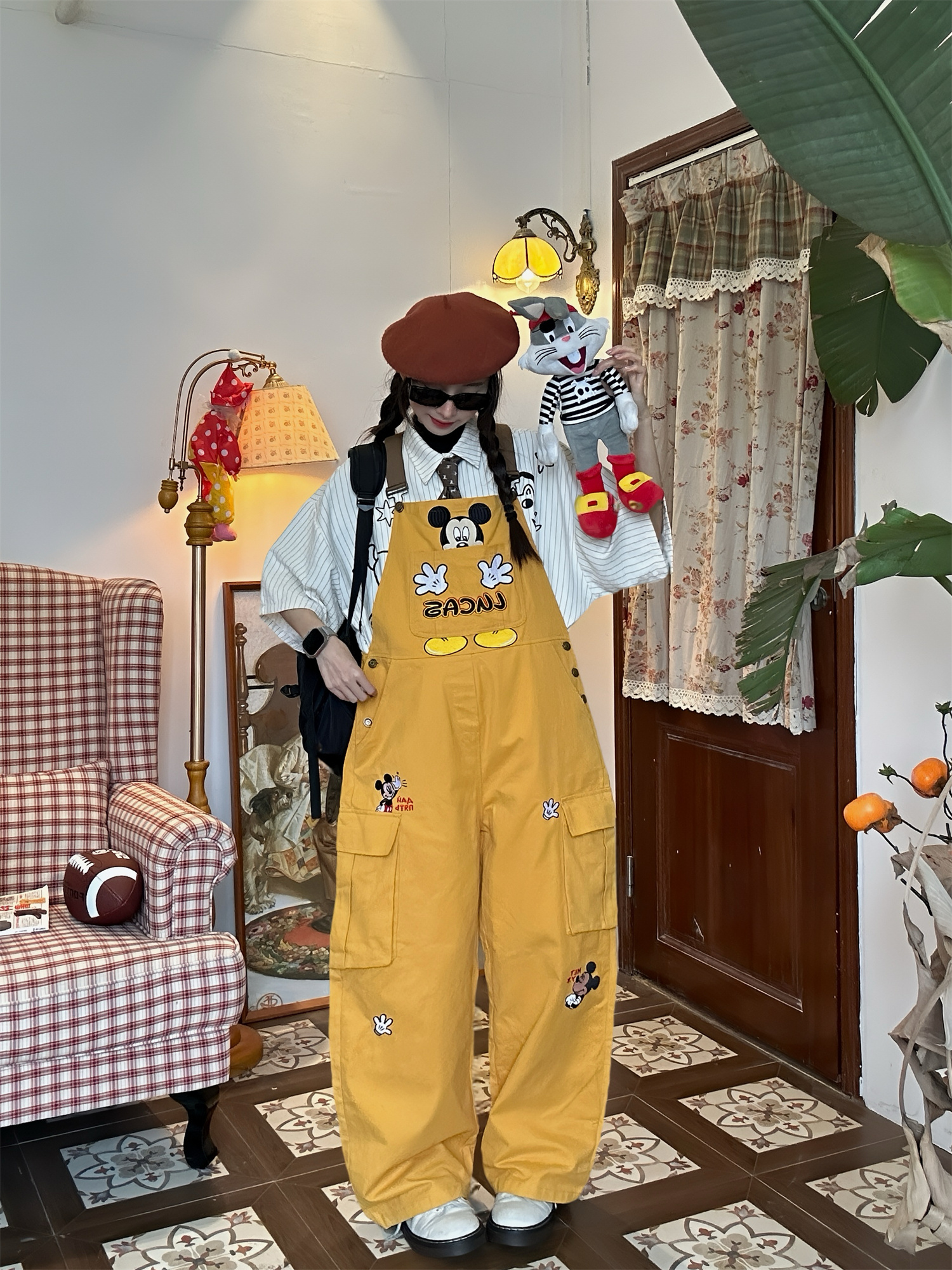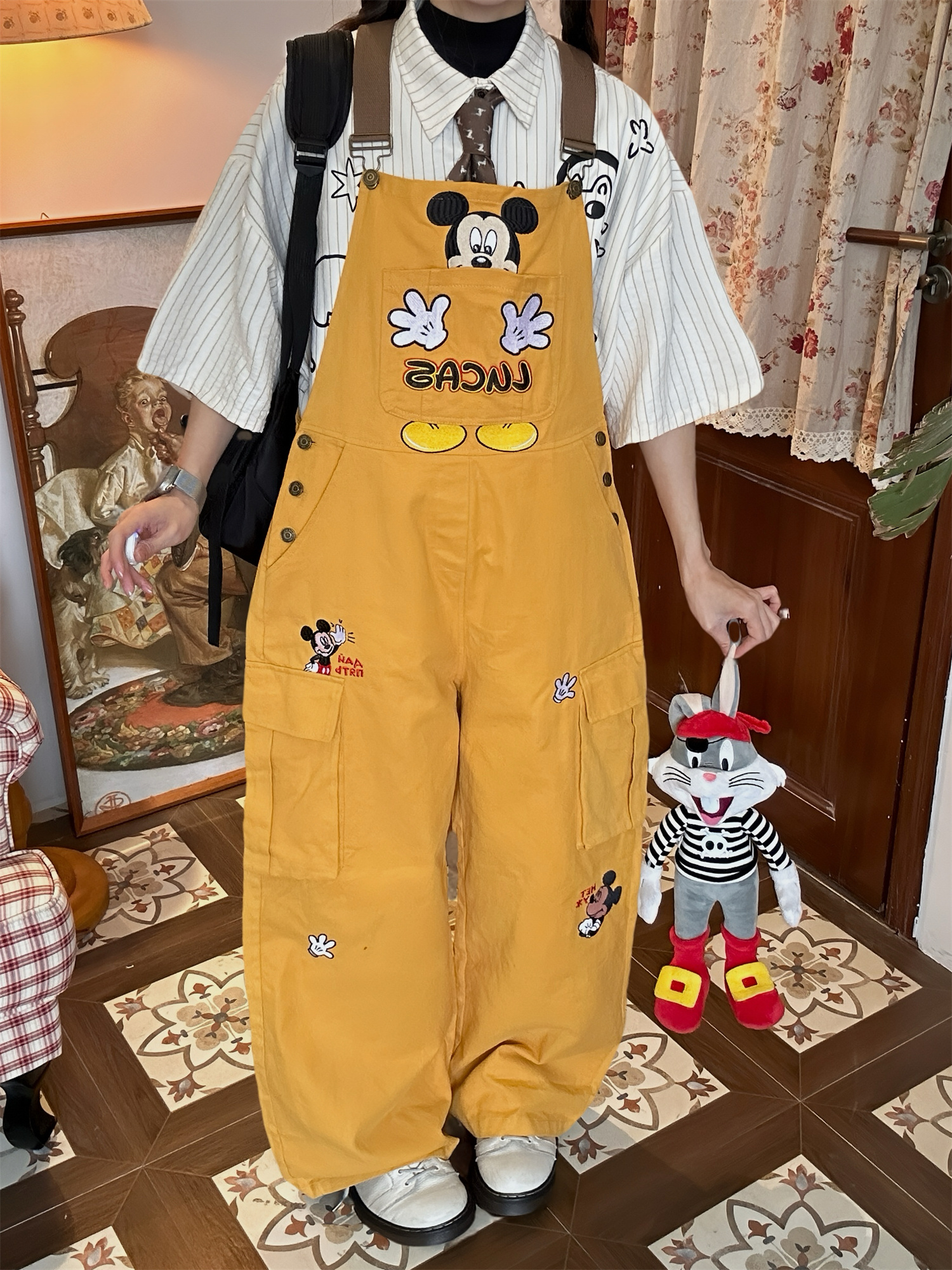 Vintage Mickey Mouse retro casual overalls, loose-fitting boyfriend style, American yellow wide-leg jumpsuit, spring and autumn.