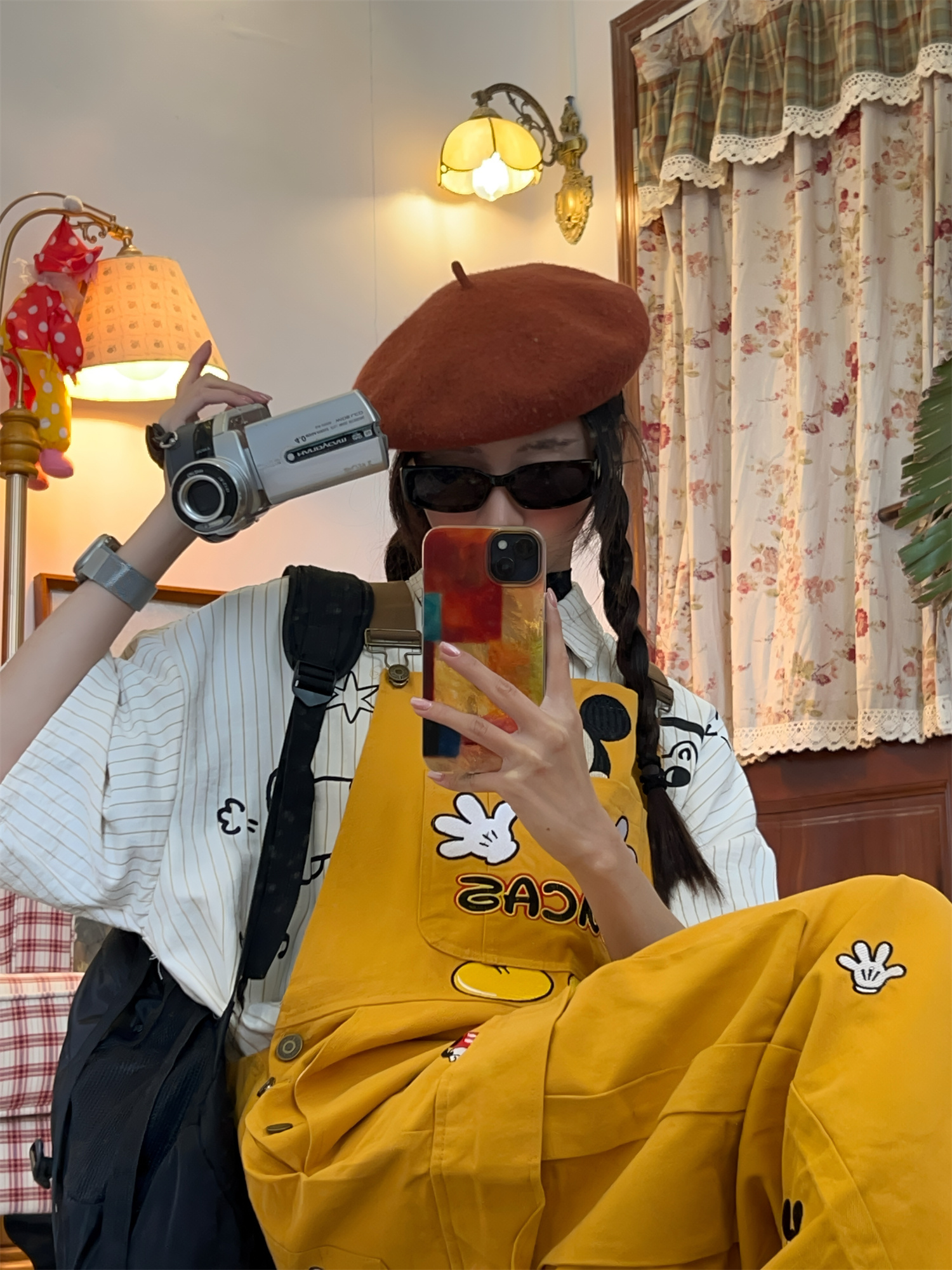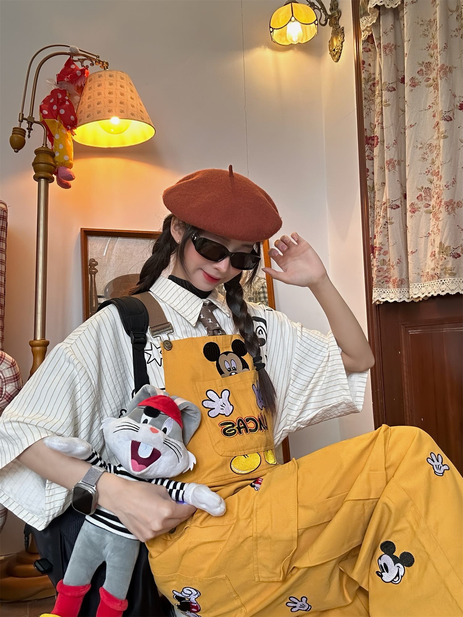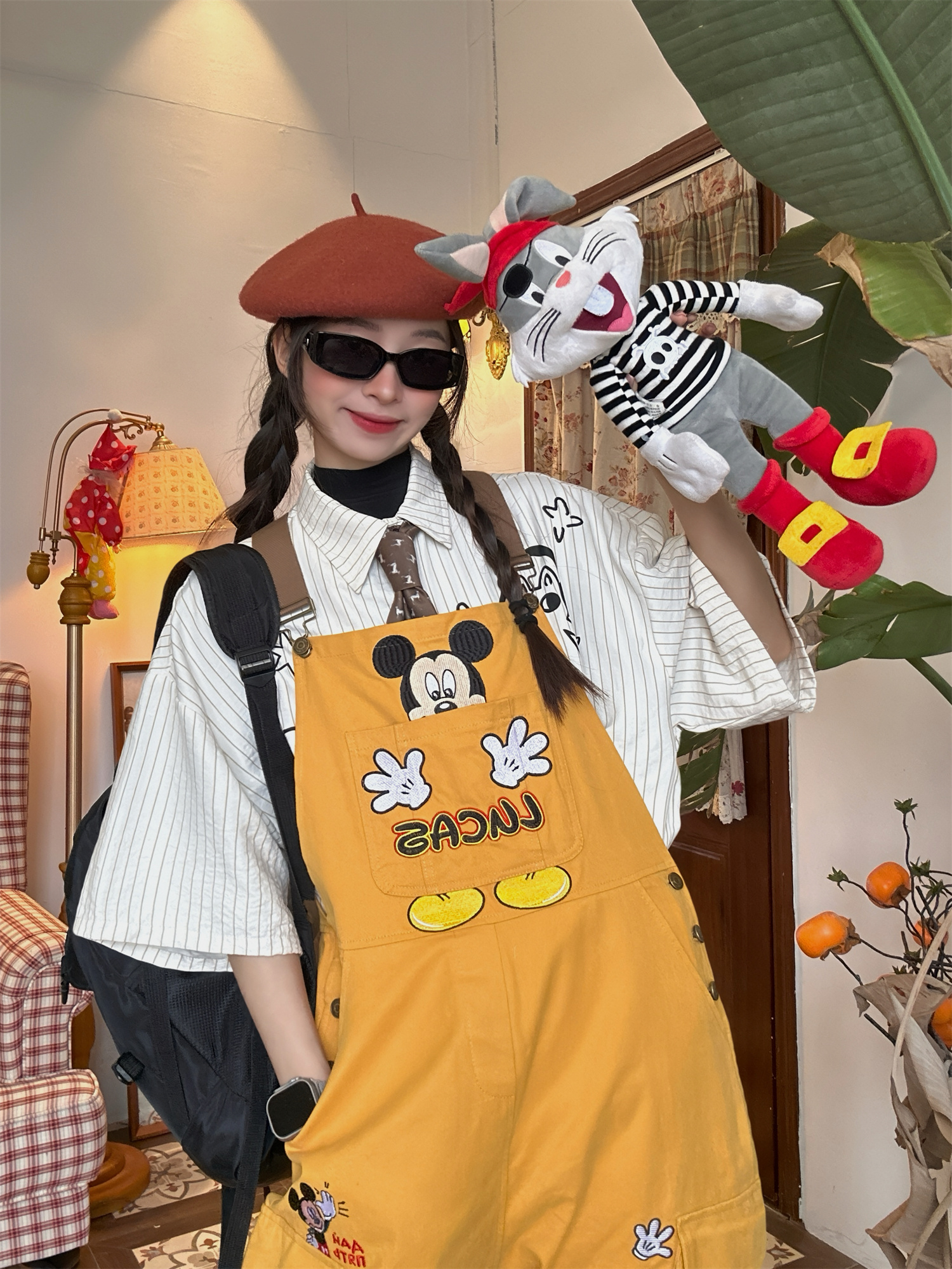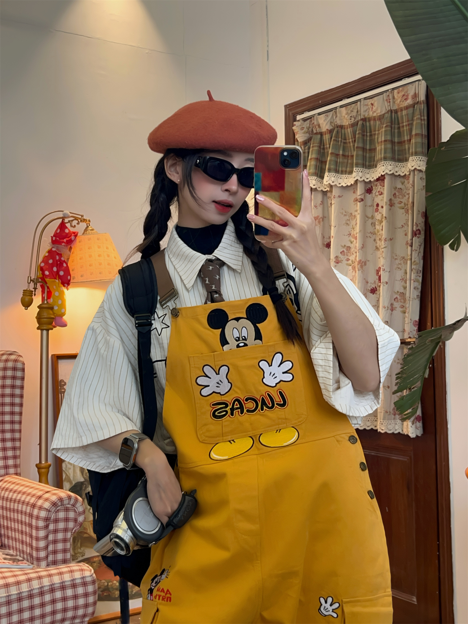 Vintage Mickey Mouse retro casual overalls, loose-fitting boyfriend style, American yellow wide-leg jumpsuit, spring and autumn.