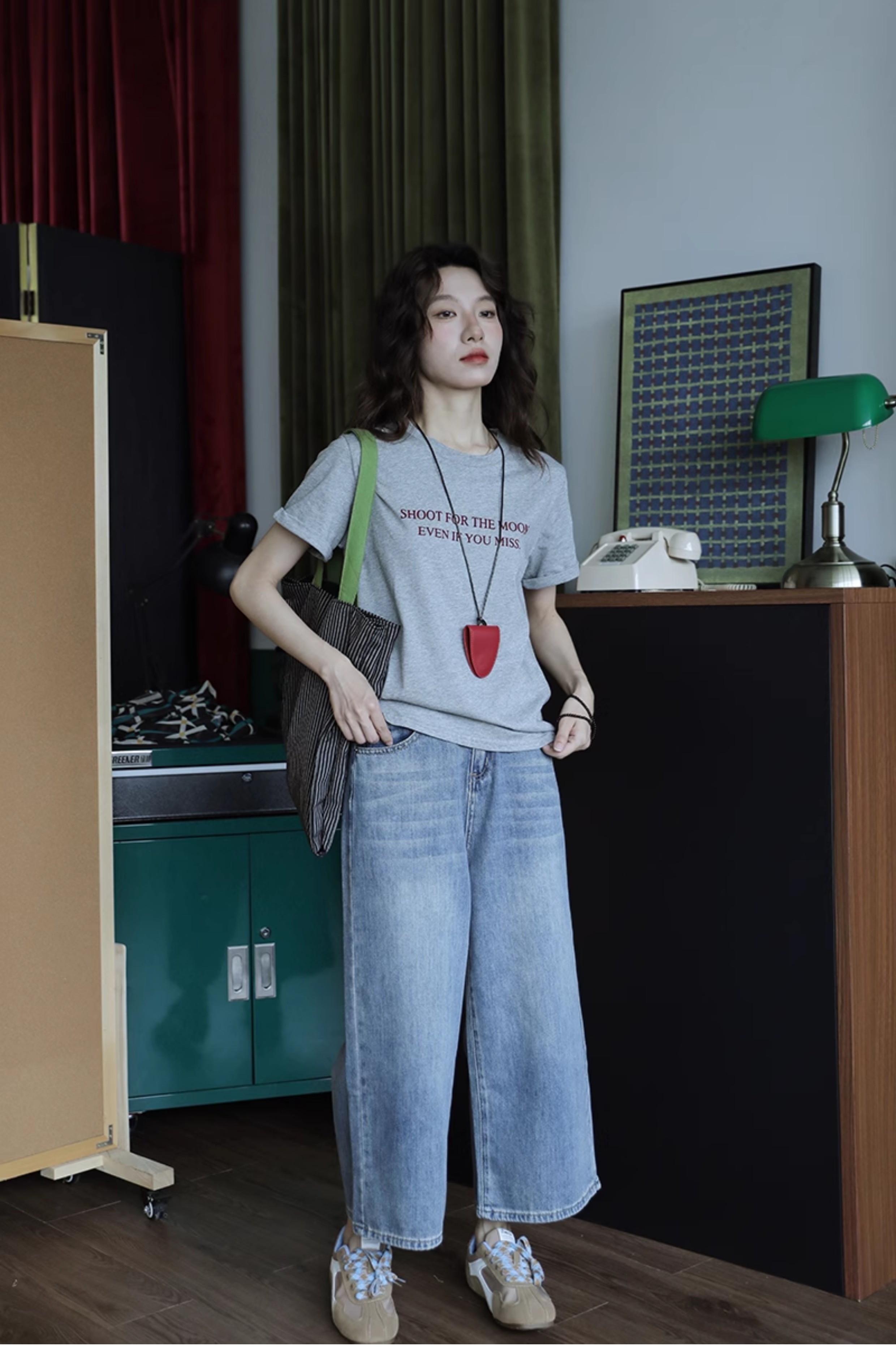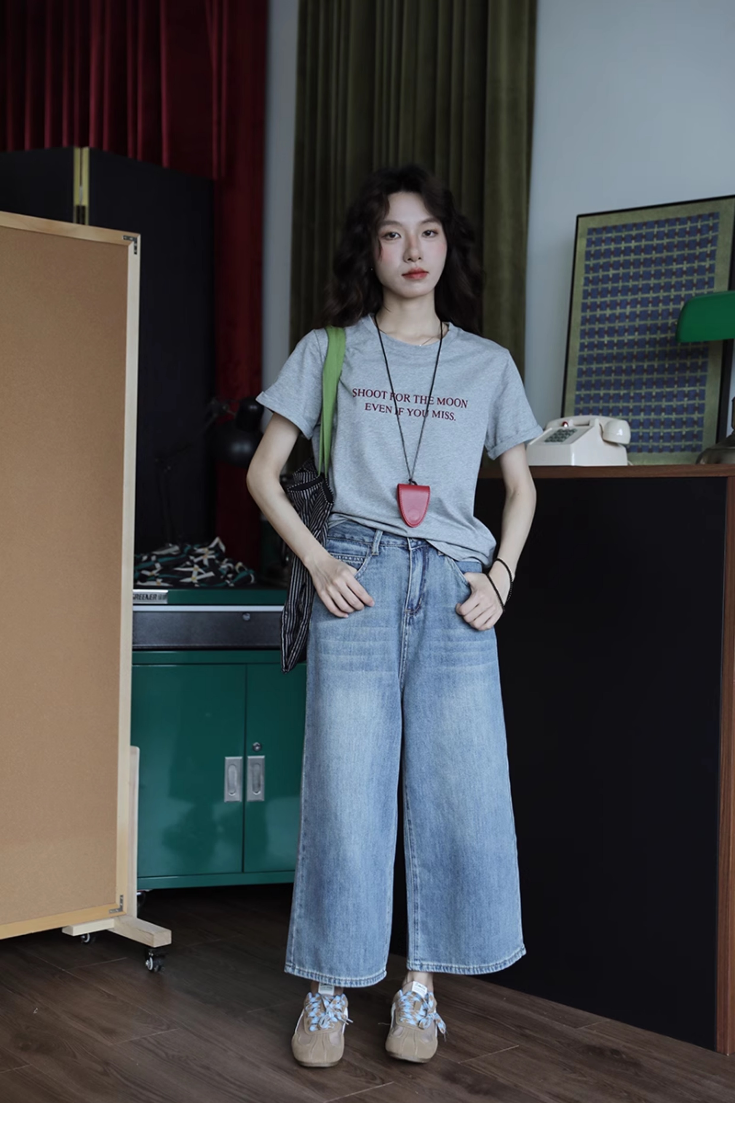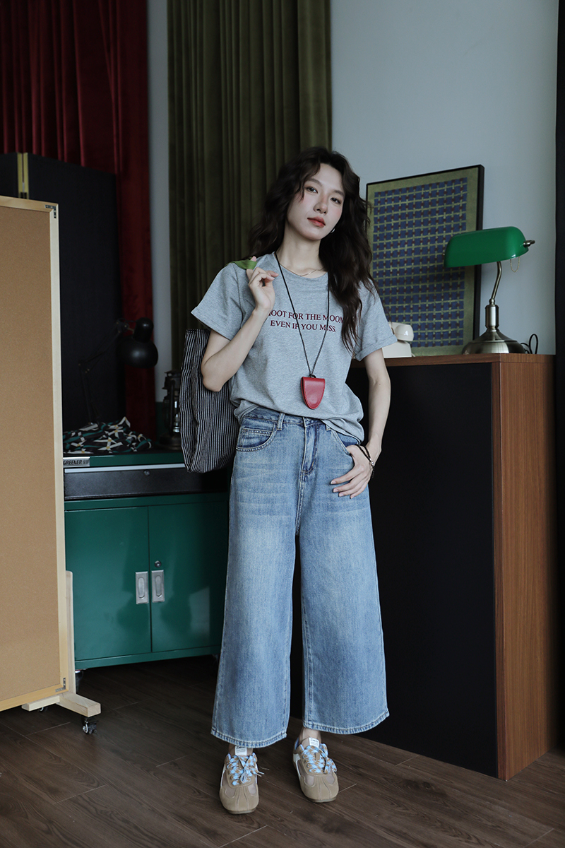 復古九分闊腿牛仔褲女高腰顯瘦直筒休閒褲夏薄款