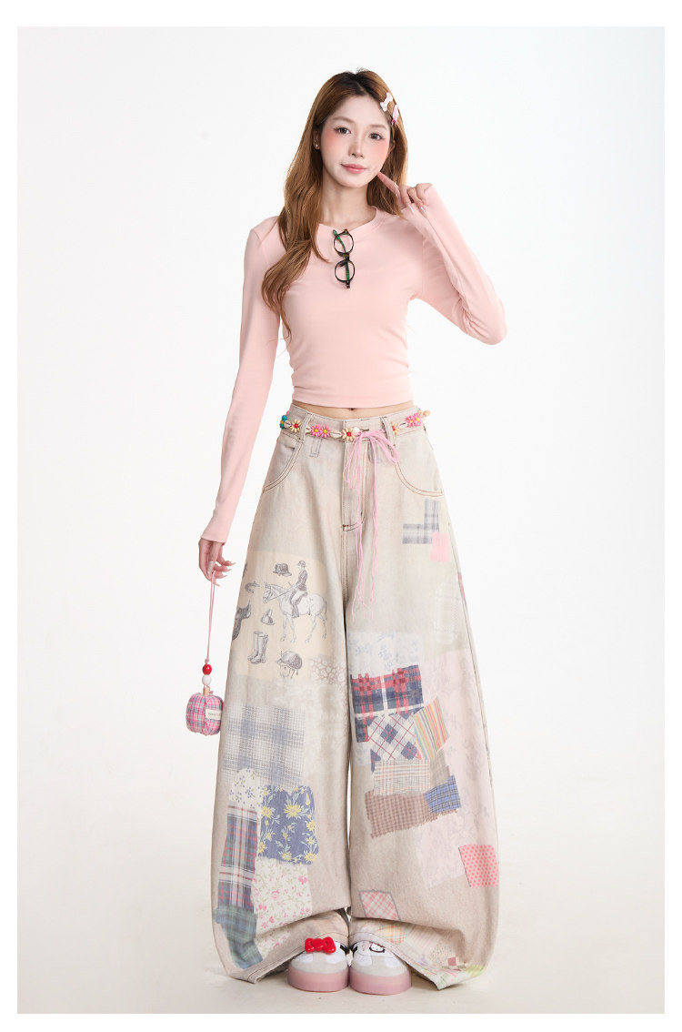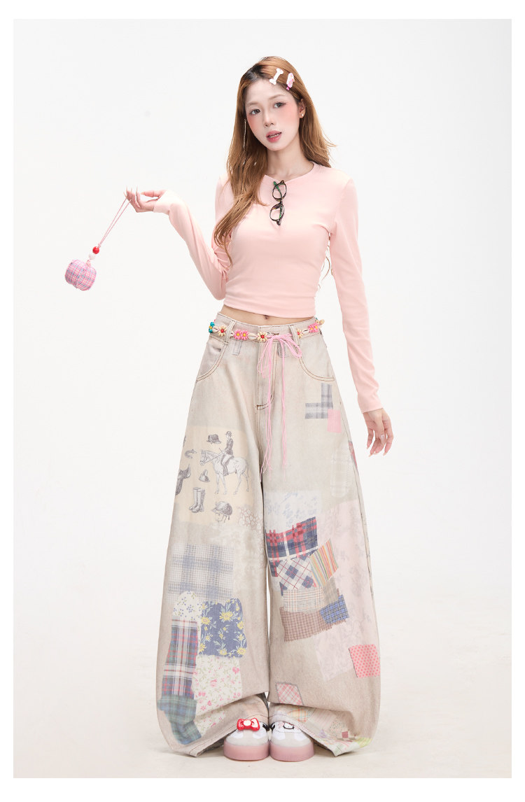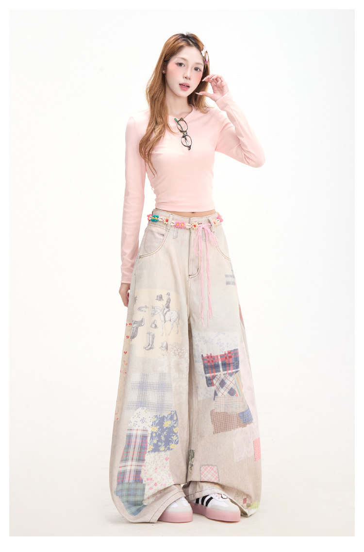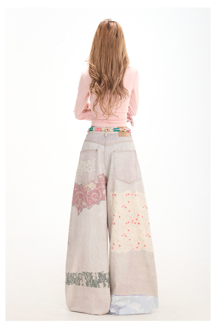 Retro patchwork print denim jeans for women, subculture style, curved wide-leg pants, street casual pants