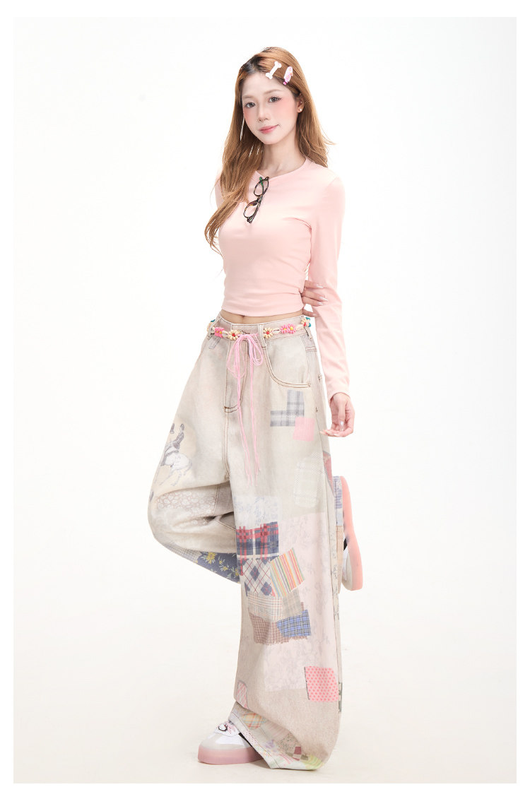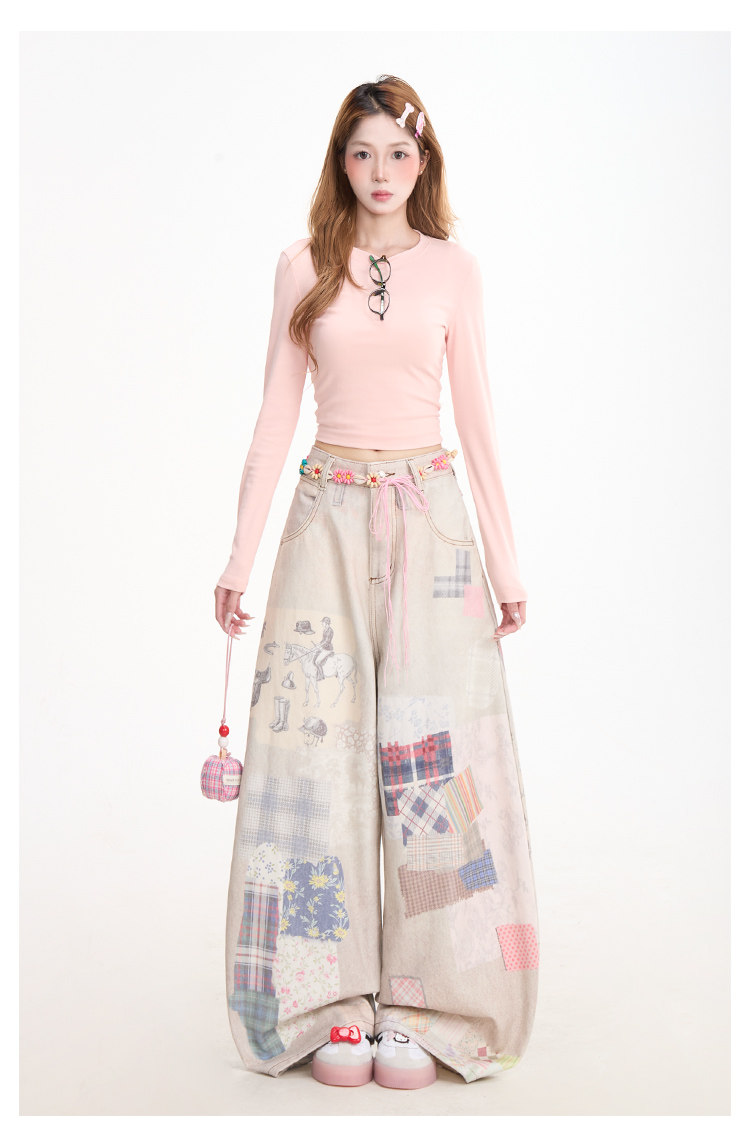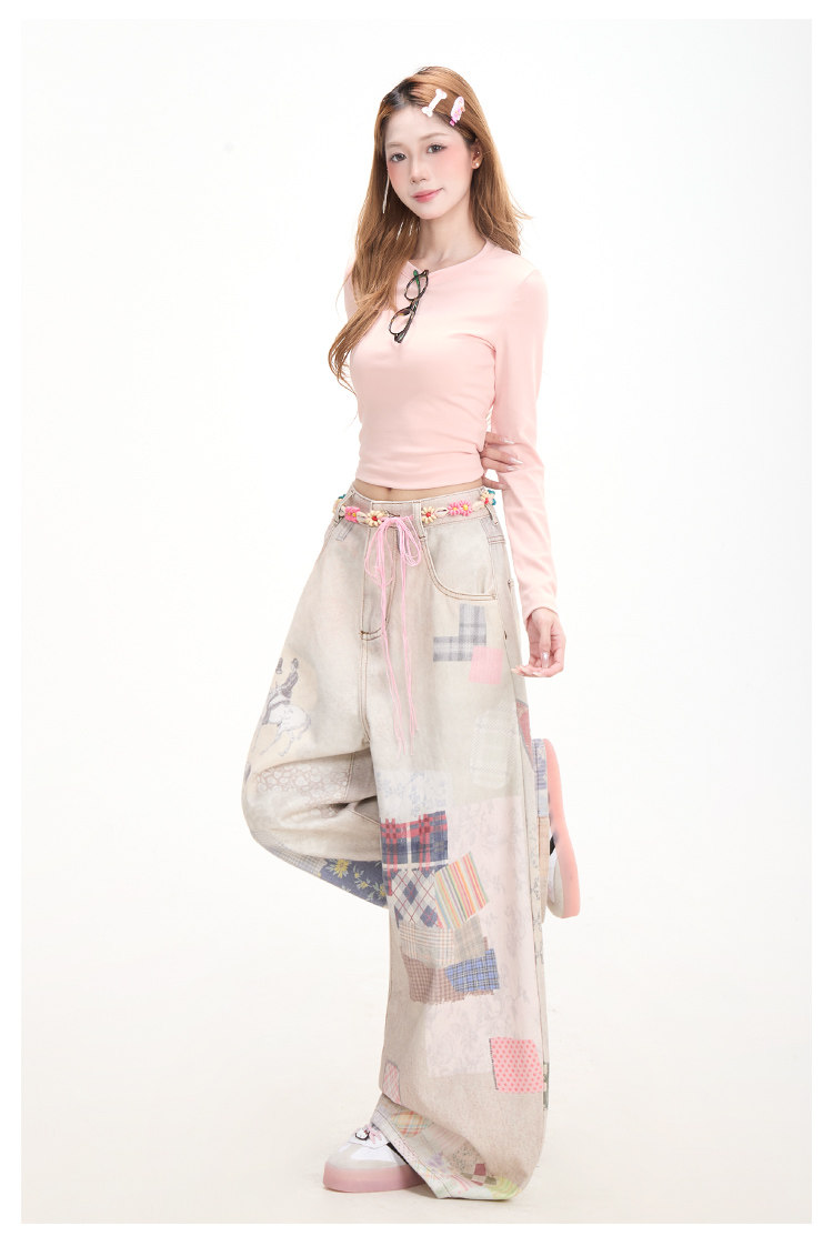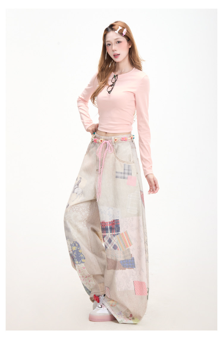 Retro patchwork print denim jeans for women, subculture style, curved wide-leg pants, street casual pants