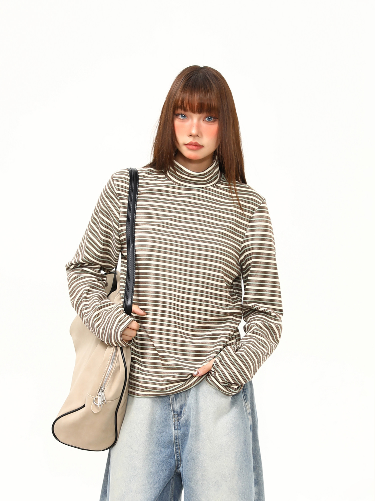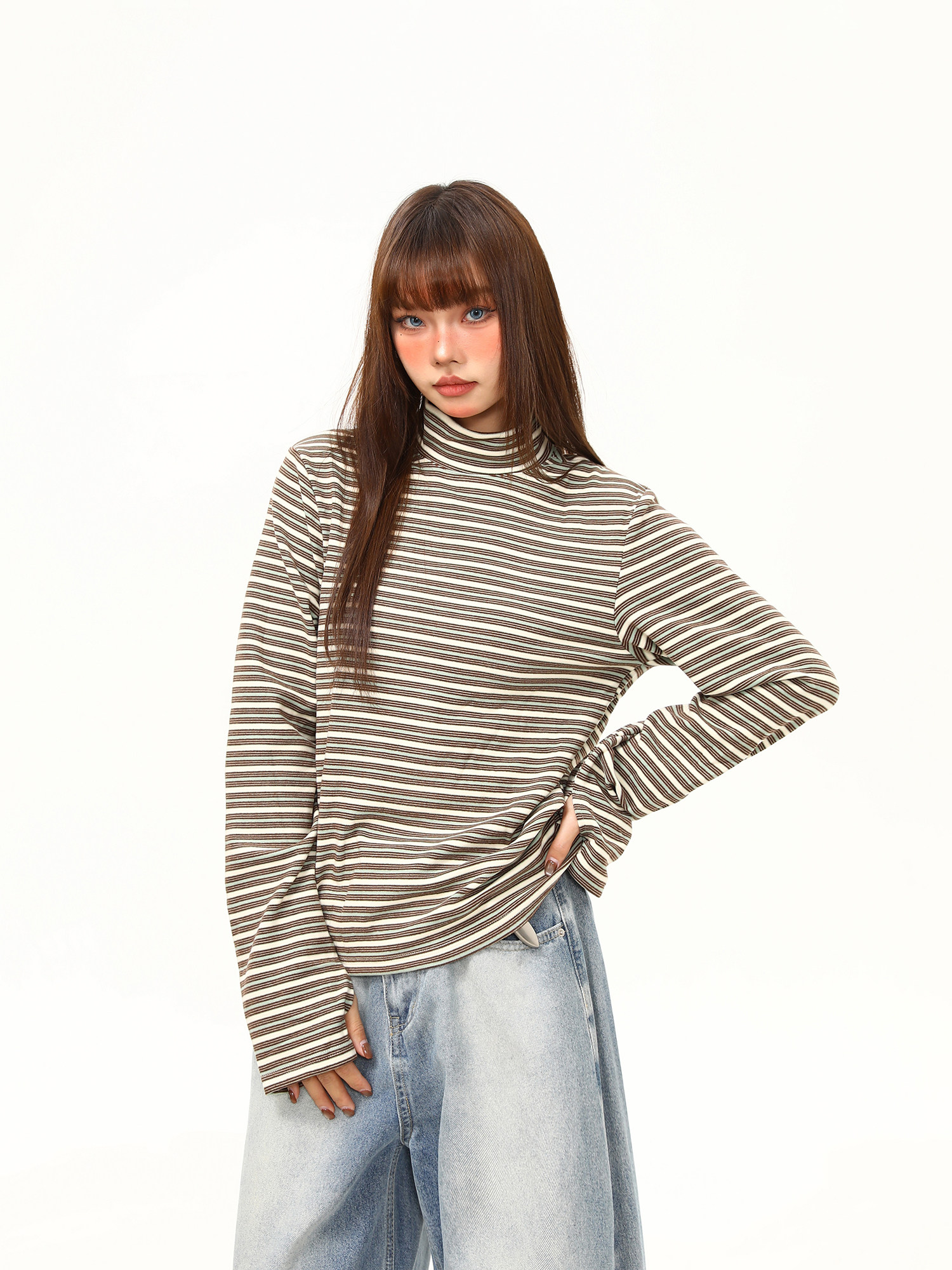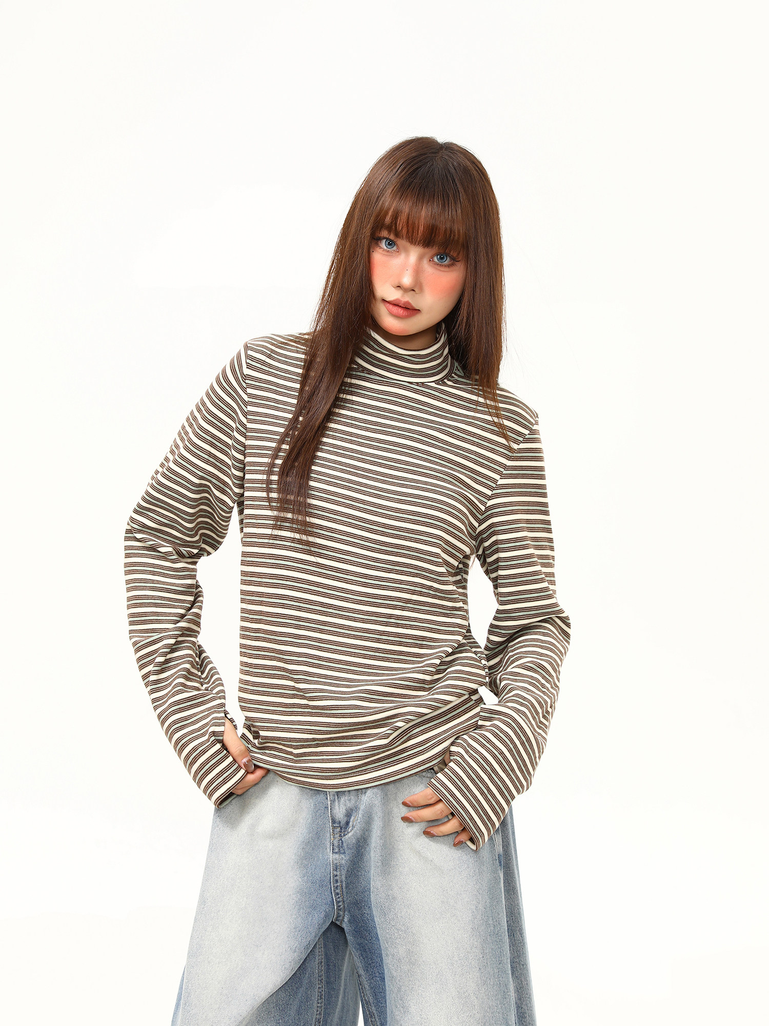 德绒半高领冬季保暖打底衫女短宽版型高级感内搭条纹长袖