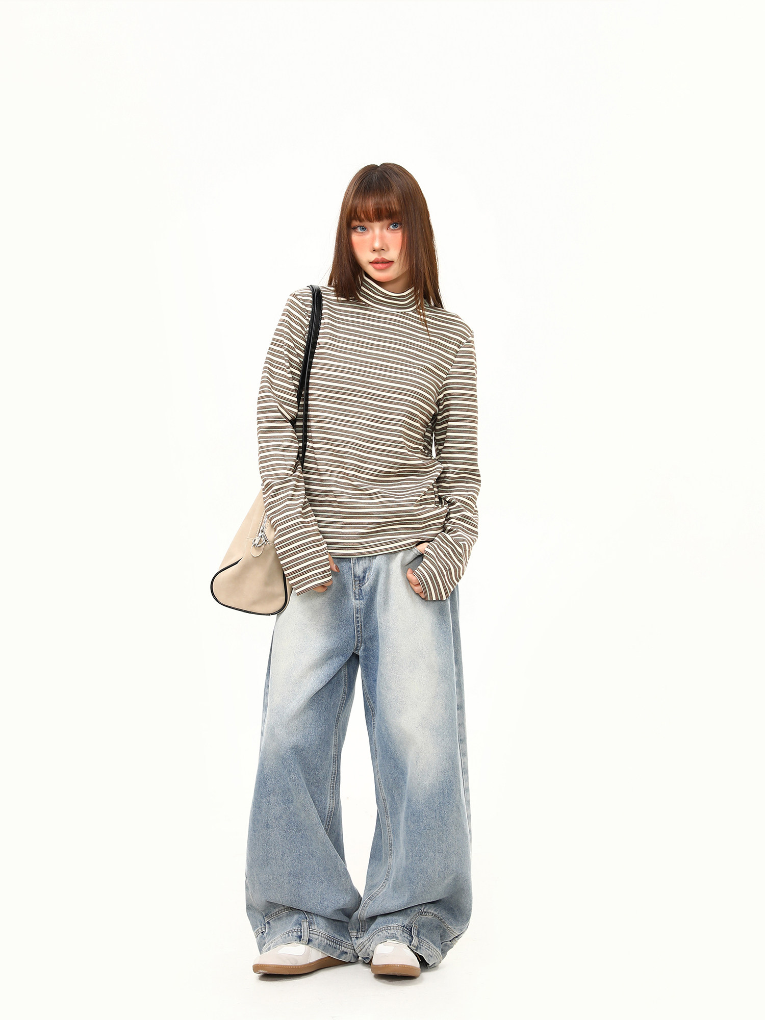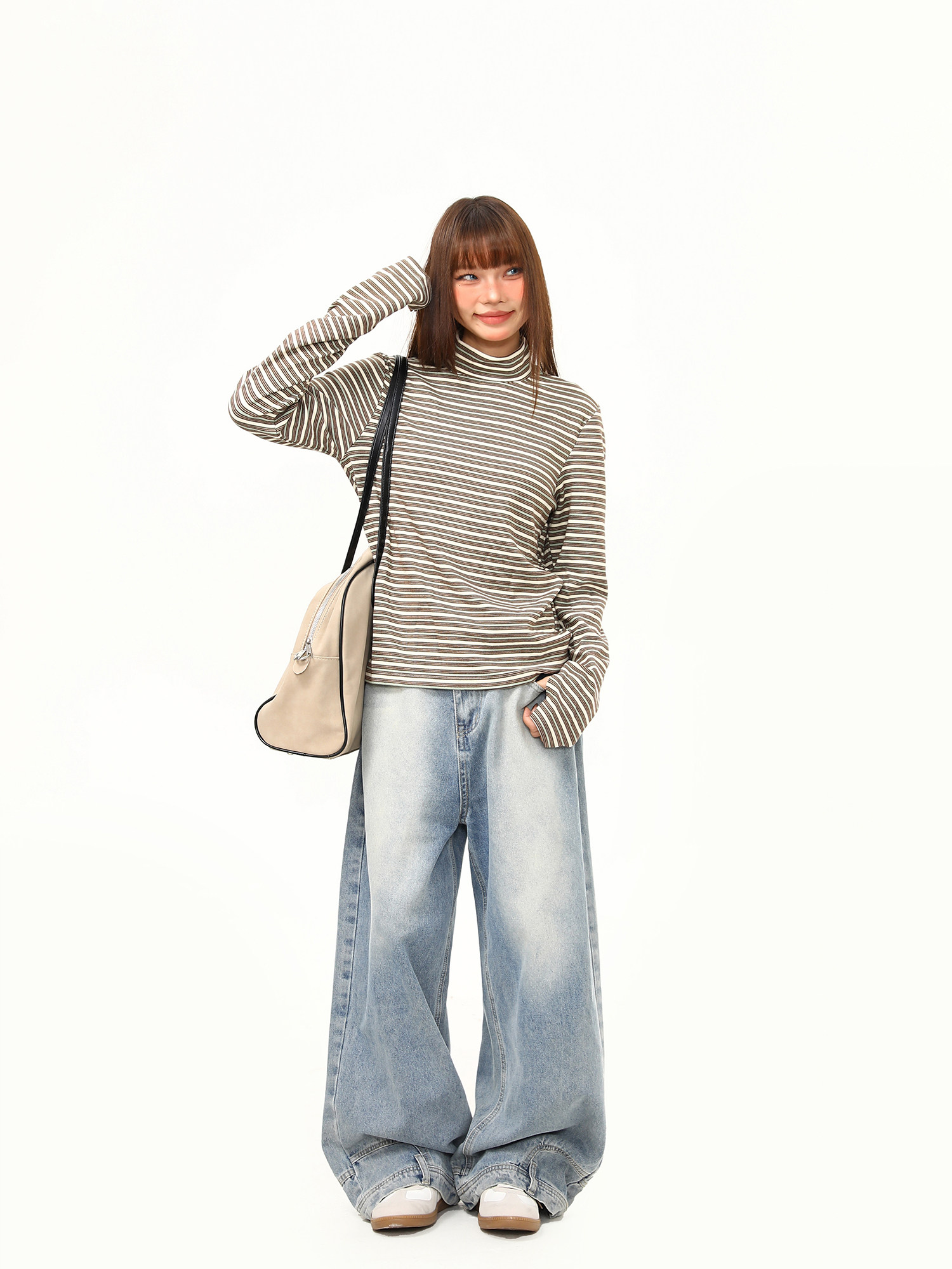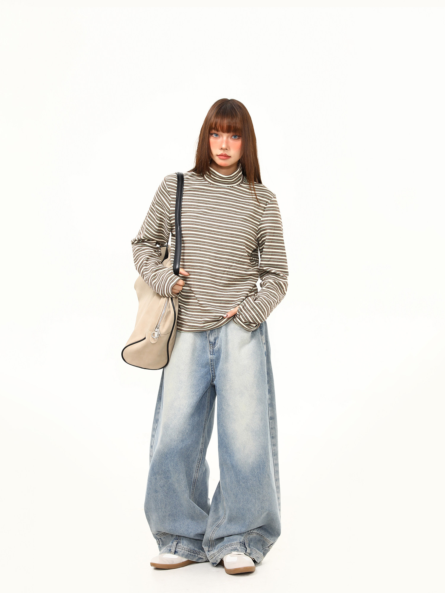 德绒半高领冬季保暖打底衫女短宽版型高级感内搭条纹长袖