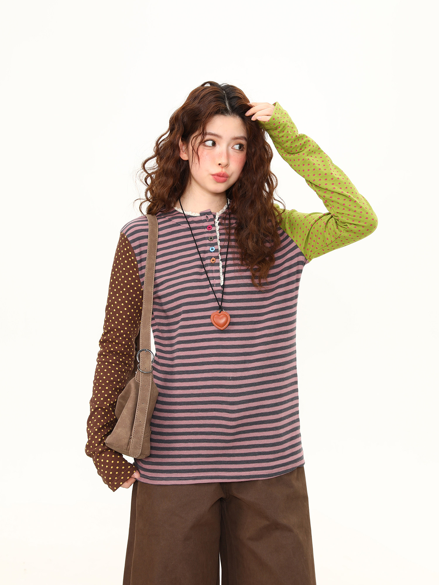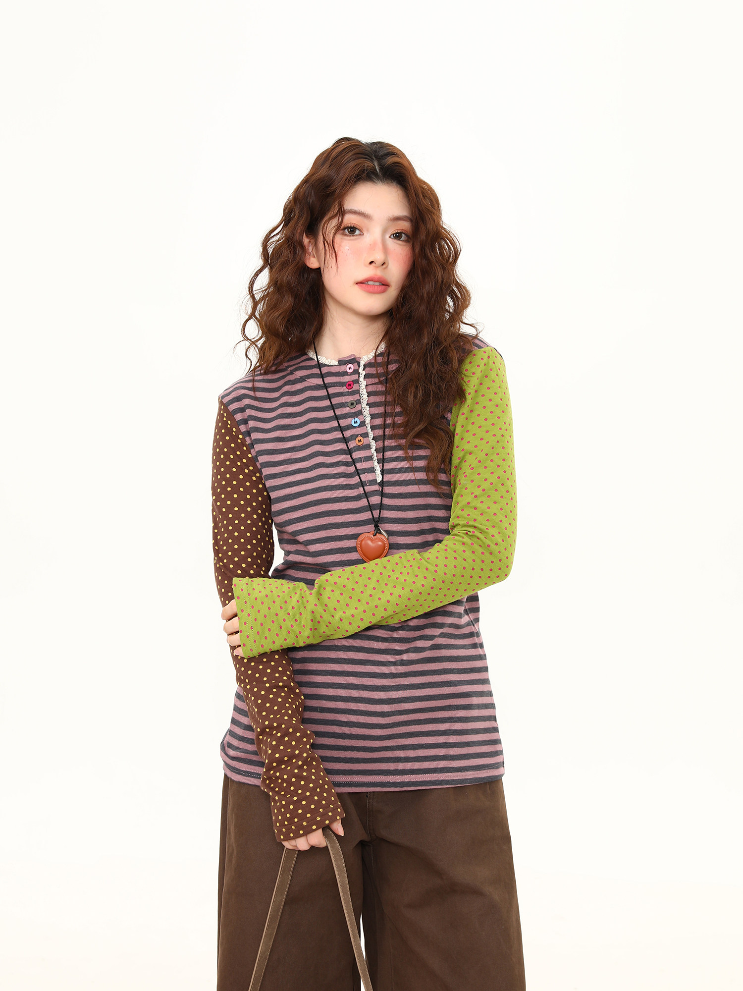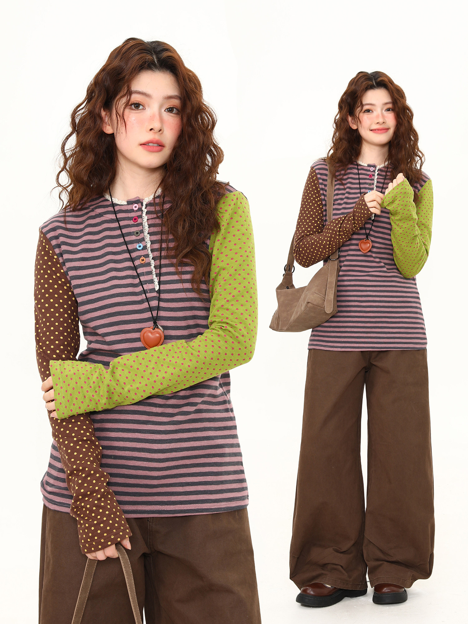 Spring New Arrival Polka Dot Lace Trim Long-Sleeve T-Shirt for Women, Short Loose Fit, Versatile