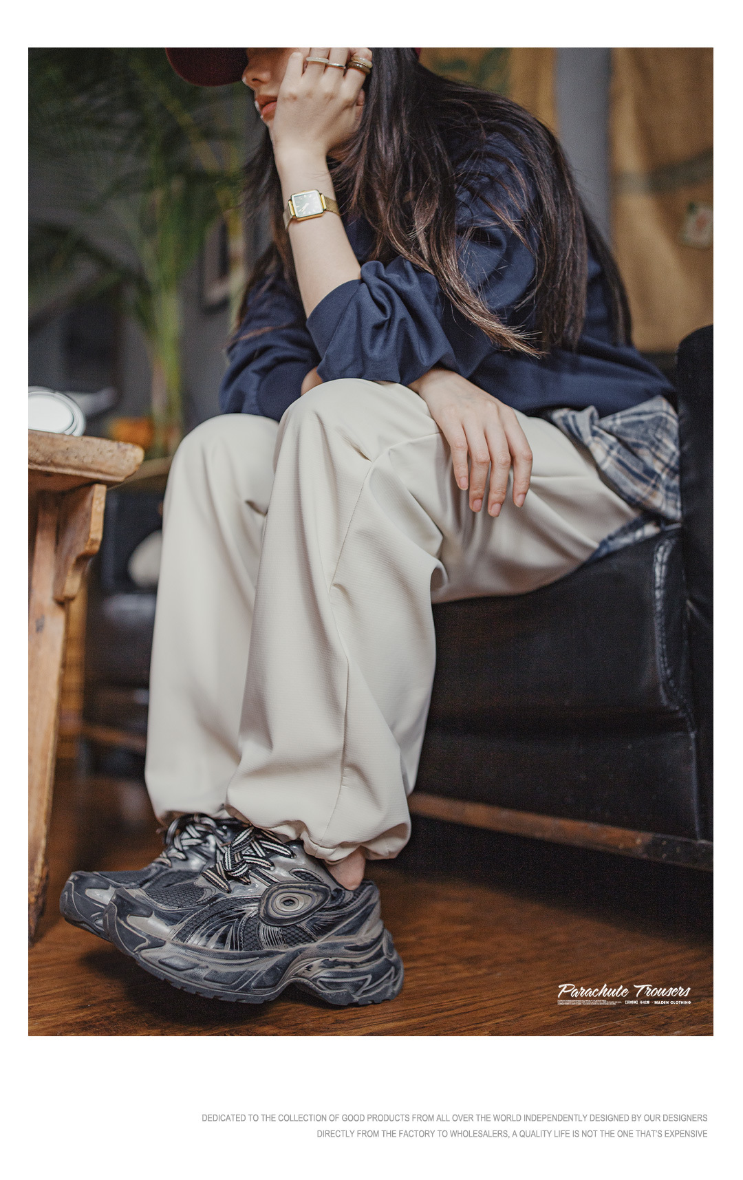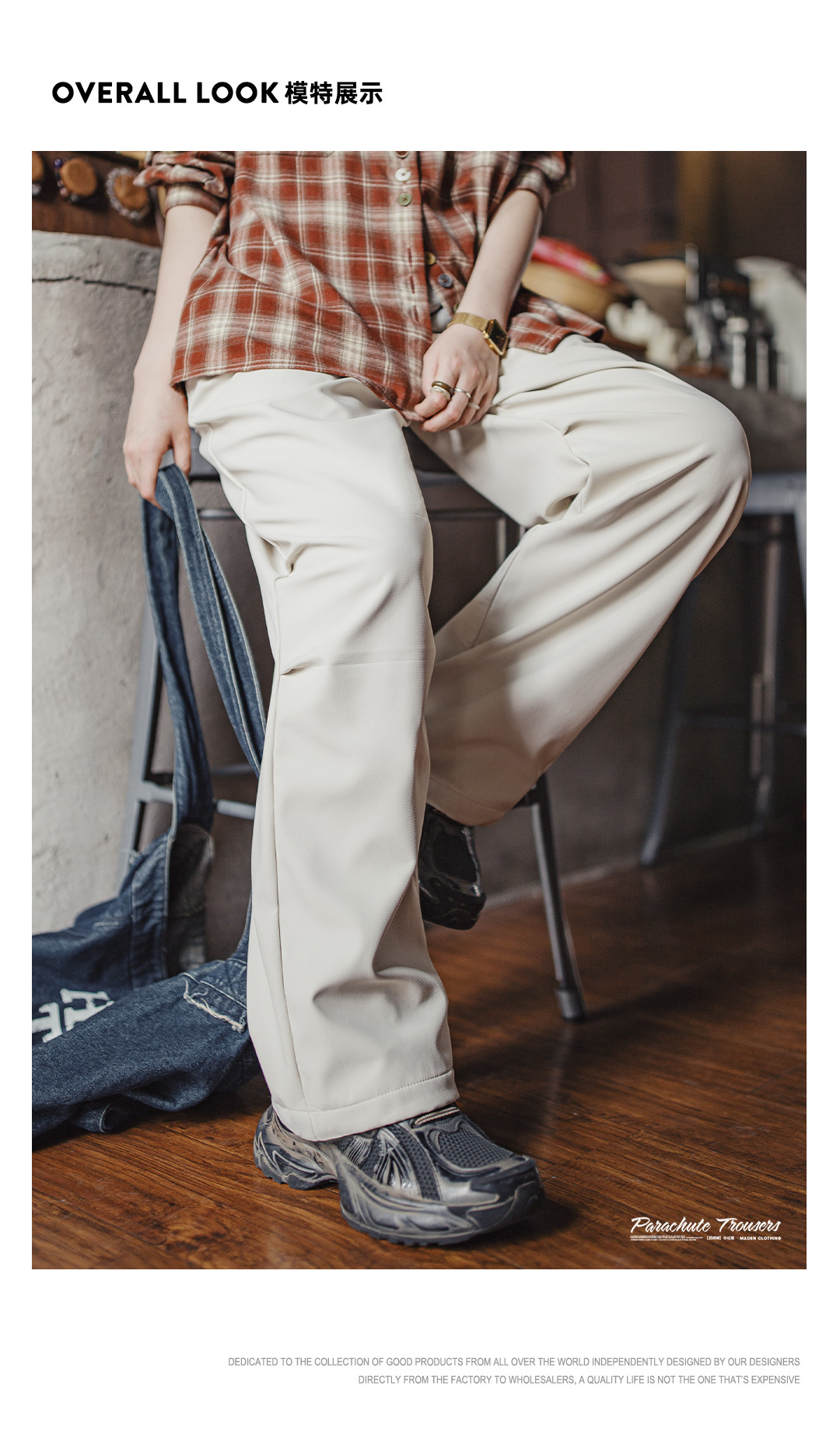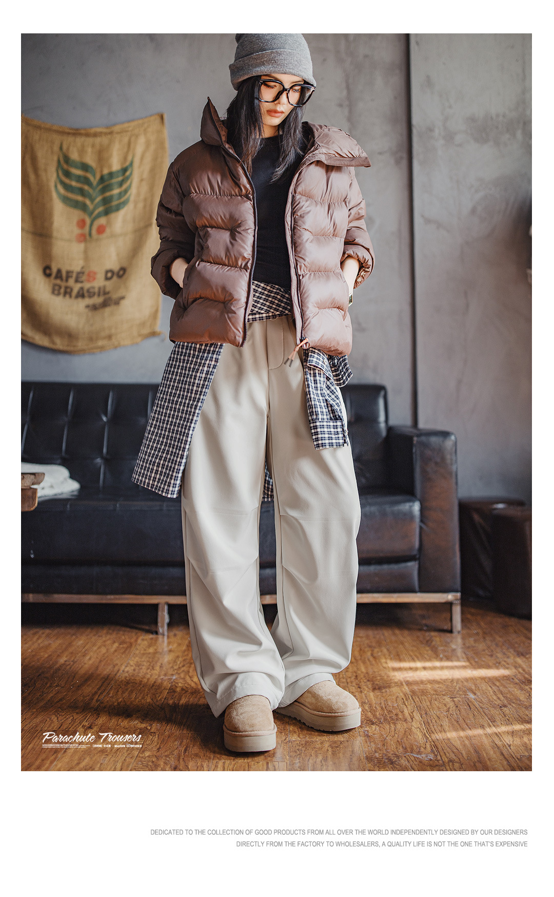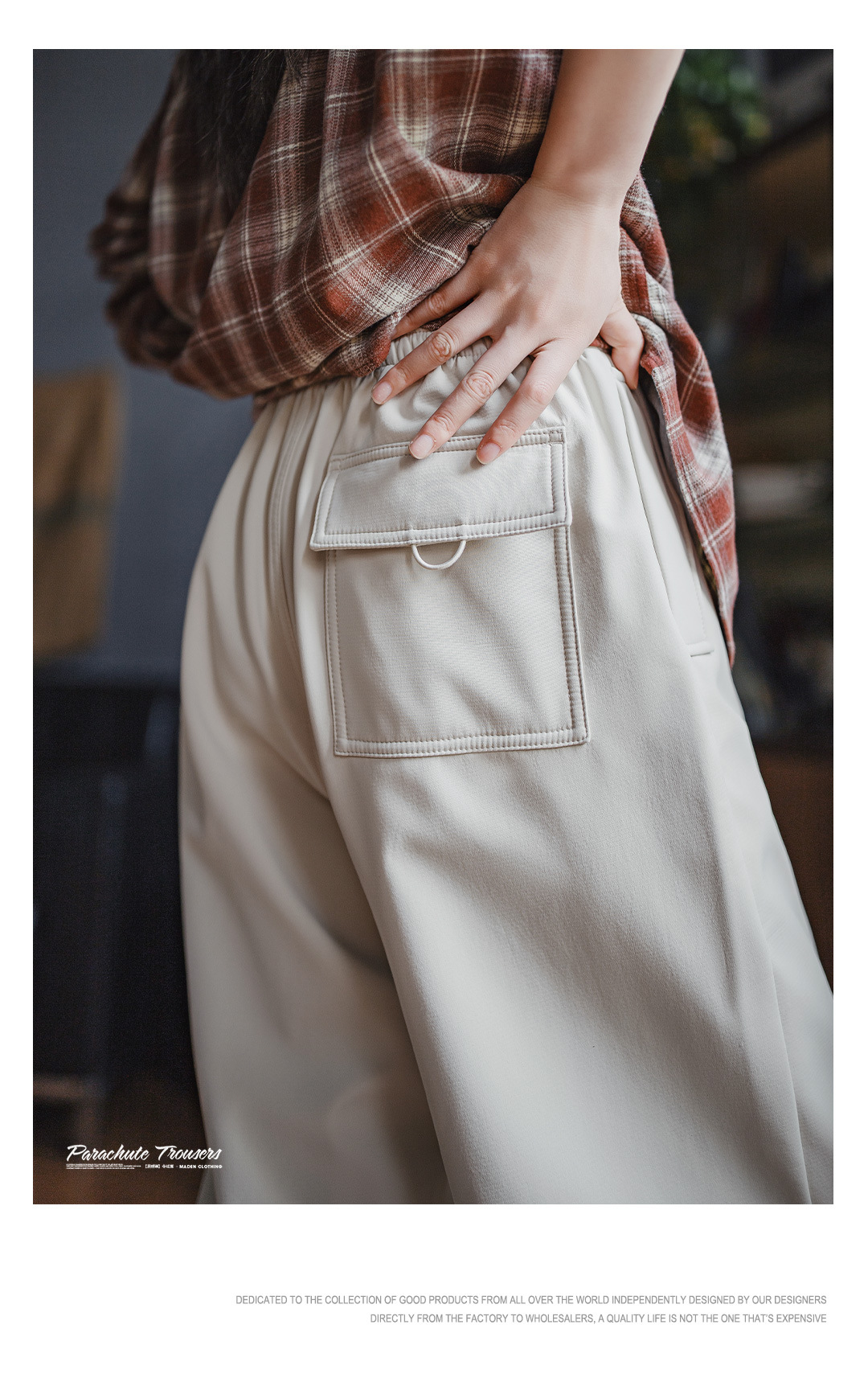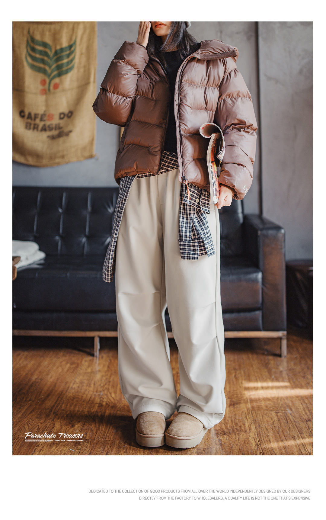 米白色加絨厚實保暖休閒褶皺工裝傘兵直筒闊腿長褲子女士秋冬