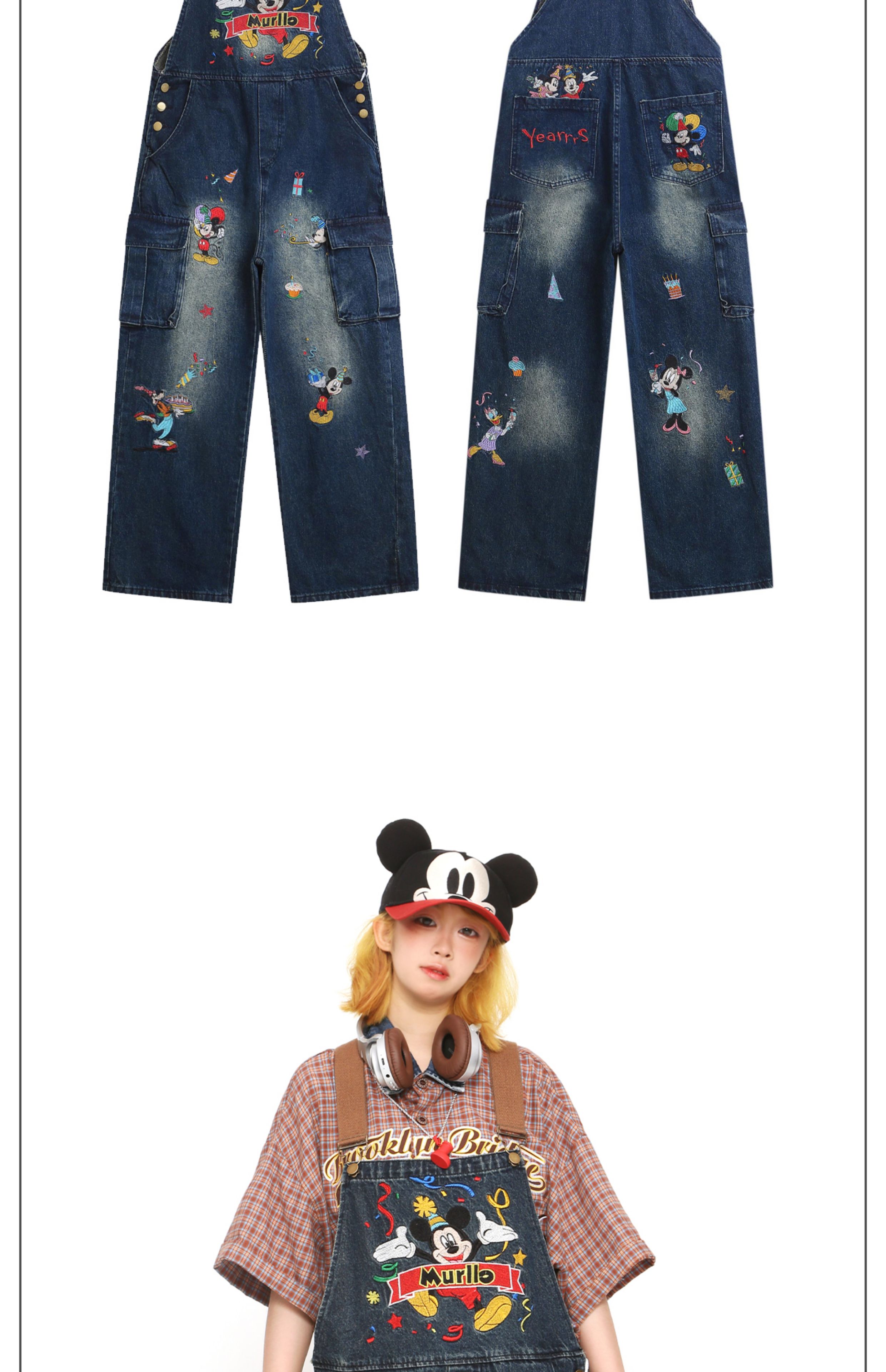 American-style cartoon Mickey Mouse embroidered overalls for women, loose-fitting Vibe jumpsuit floor-length jeans for summer.
