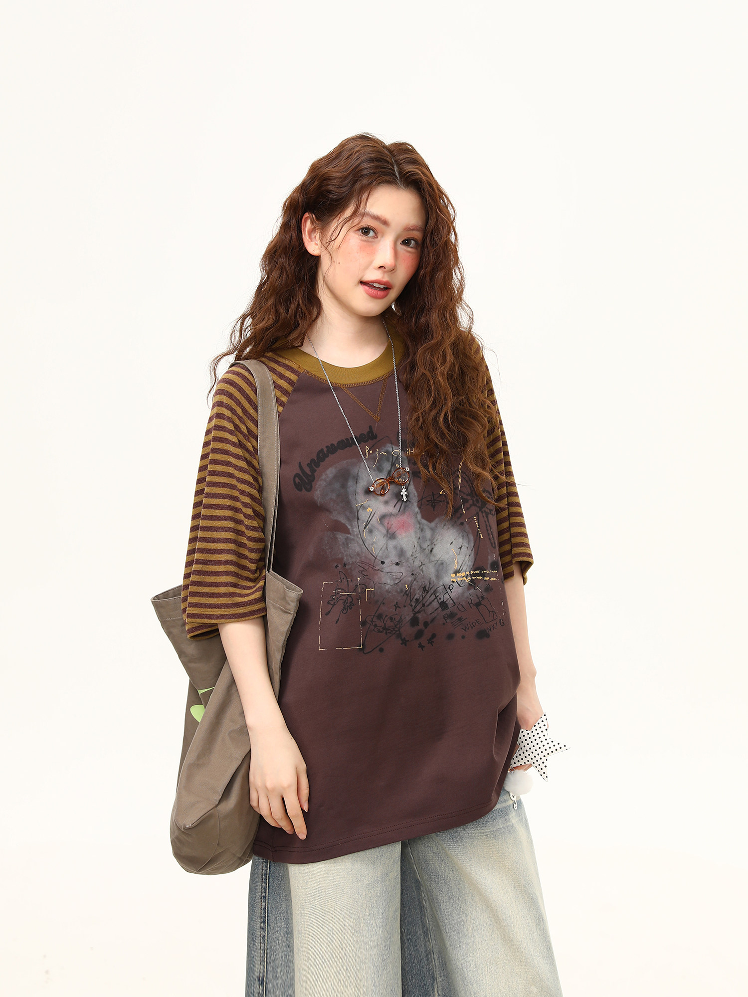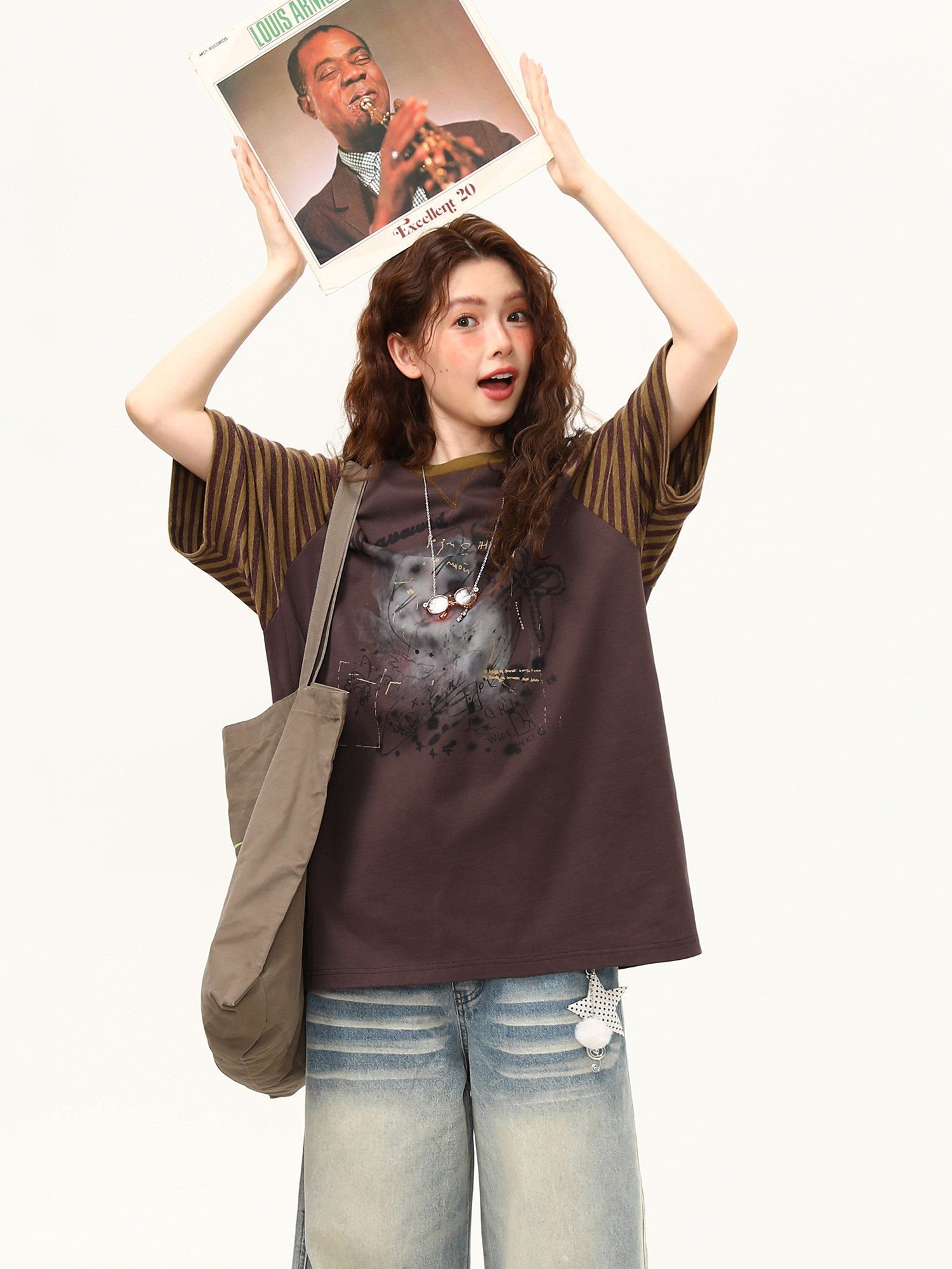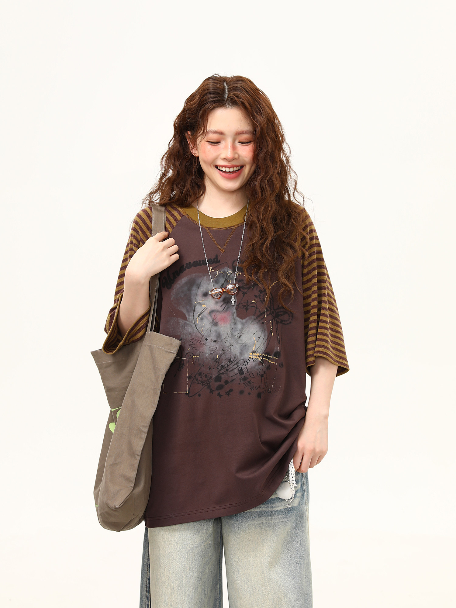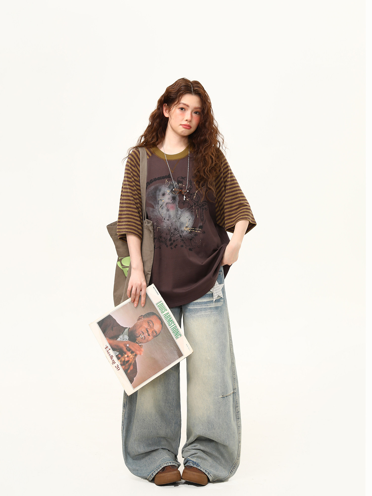 American retro graffiti puppy print short-sleeved T-shirt for women, loose fit, raglan sleeves