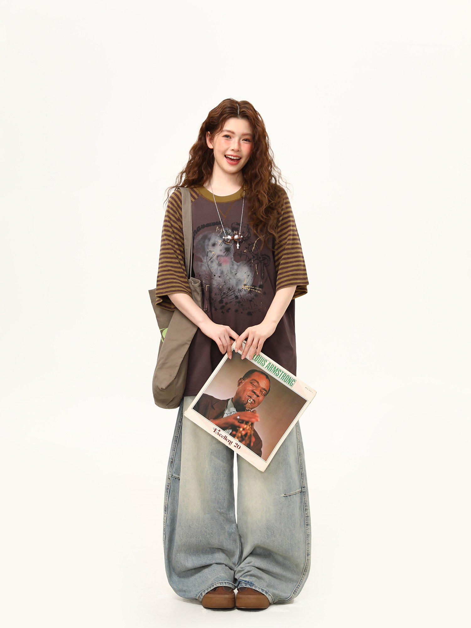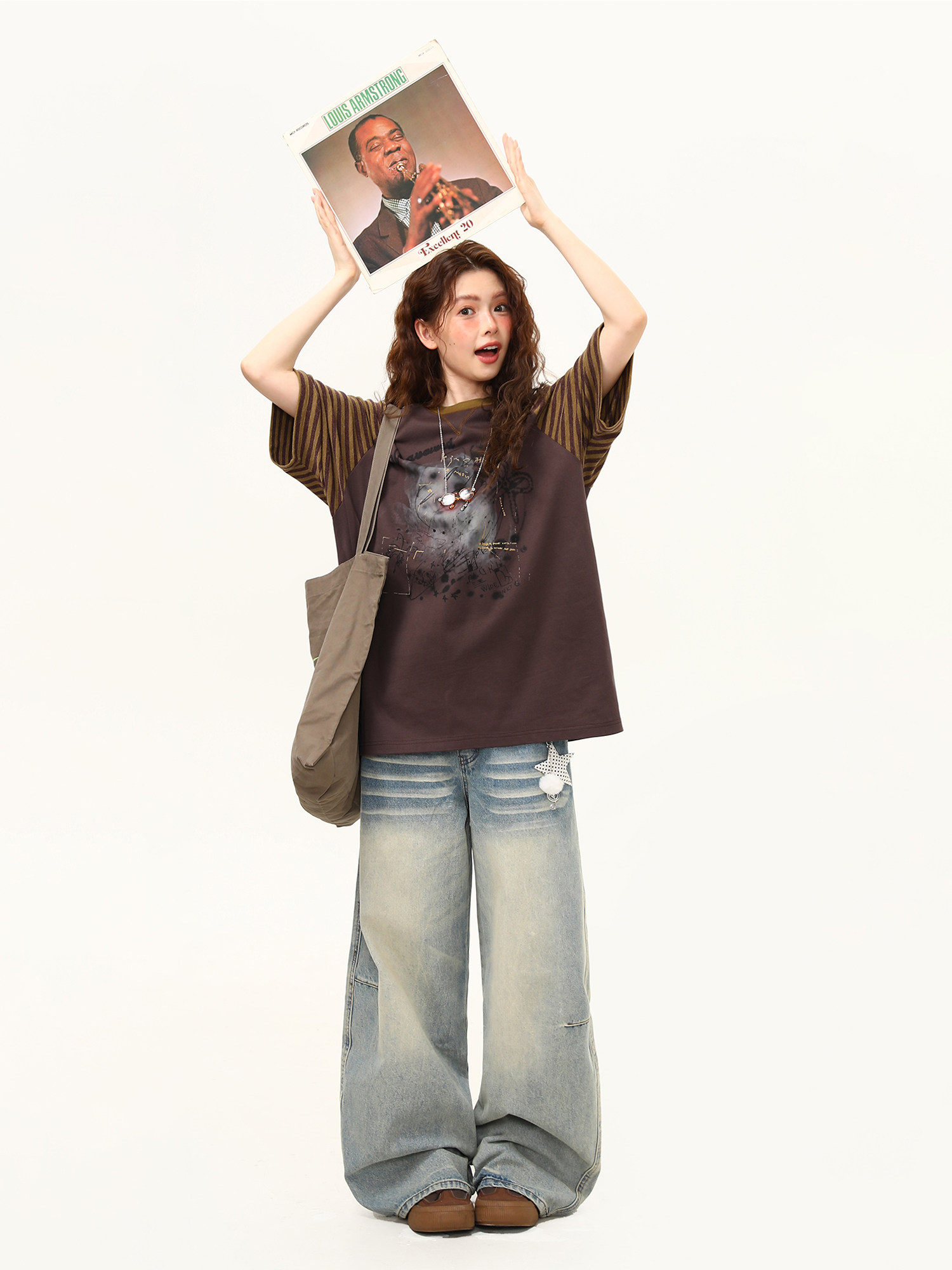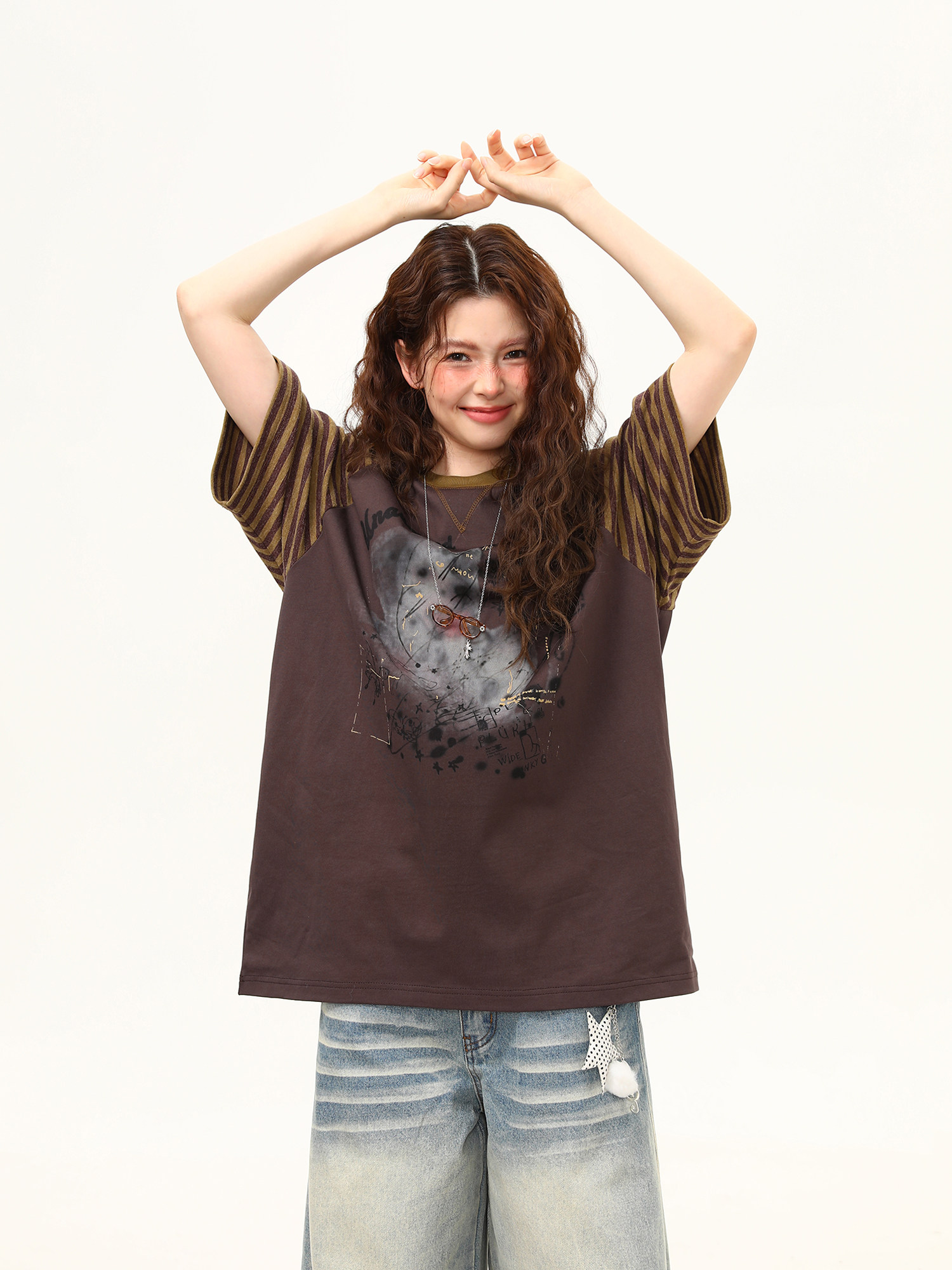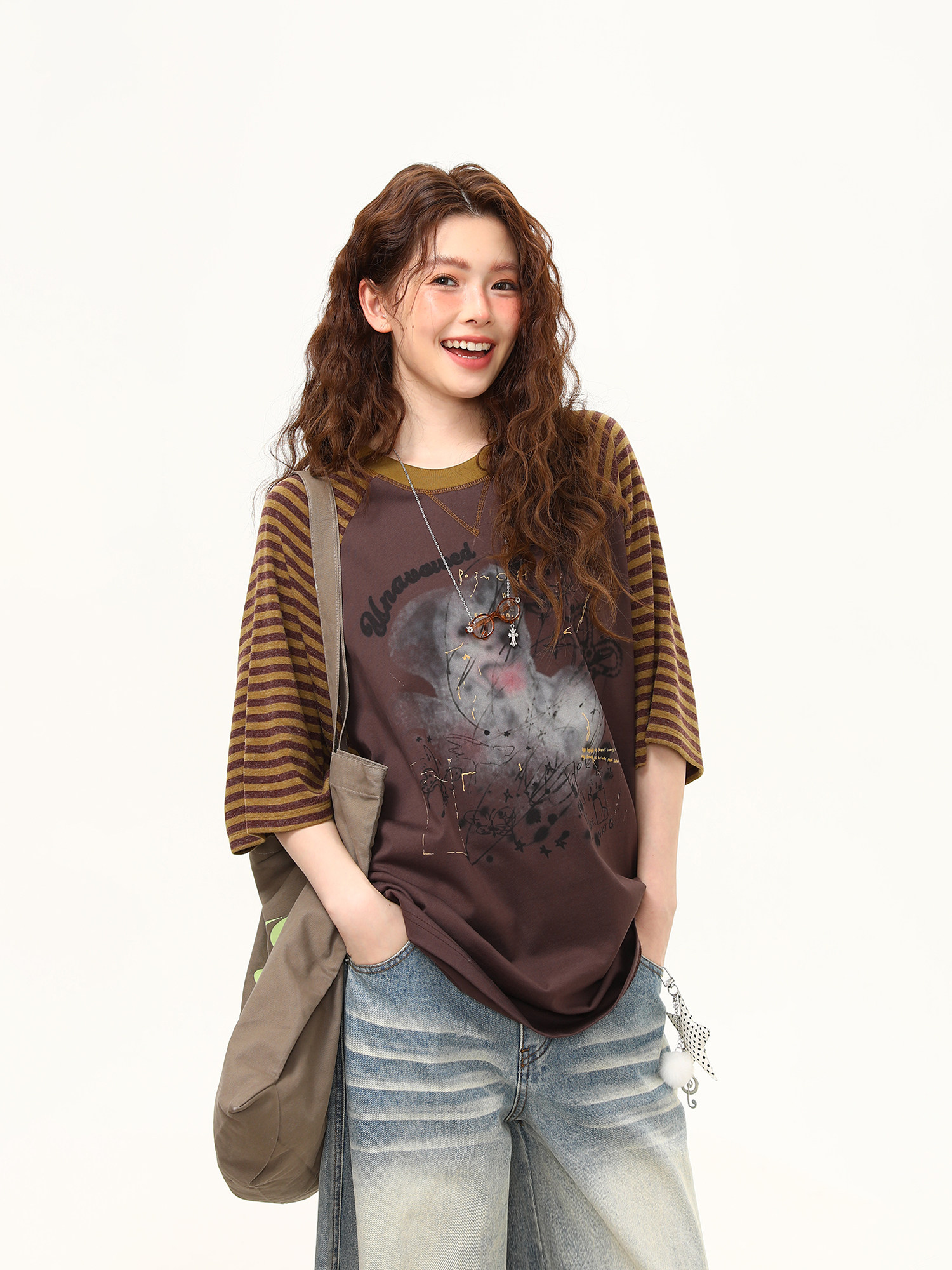American retro graffiti puppy print short-sleeved T-shirt for women, loose fit, raglan sleeves