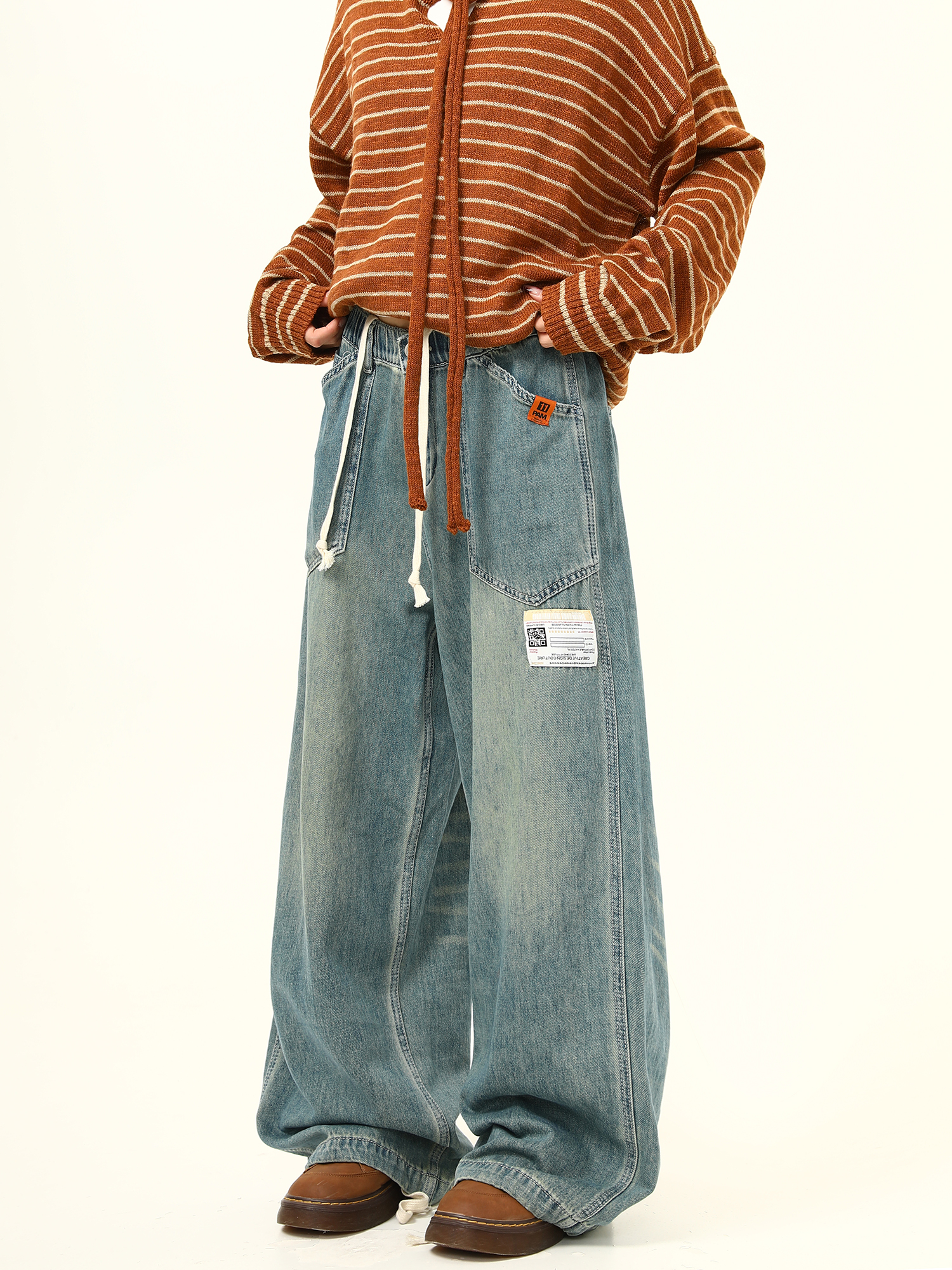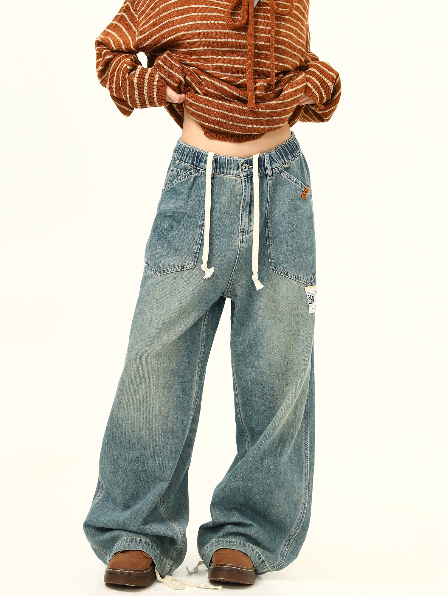 American retro washed baggy jeans for women, autumn trendy loose straight leg versatile dad jeans
