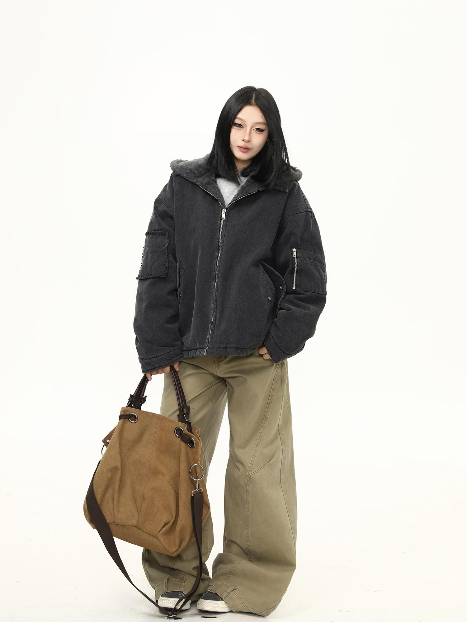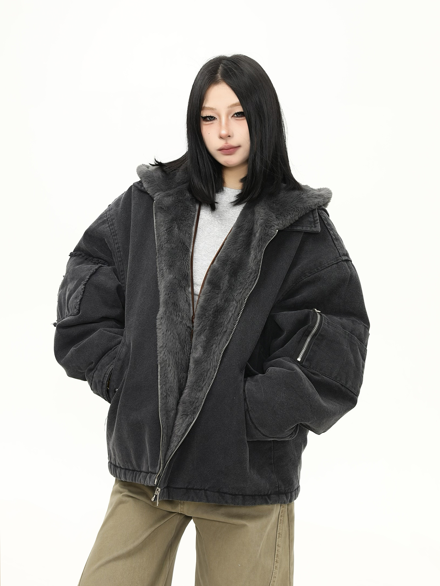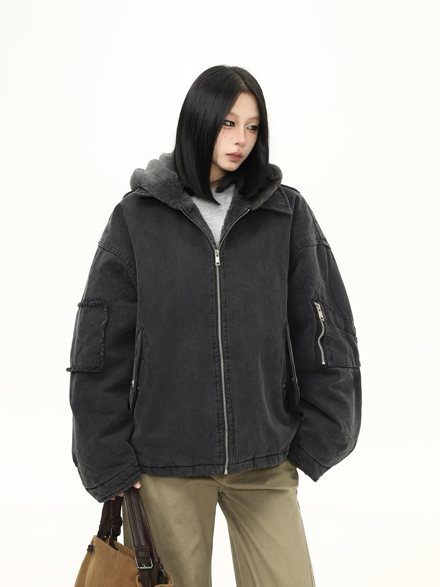 美式水洗重磅冬季棉服女毛絨連帽設計感加厚保暖棉衣外套