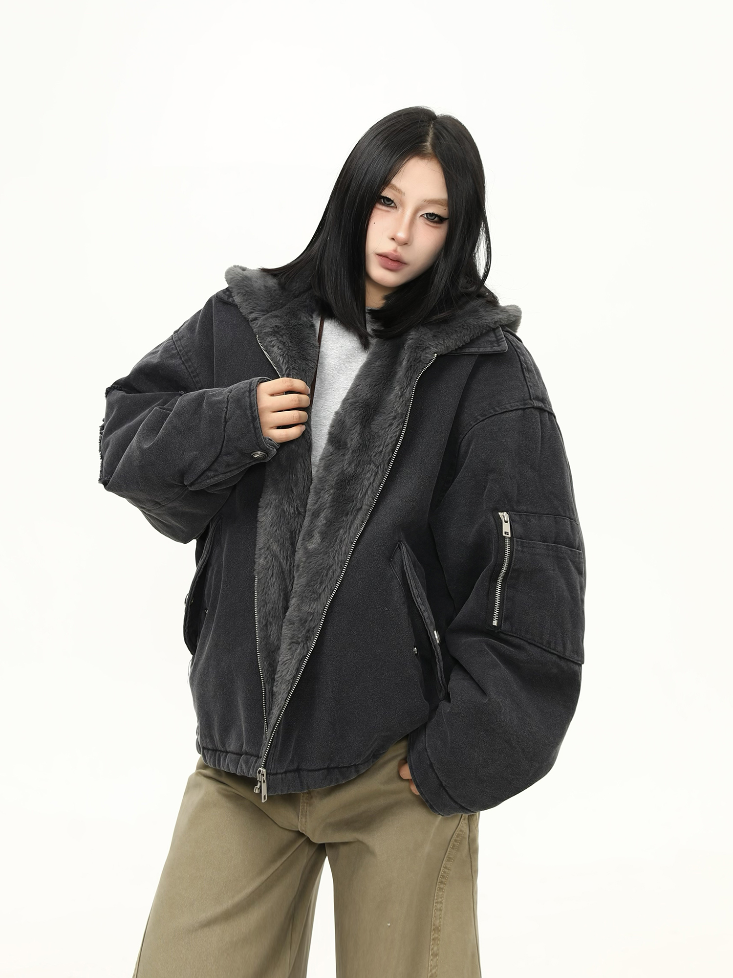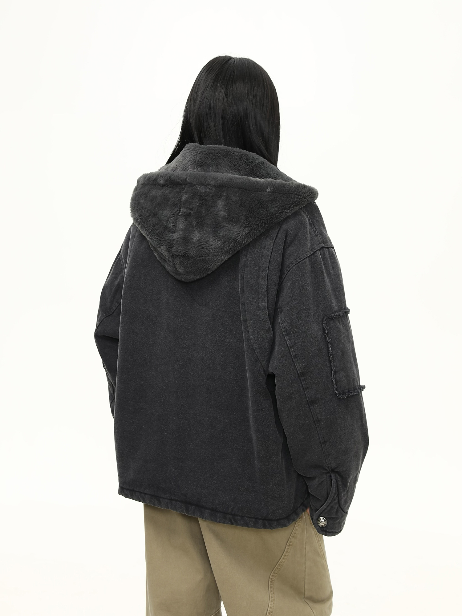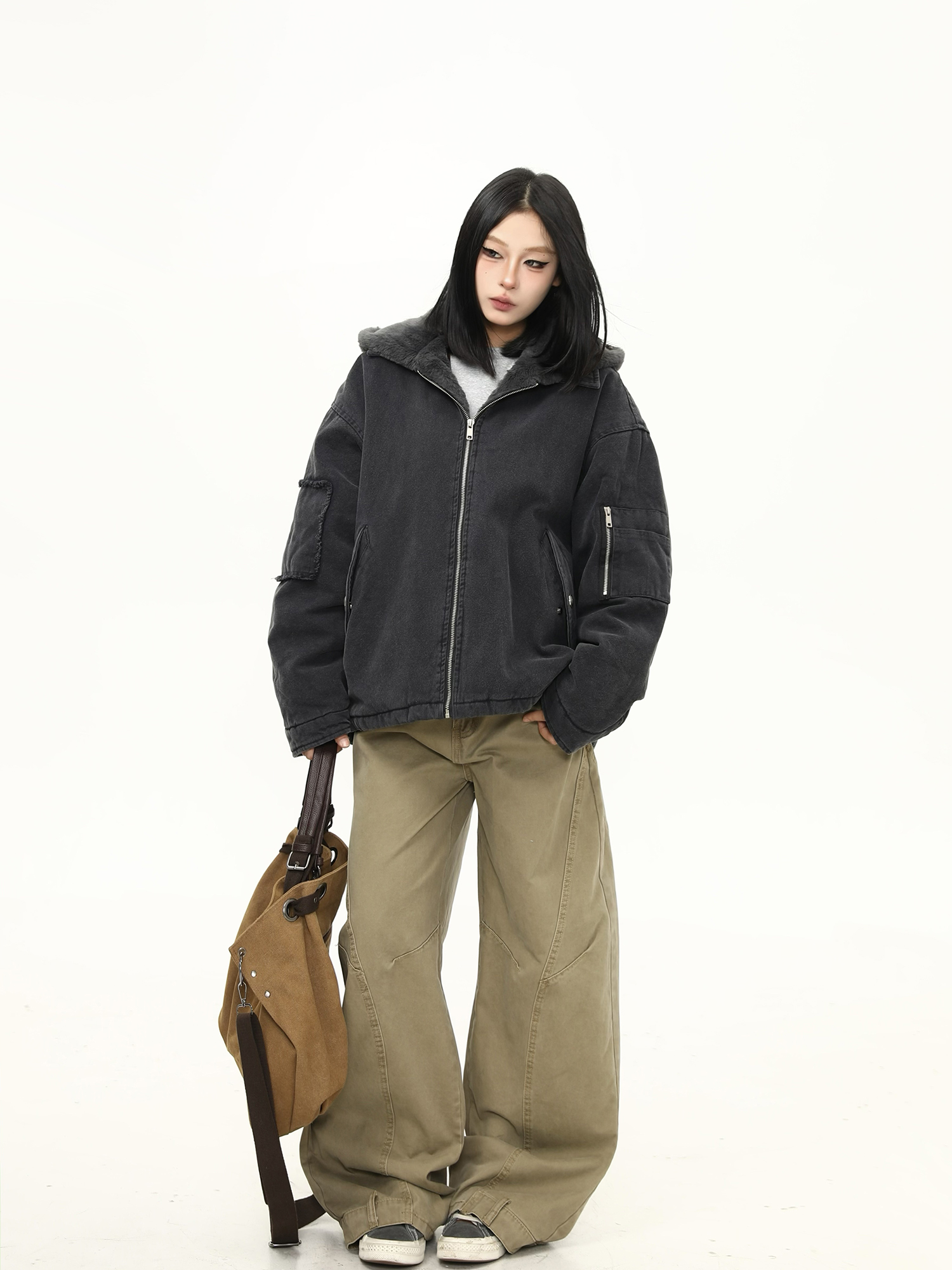 美式水洗重磅冬季棉服女毛絨連帽設計感加厚保暖棉衣外套