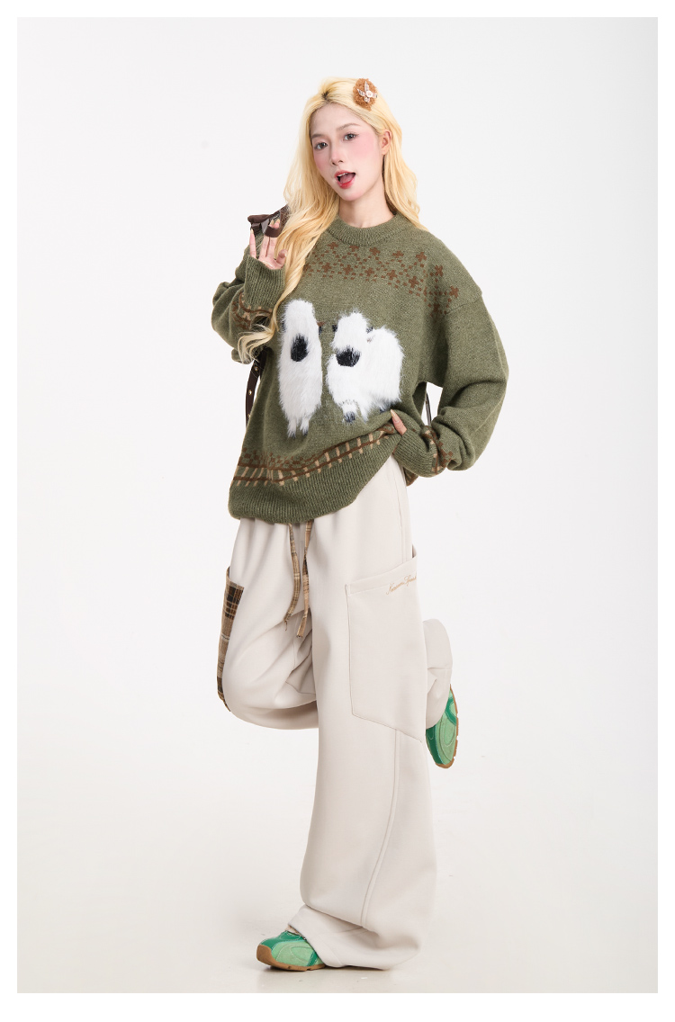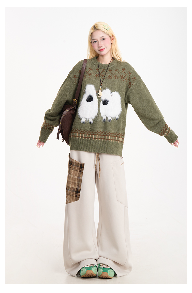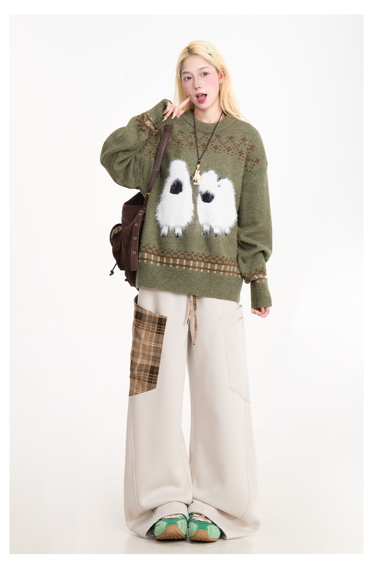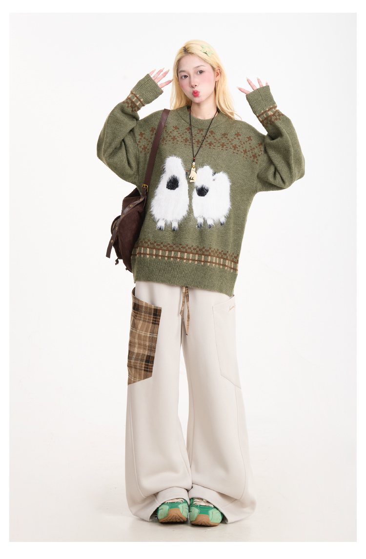 Fair Isle plush wool sweater for women, American retro style, relaxed fit, warm knitwear for autumn and winter.