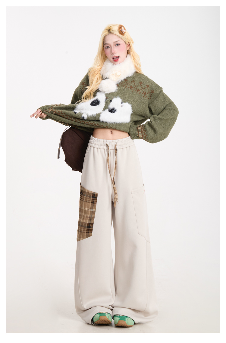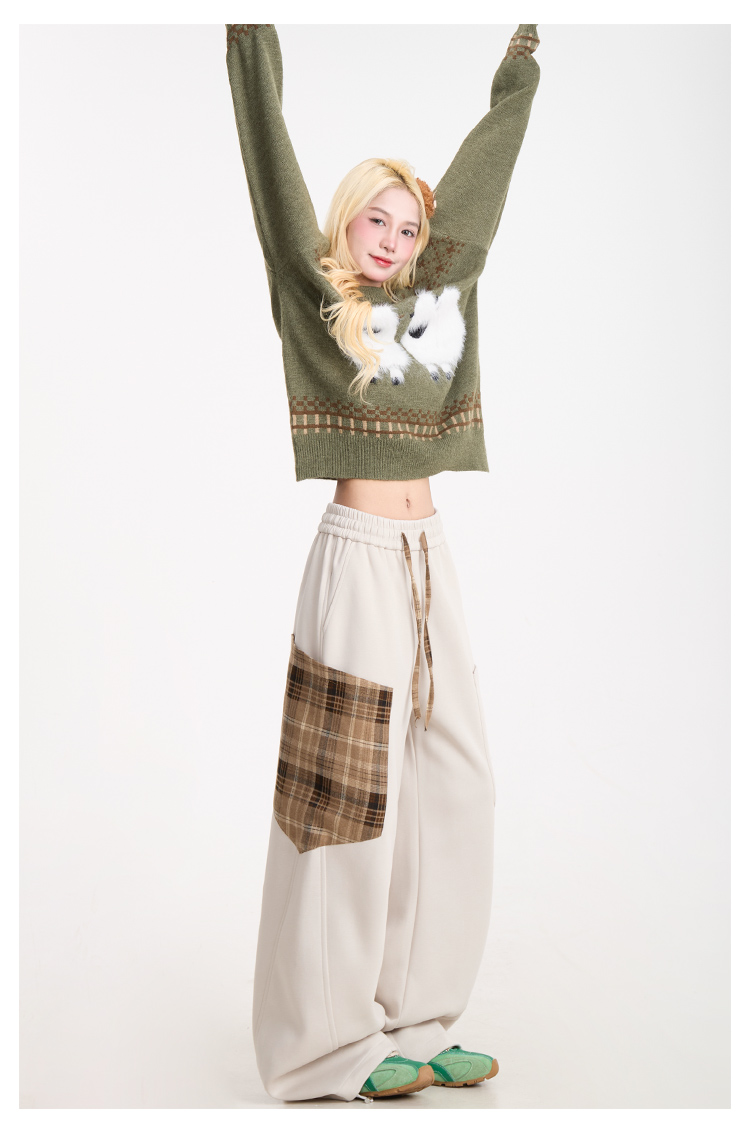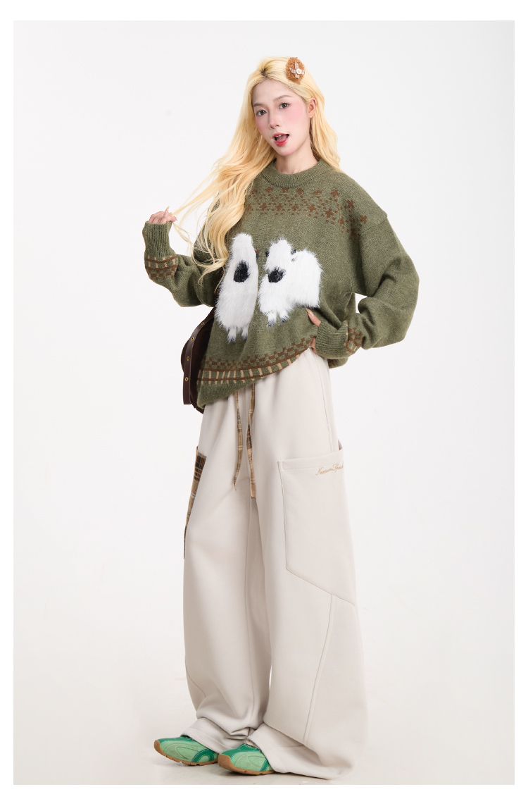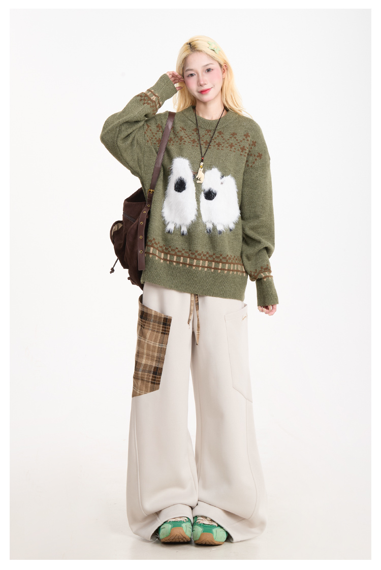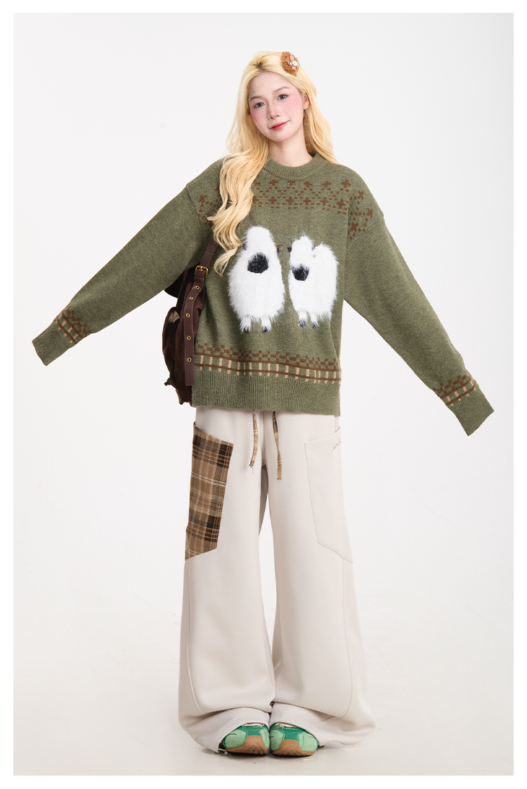 Fair Isle plush wool sweater for women, American retro style, relaxed fit, warm knitwear for autumn and winter.