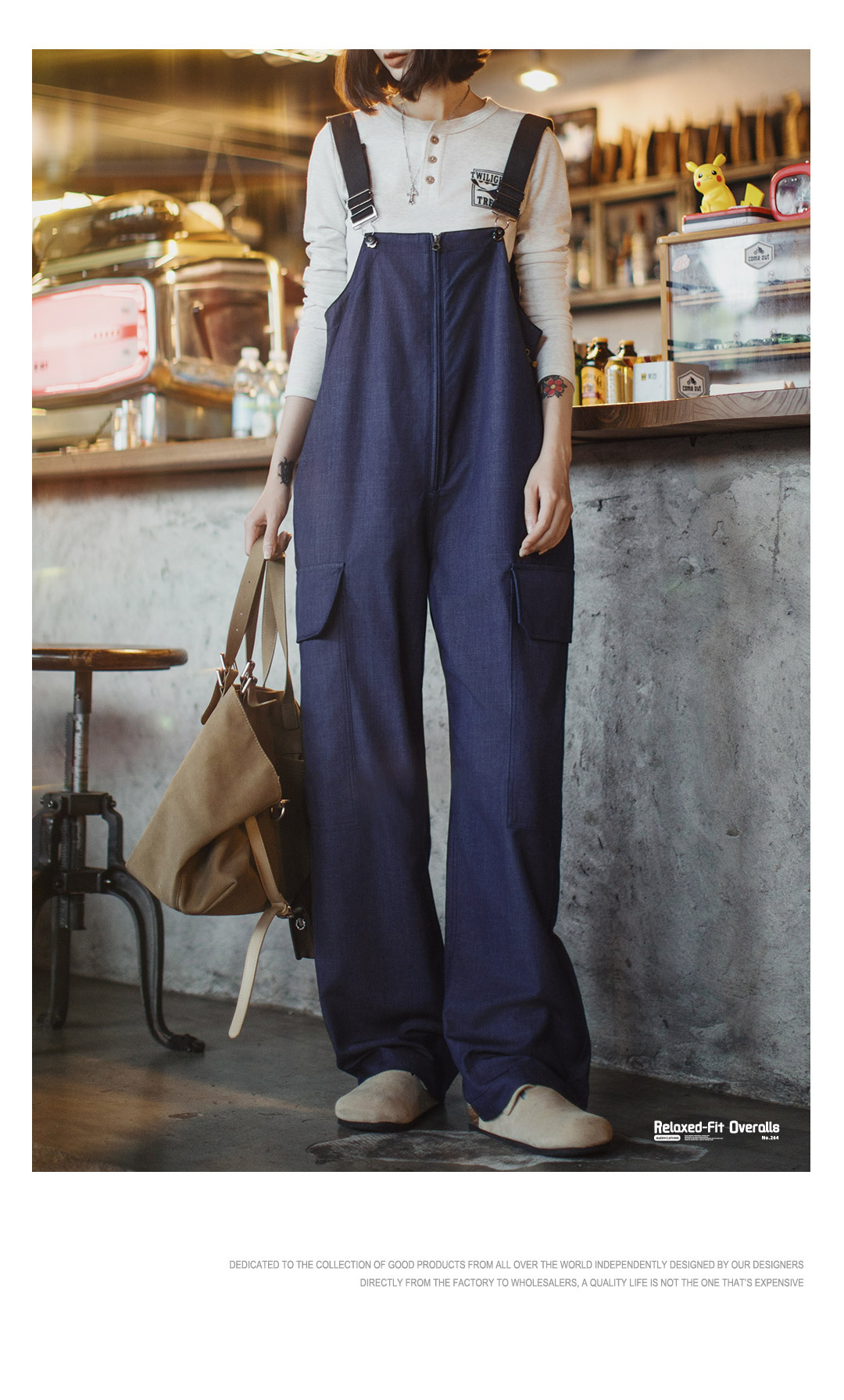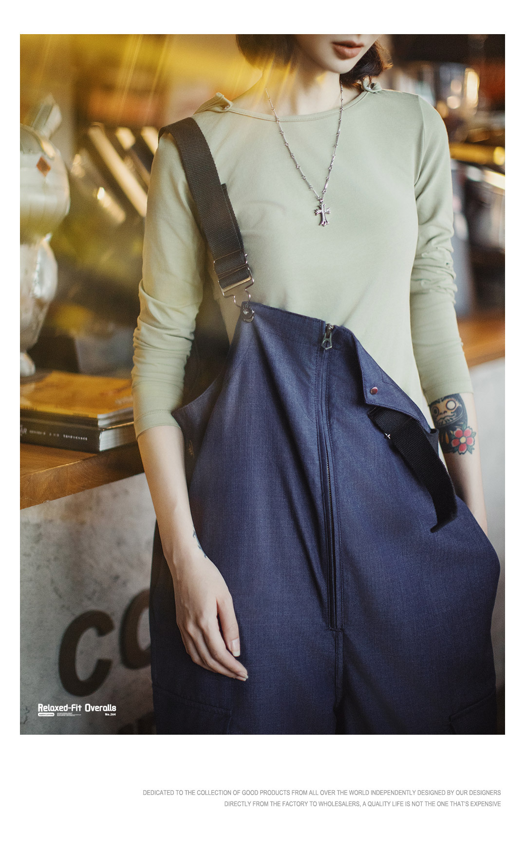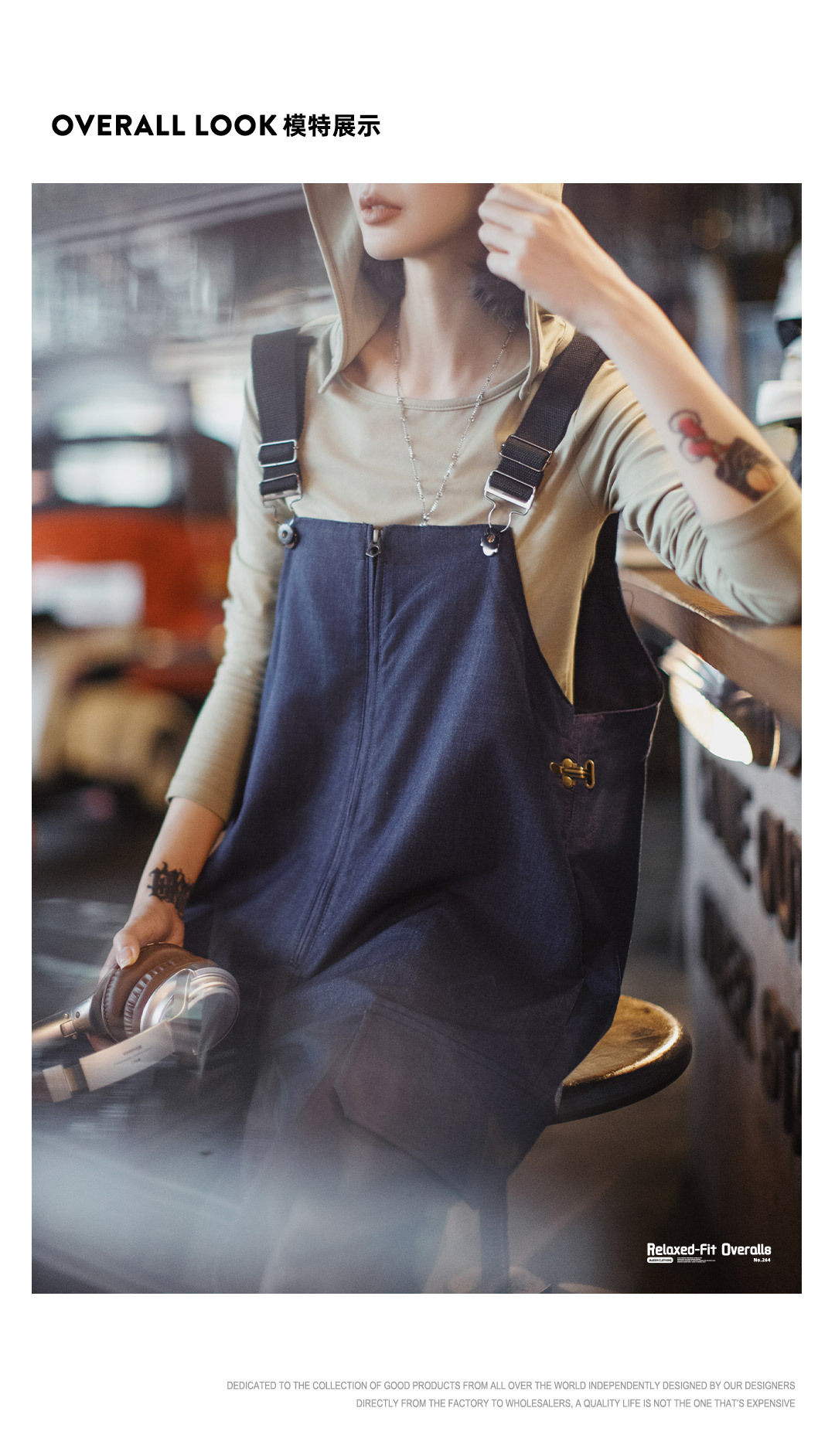 High-waisted denim straight leg wide-leg loose cargo overalls sleeveless suspender long jumpsuit women's autumn