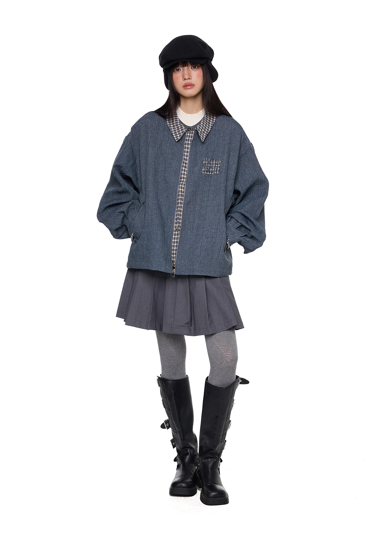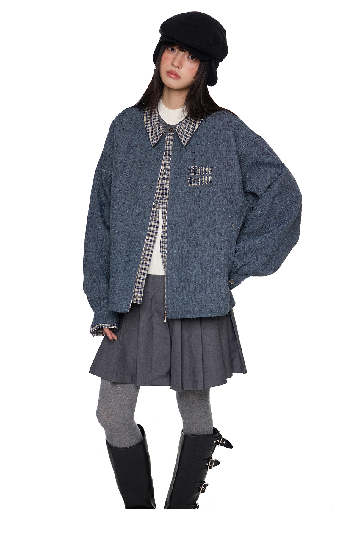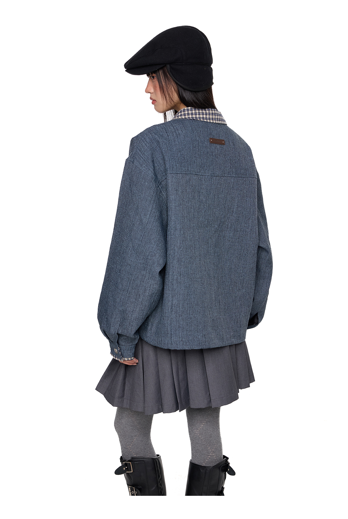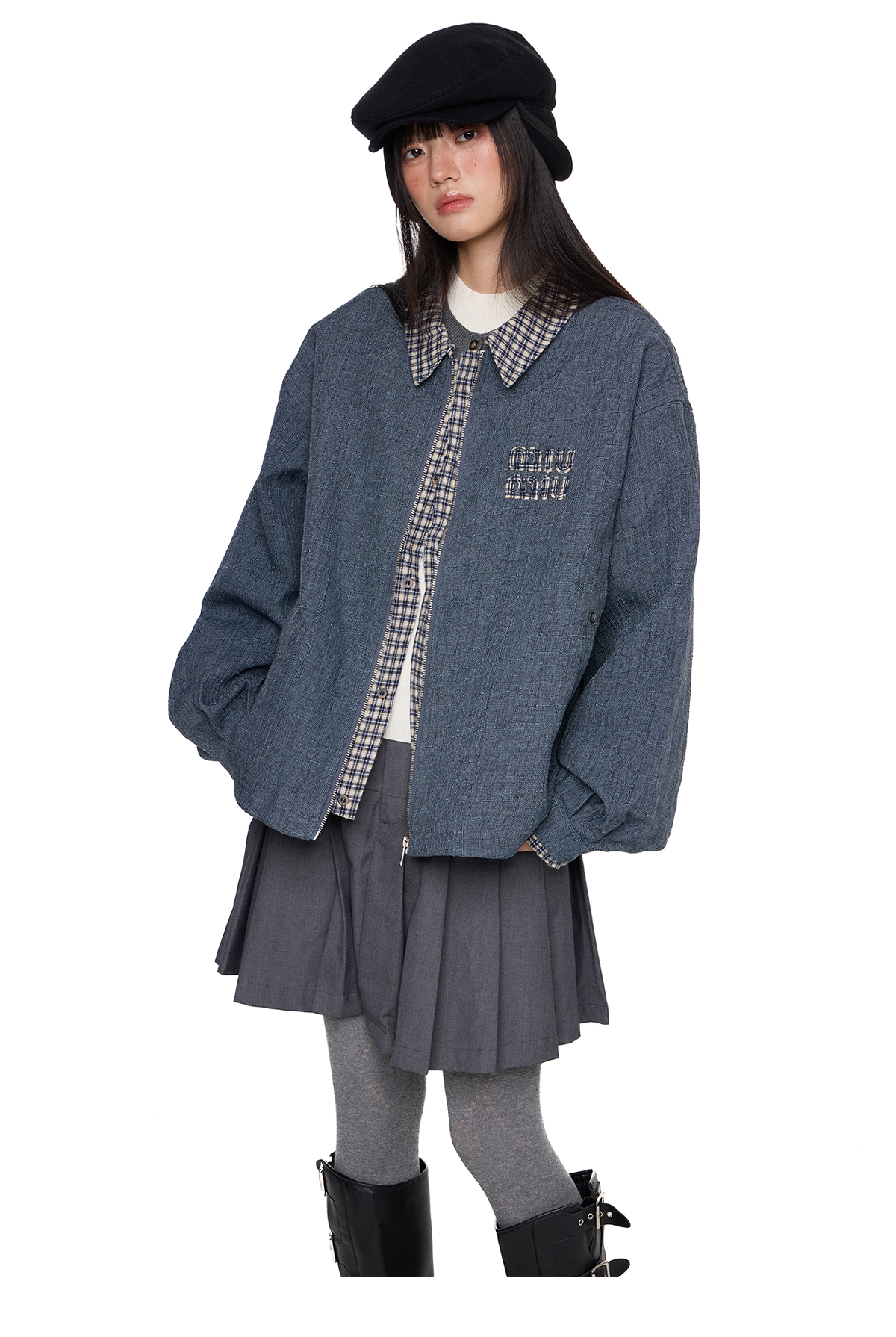 刺繡格子拼接翻領竹節布夾克外套女秋新款休閒寬鬆百搭上衣