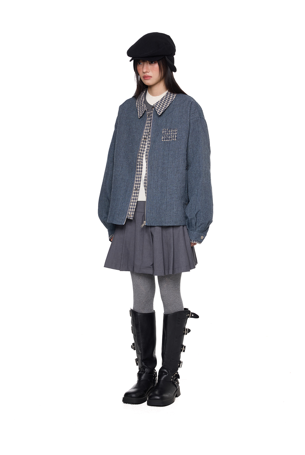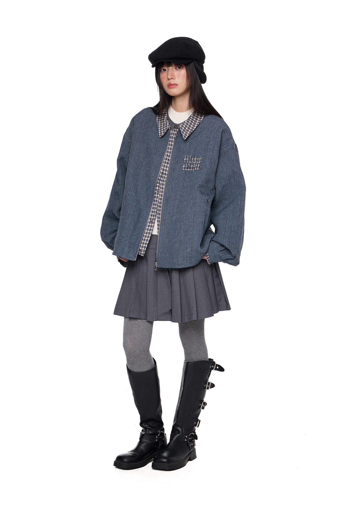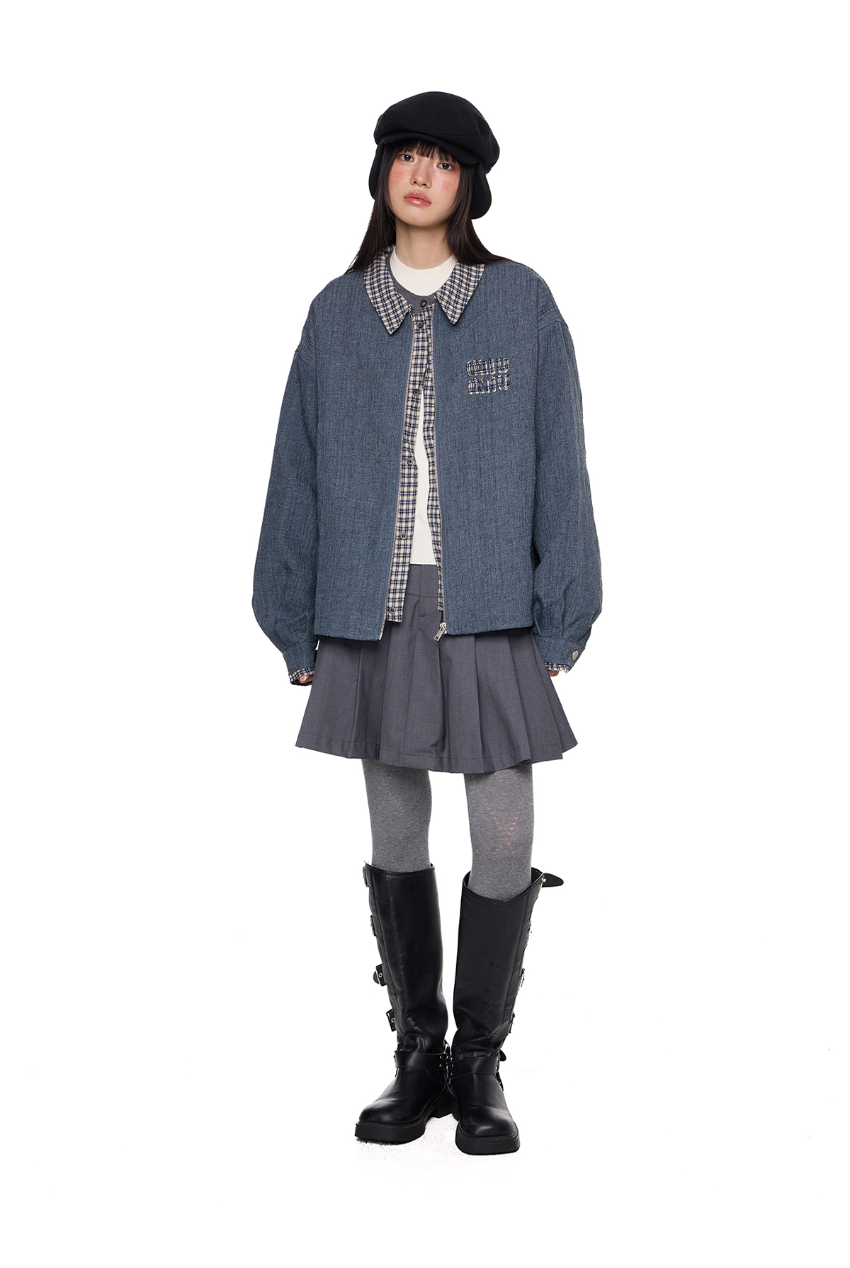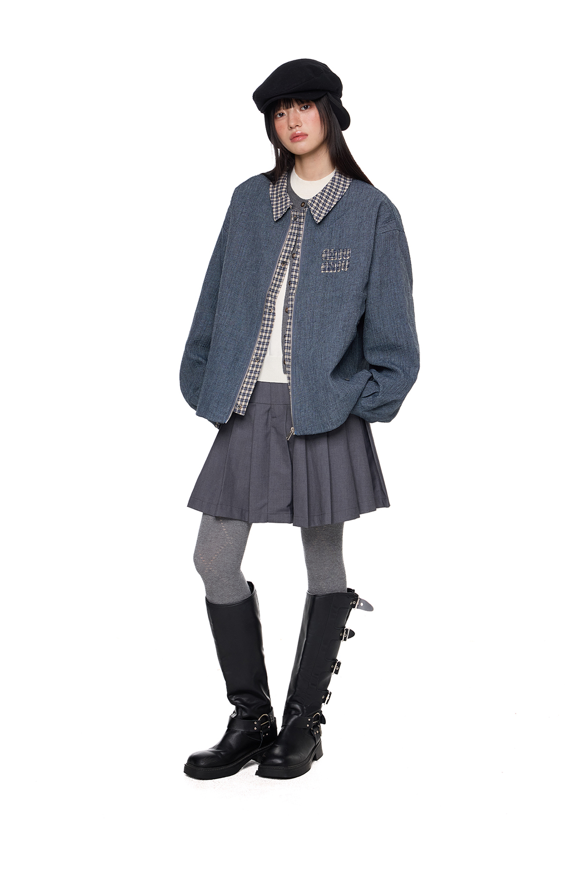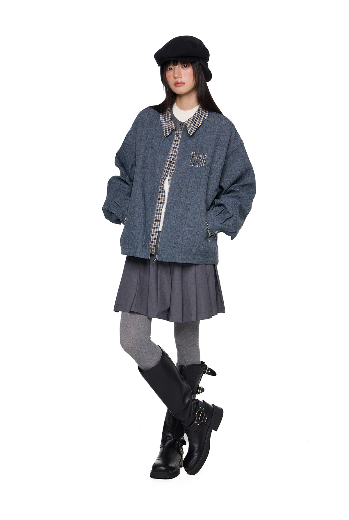刺繡格子拼接翻領竹節布夾克外套女秋新款休閒寬鬆百搭上衣