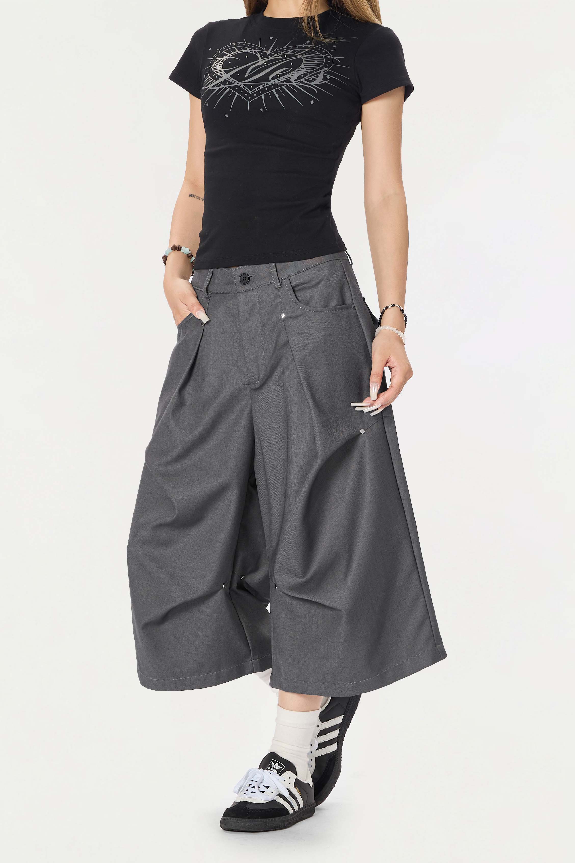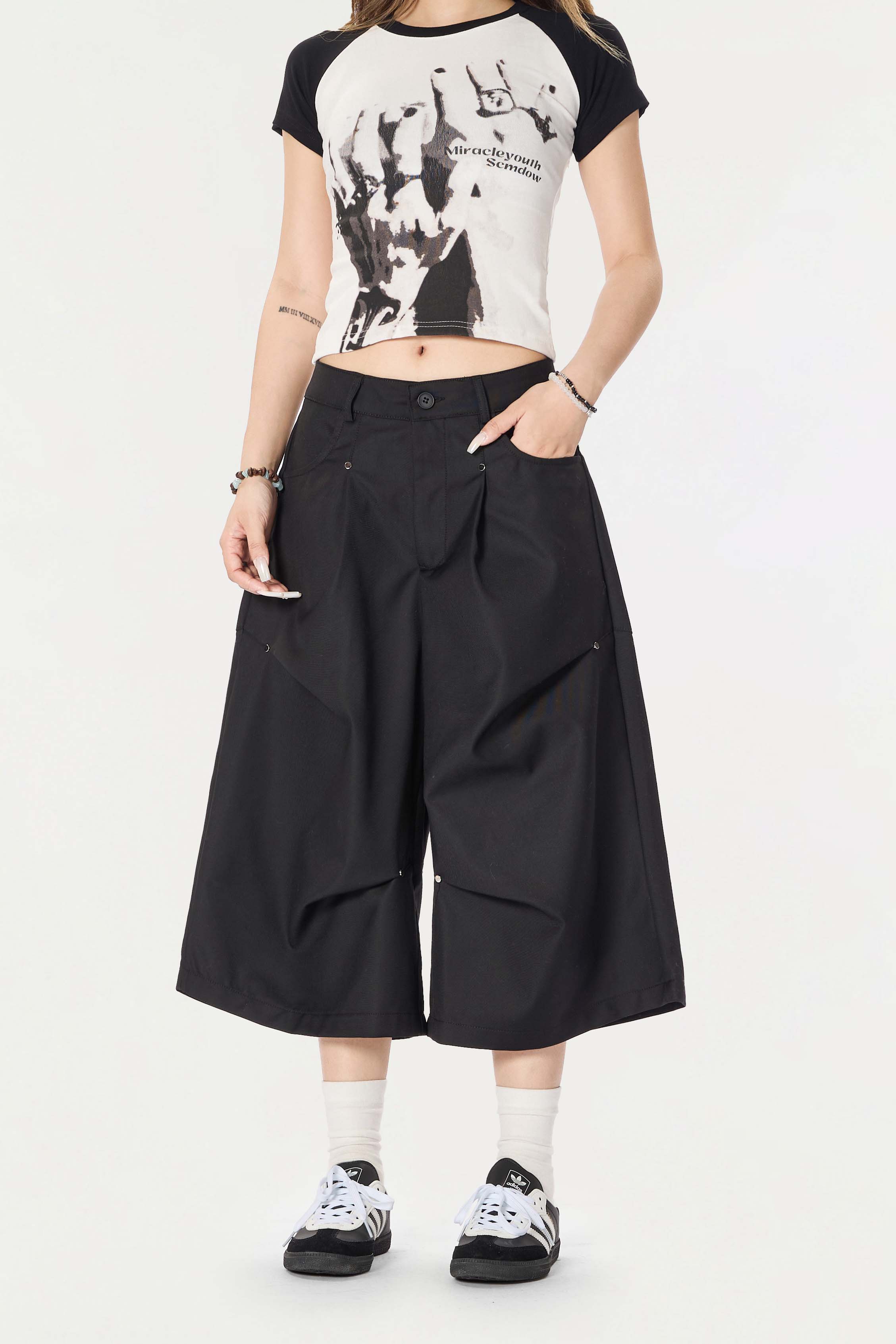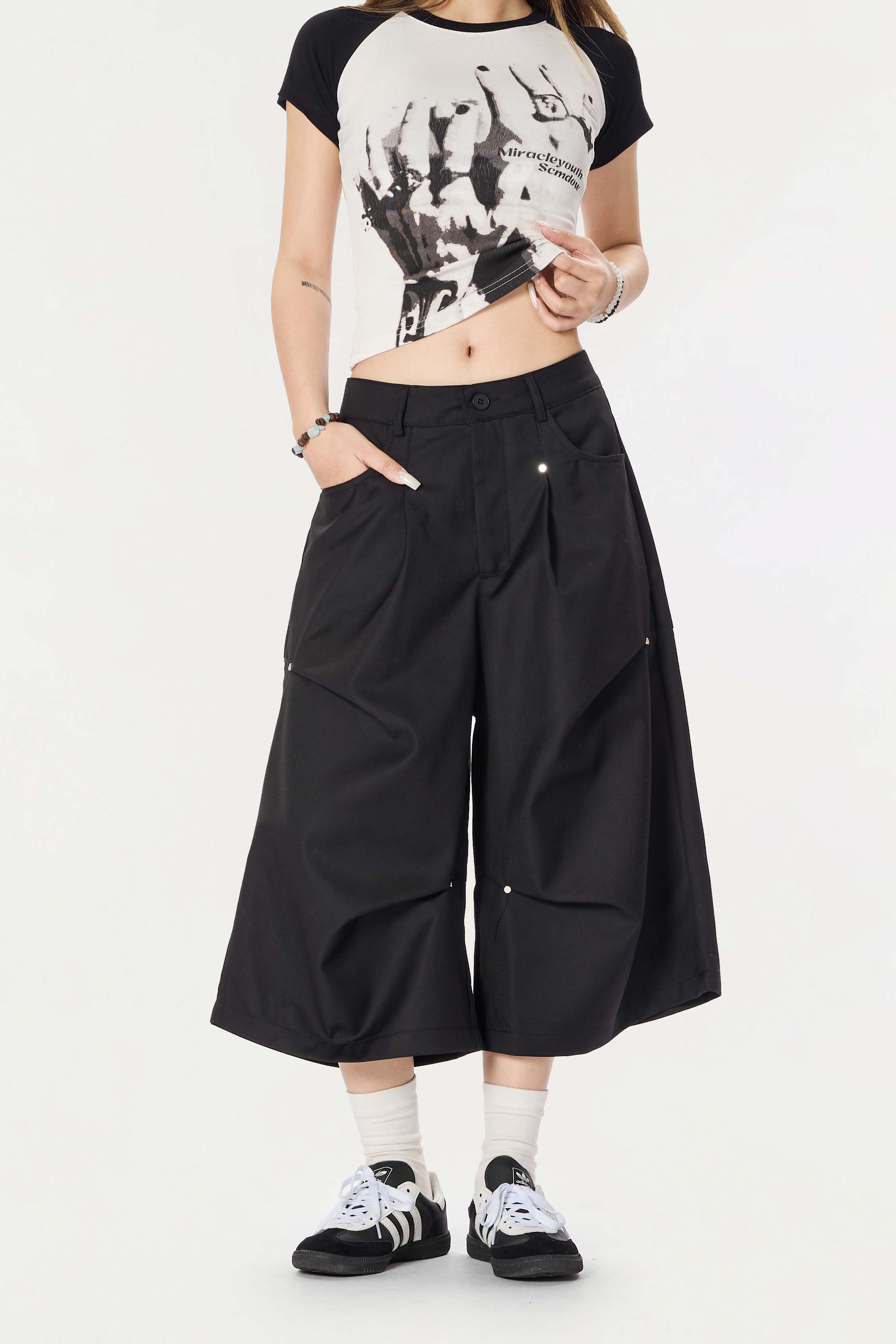 夏季潮牌設計感撞釘休閒短褲女cleanfi闊腿七分褲