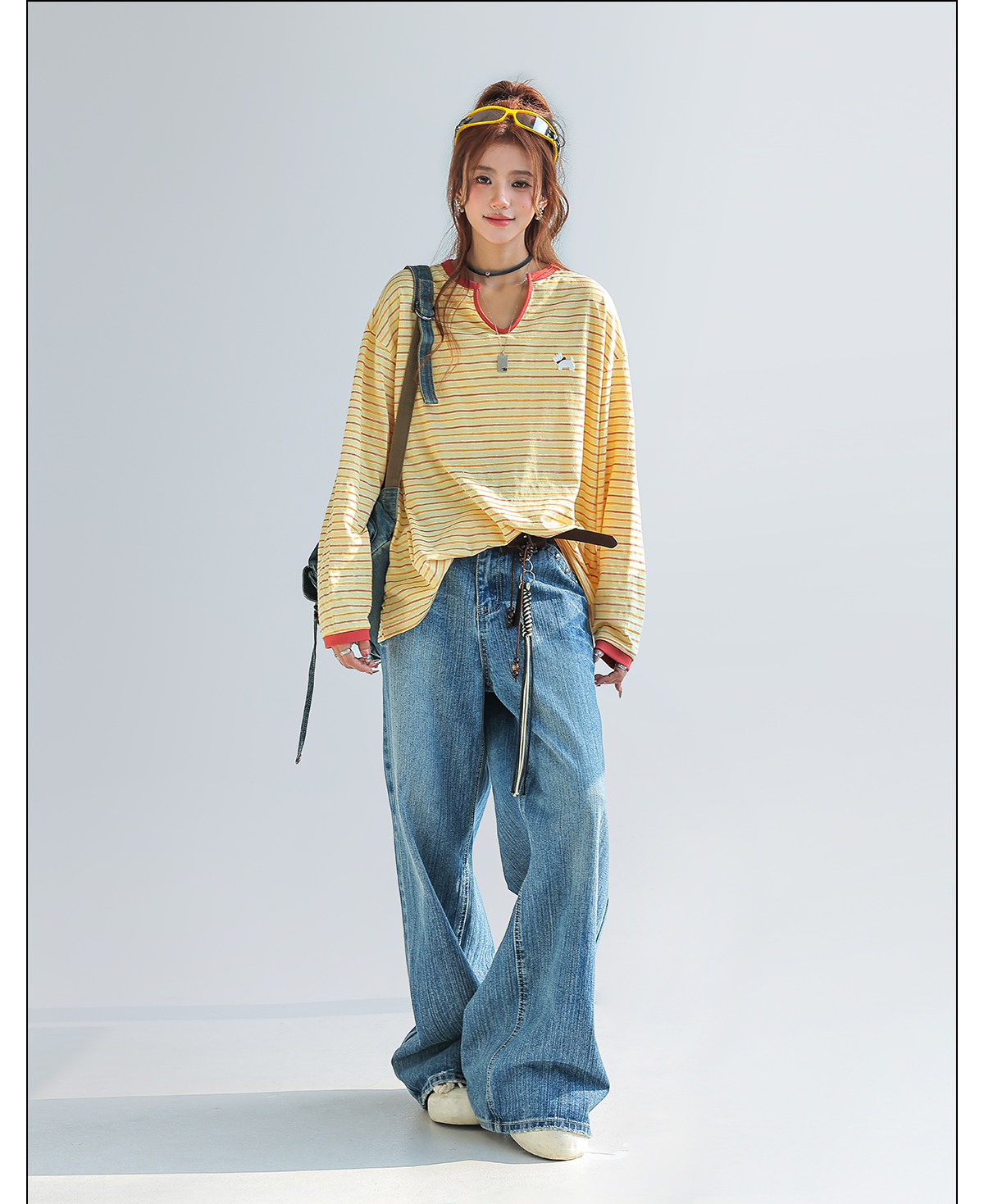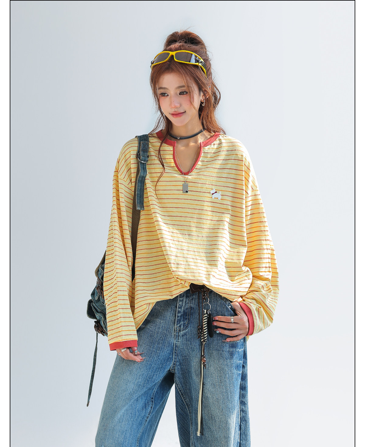 小馬刺繡撞色拼接條紋長袖t恤女設計感小眾V領上衣春