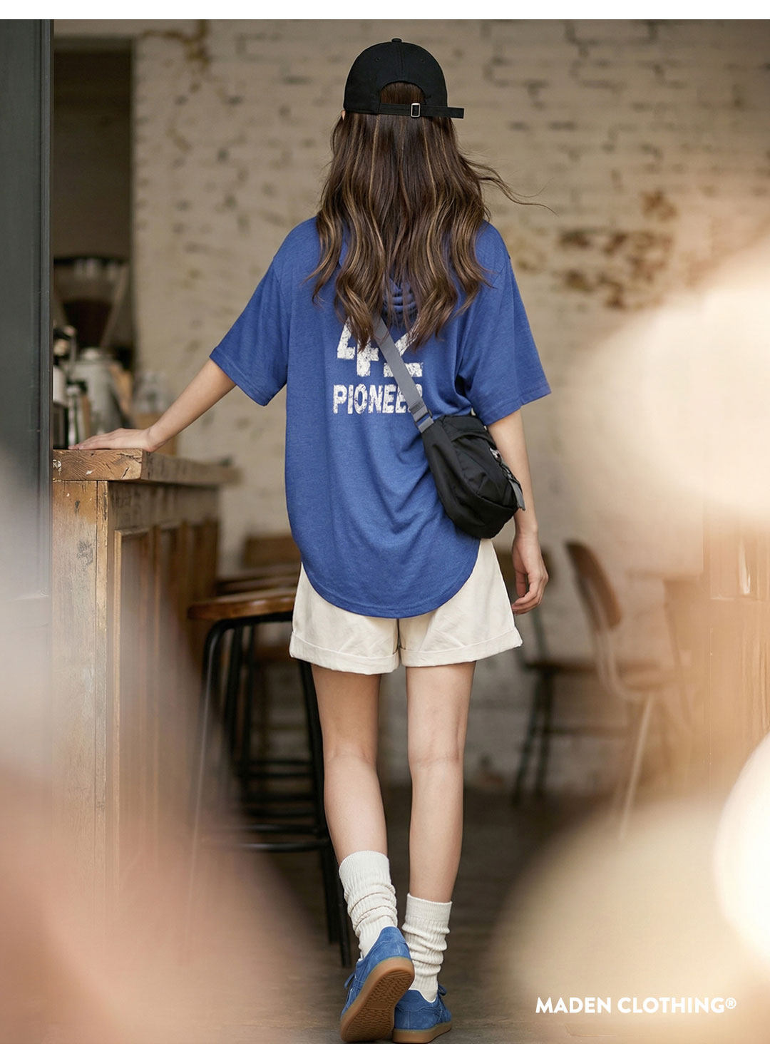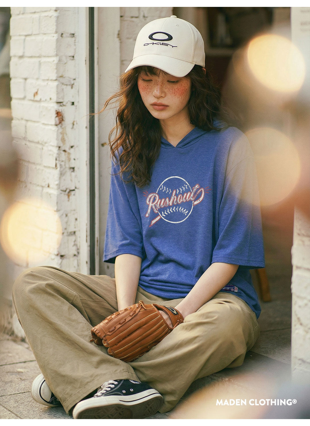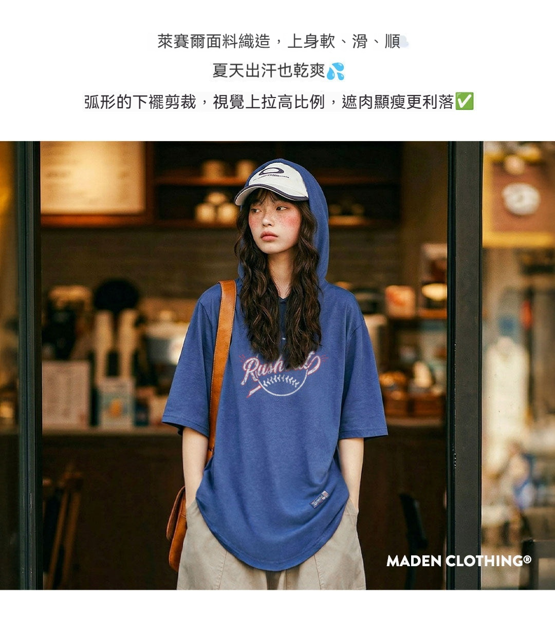 復古寬鬆印花萊賽爾天絲弧形下擺連帽短袖T恤半袖上衣女士夏