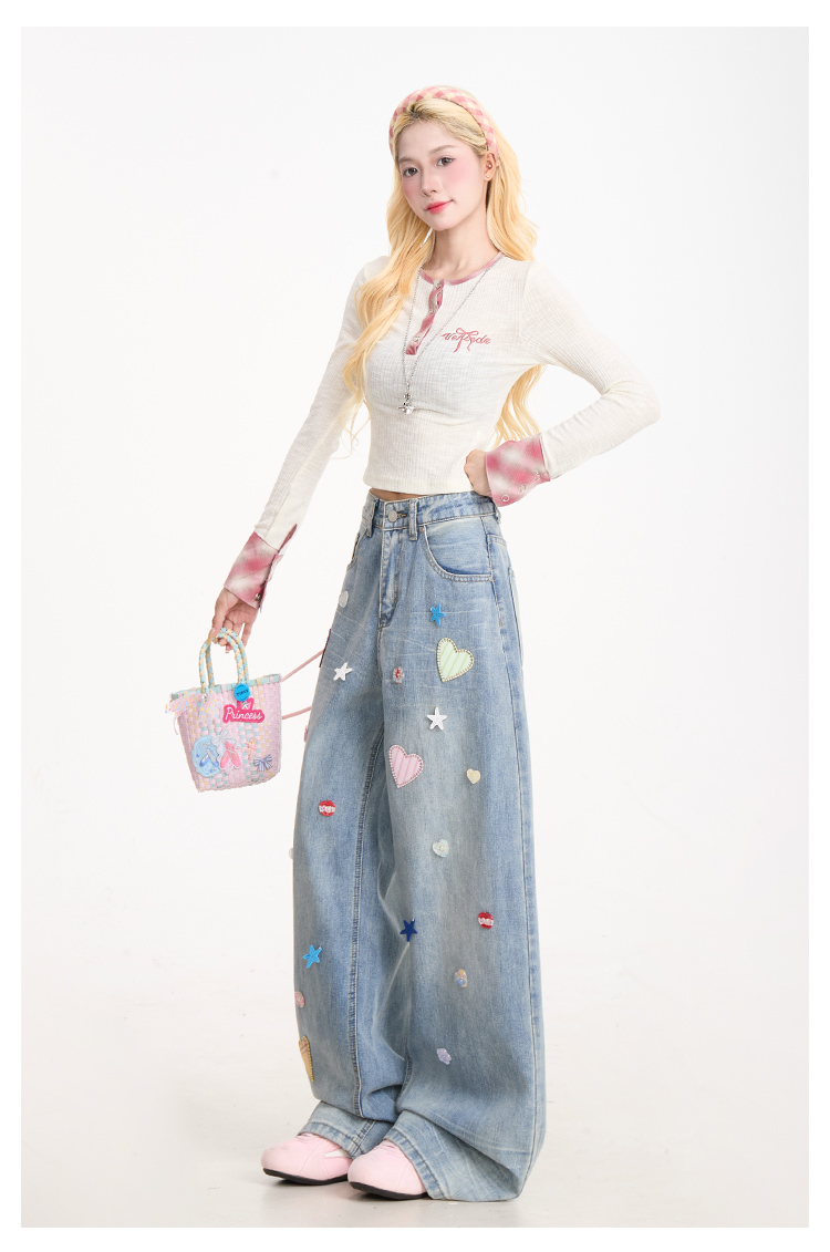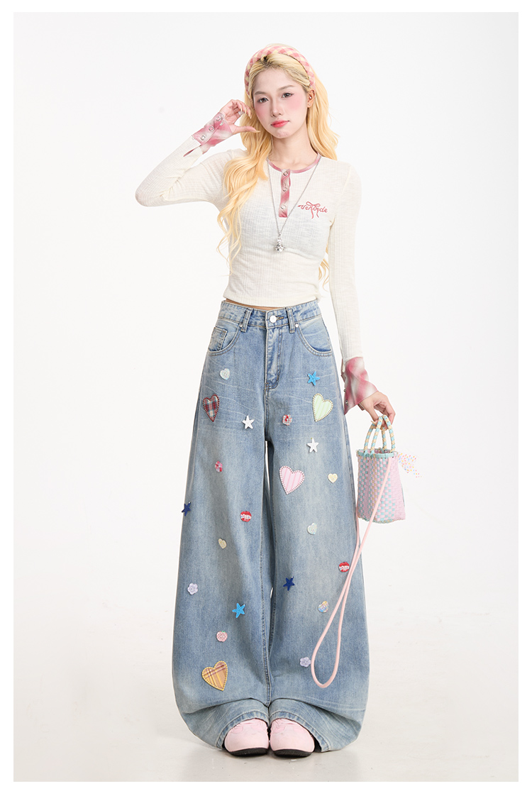 愛心貼布星星紐扣裝潢牛仔褲女復古做舊水洗闊腿直筒褲子