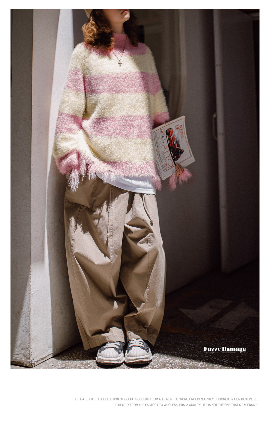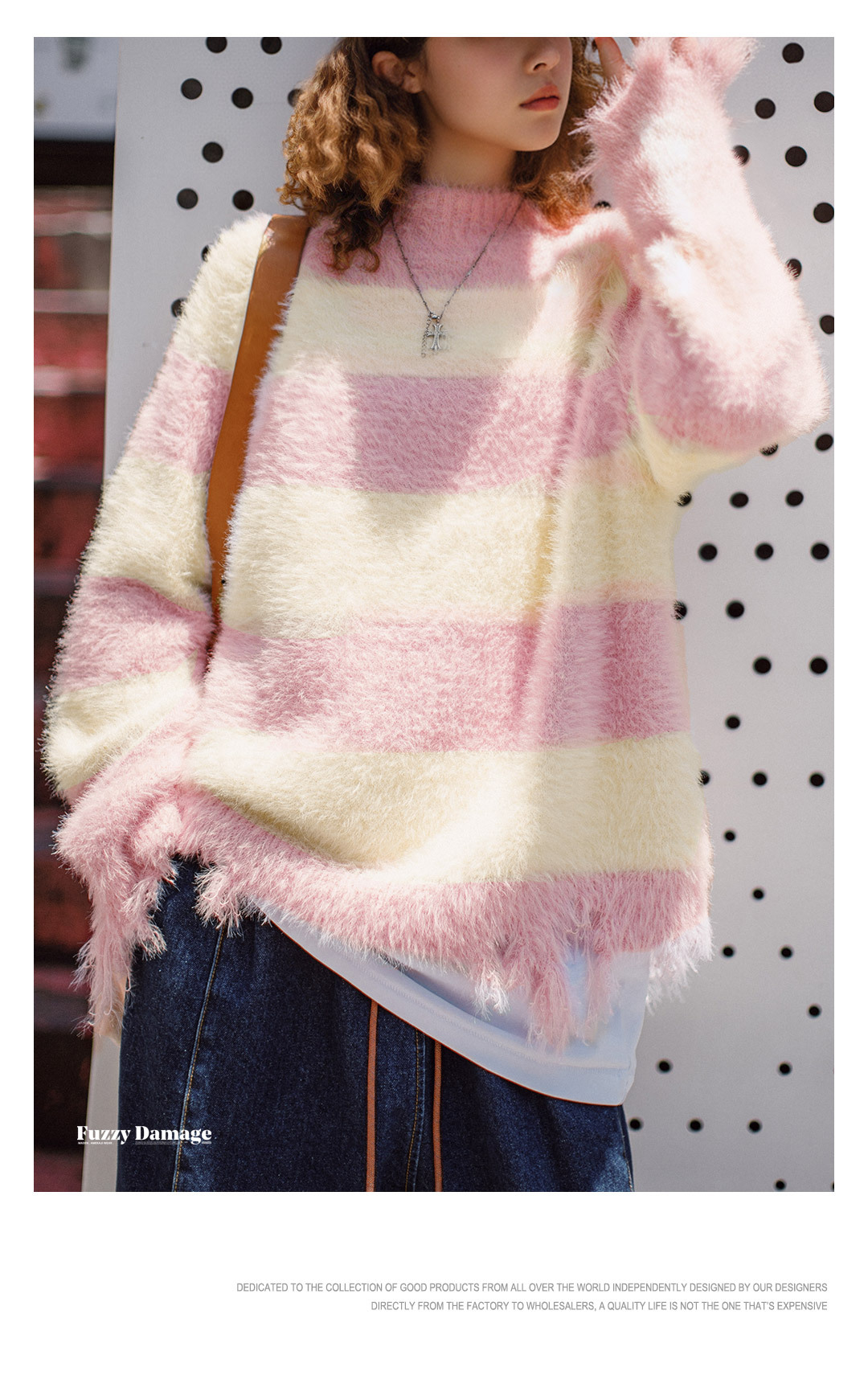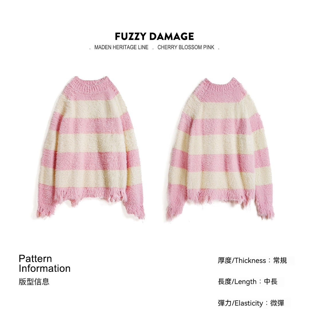 粉白色寬條紋半高領寬鬆破壞奶呼呼軟糯針織套頭毛衣女士秋冬