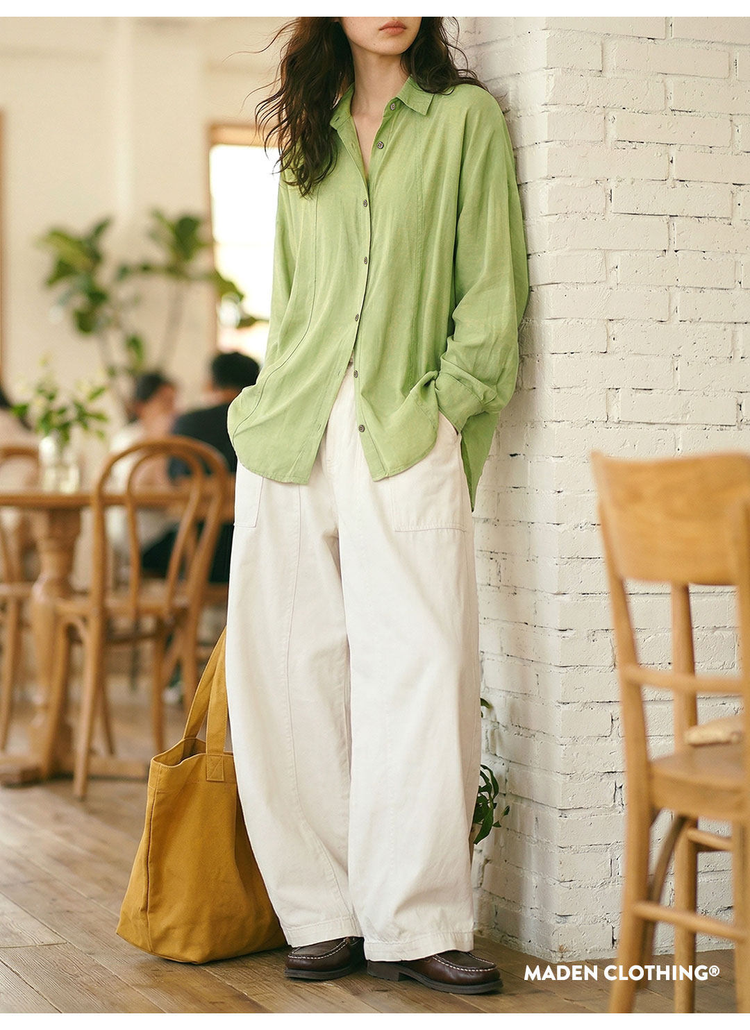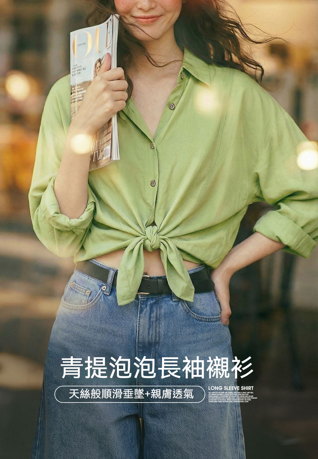 綠色仿天絲垂感輕薄款翻領寬鬆休閒長袖襯衫外套襯上衣女士春