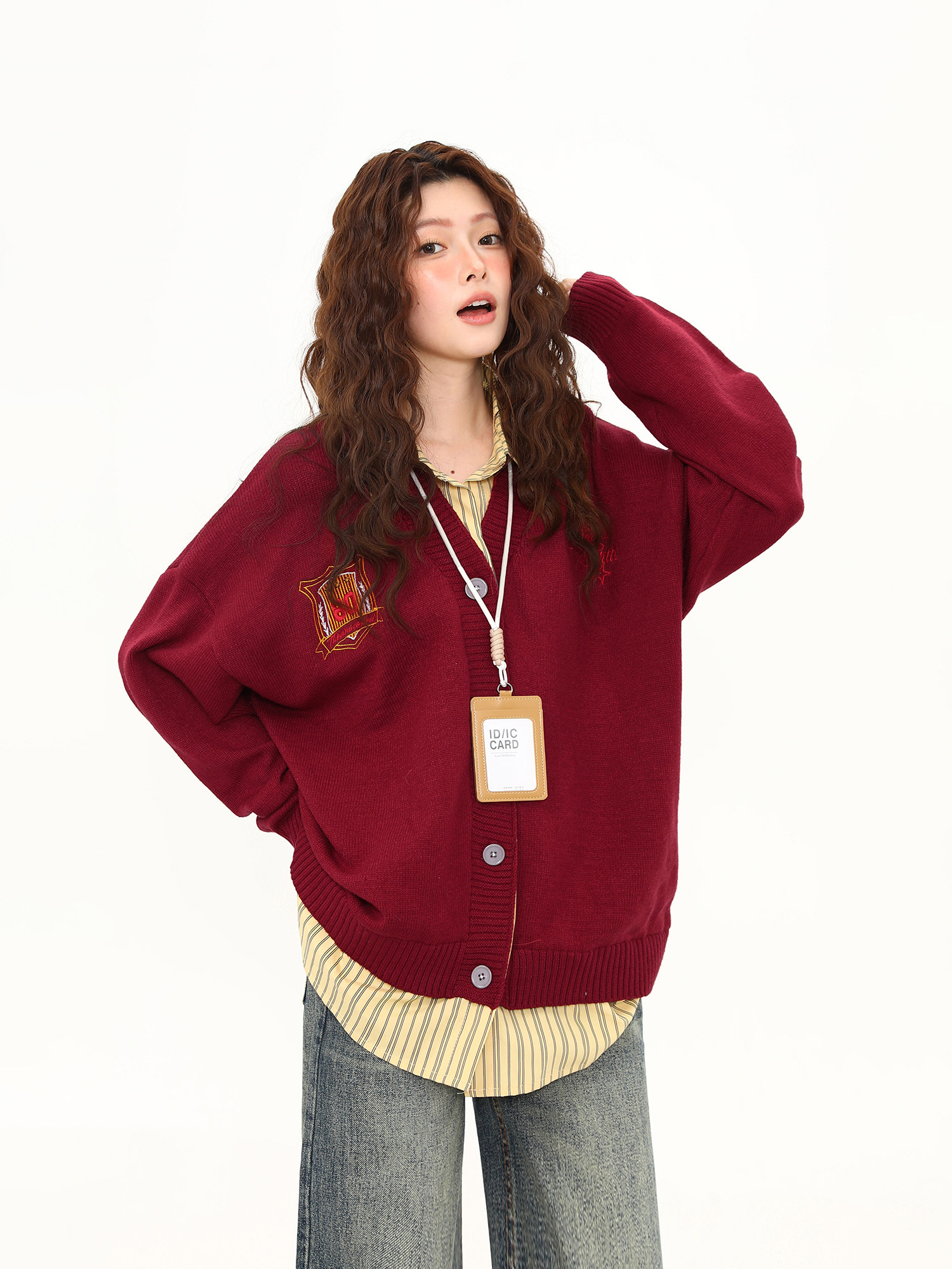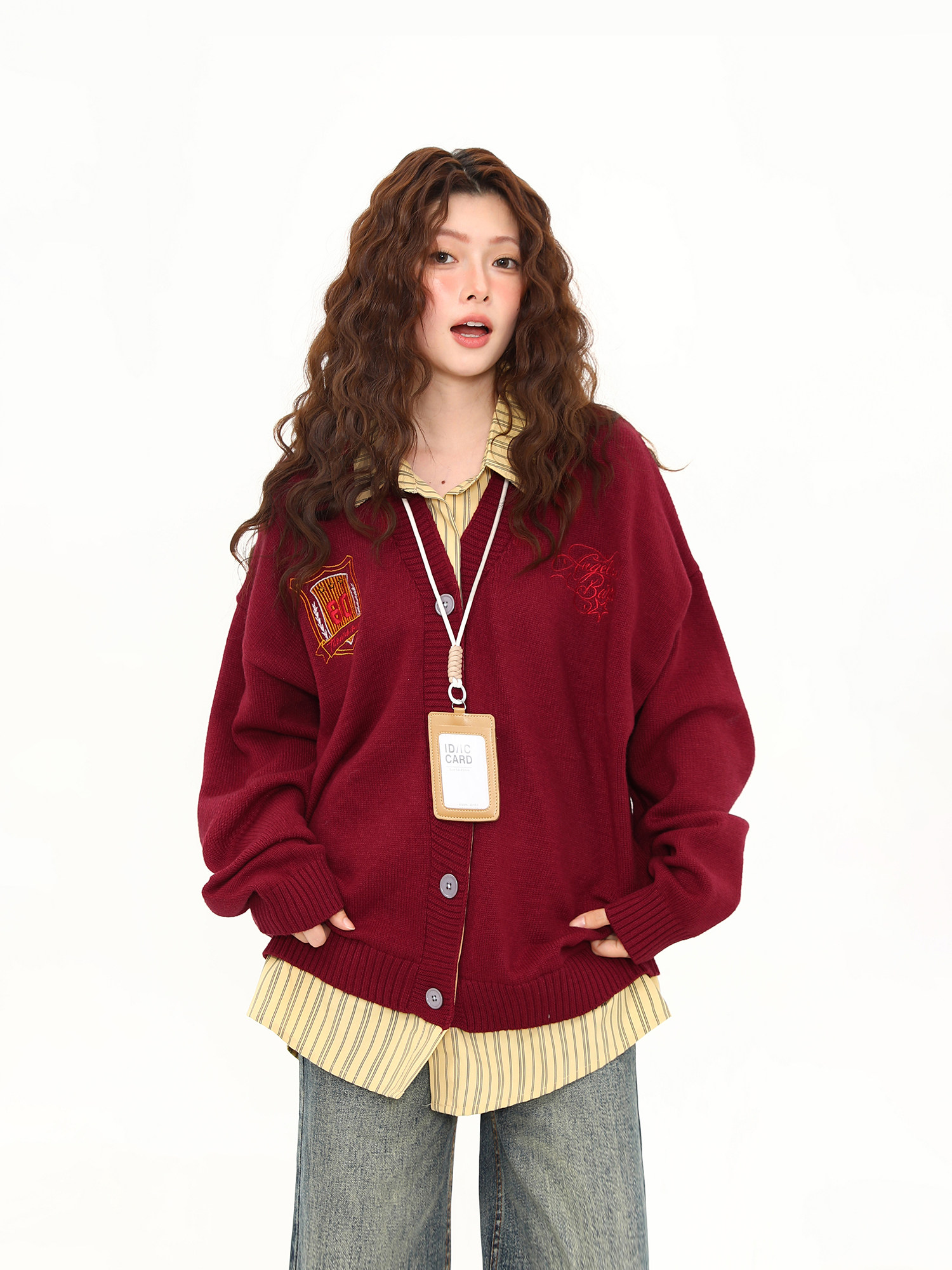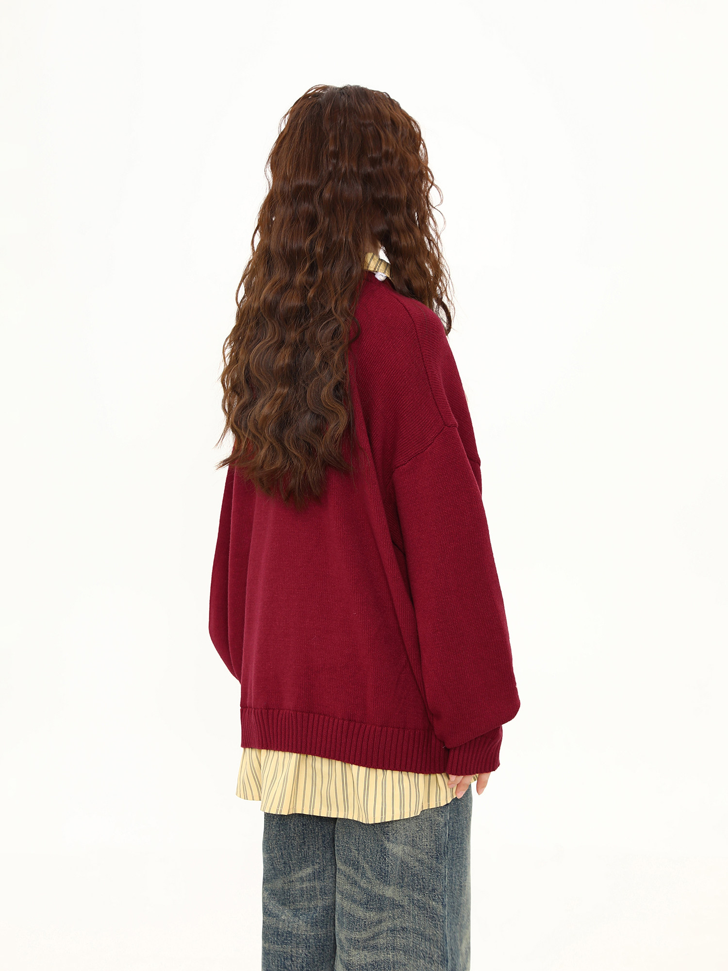 美式假兩件學院風紅色毛衣女開衫慵懶風鬆弛感針織衫外套