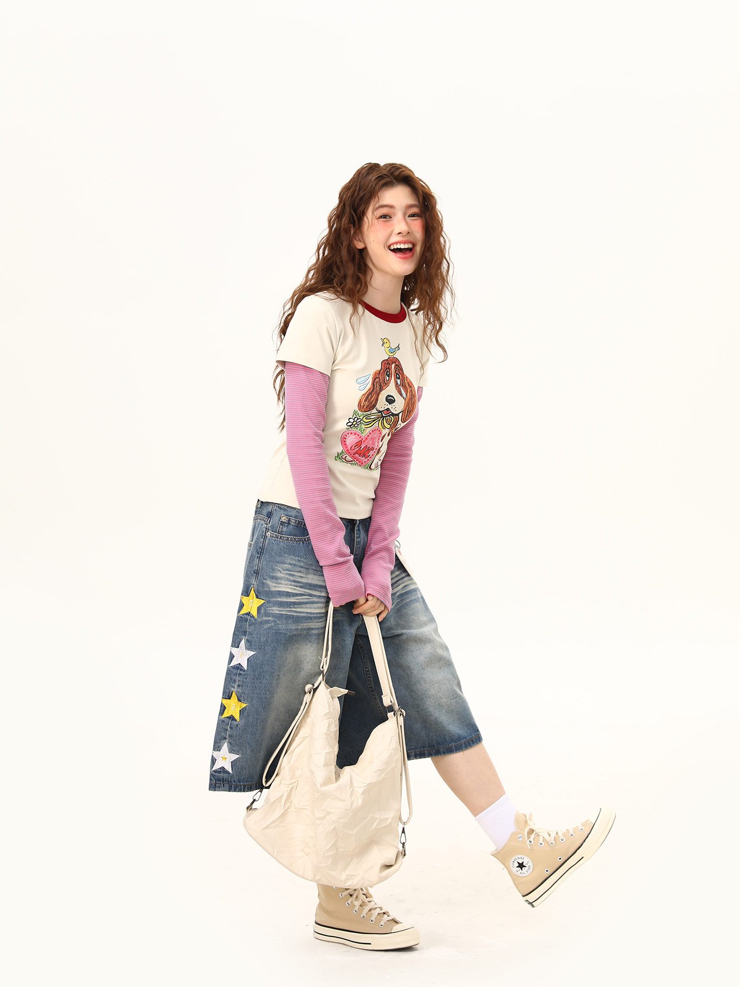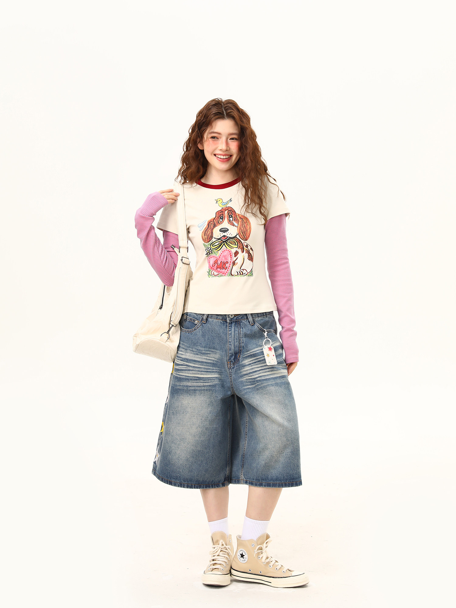 美式復古塗鴉小狗假兩件撞色長袖T恤女辣妹短款顯瘦上衣