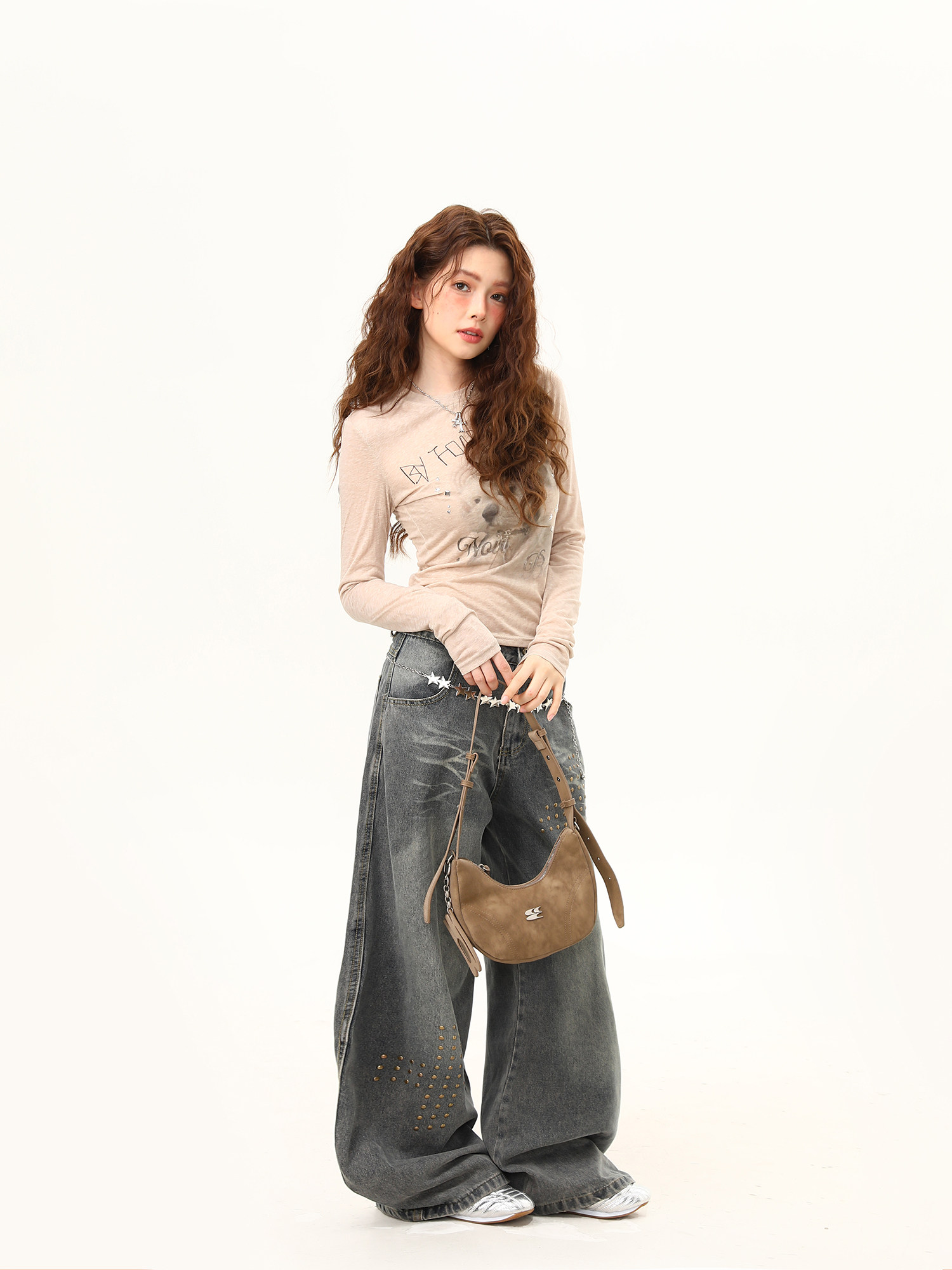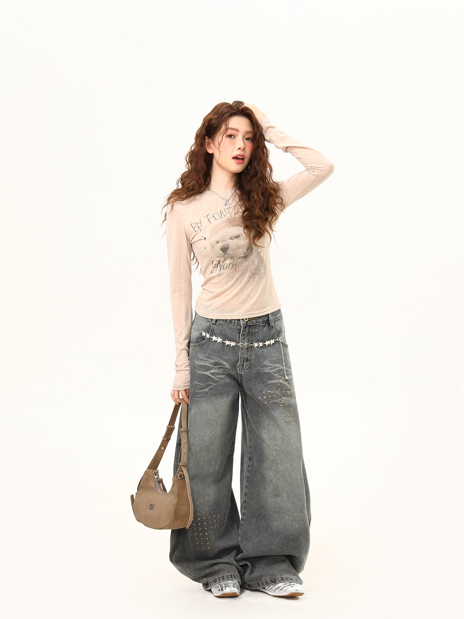 美式復古小狗印花辣妹正肩長袖T恤女夏季微透輕薄罩衫女