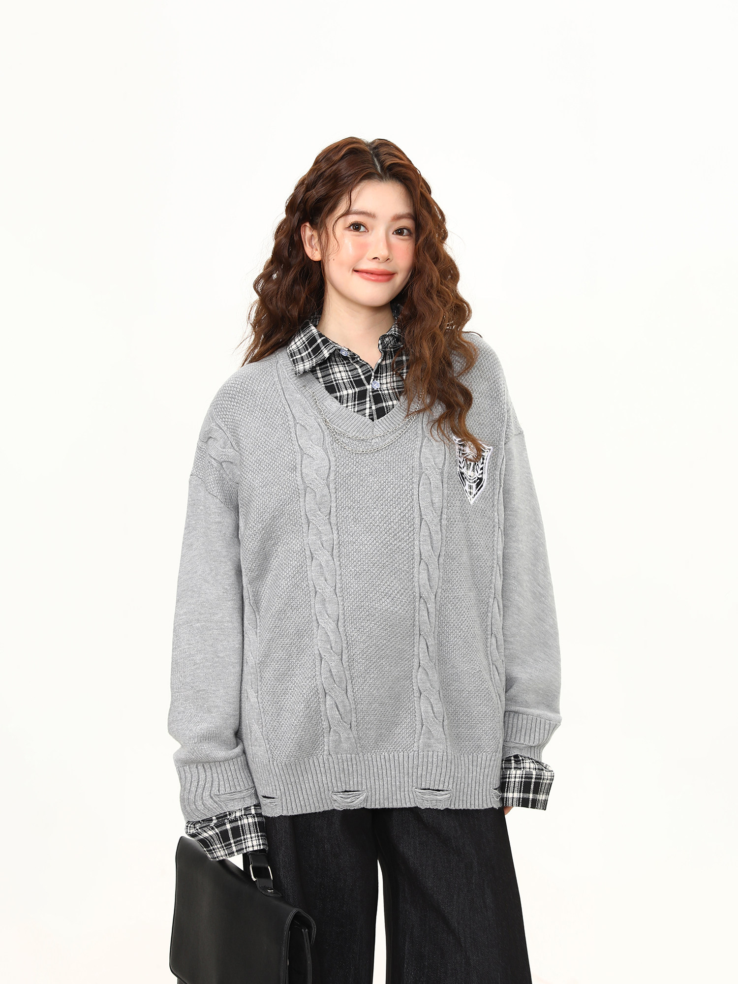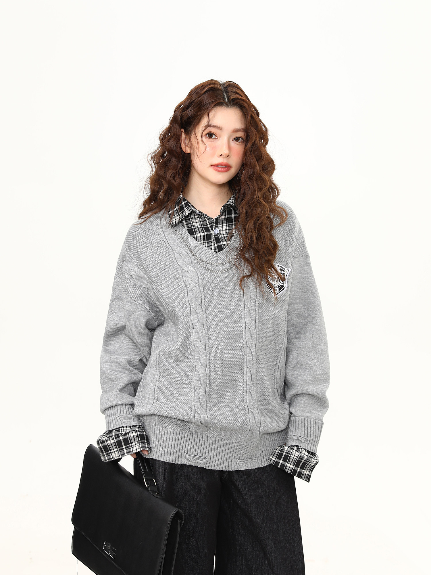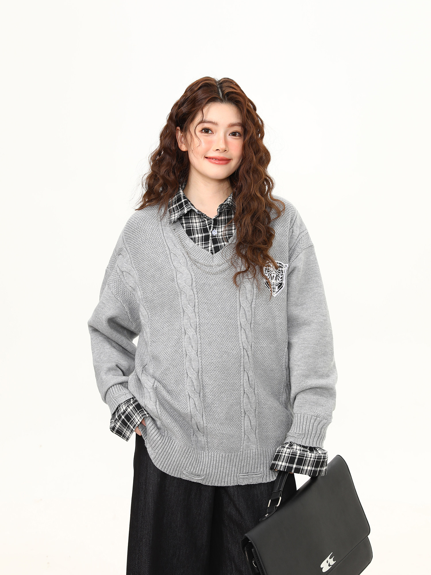 美式復古格子拼接假兩件針織衫毛衣女春秋學院風上衣
