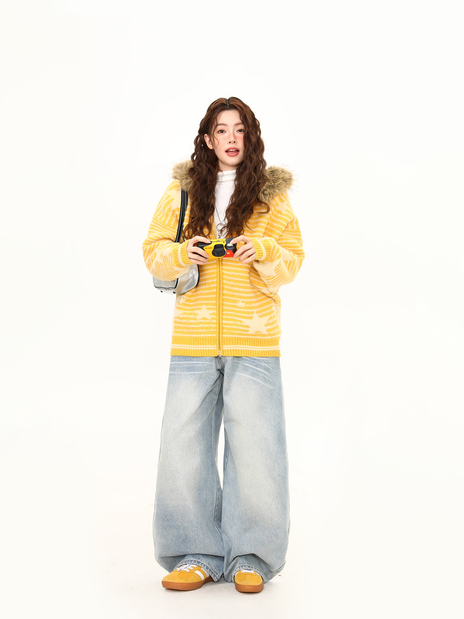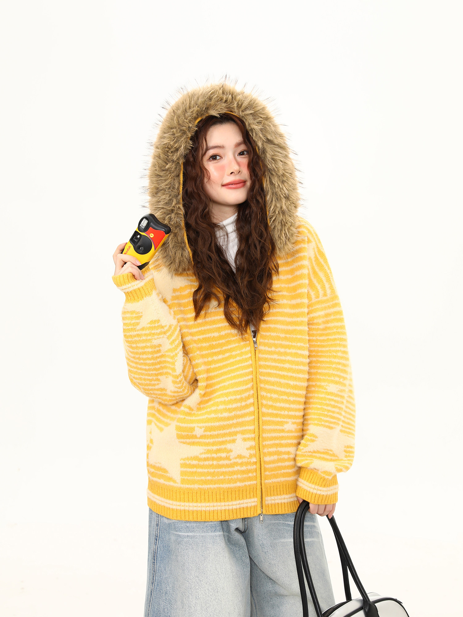 美式復古條紋星星毛領加厚連帽毛衣女秋冬開衫外套保暖