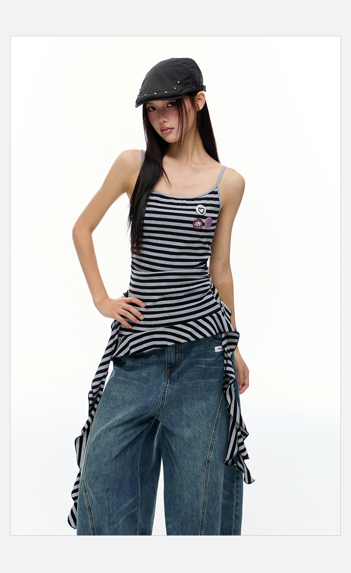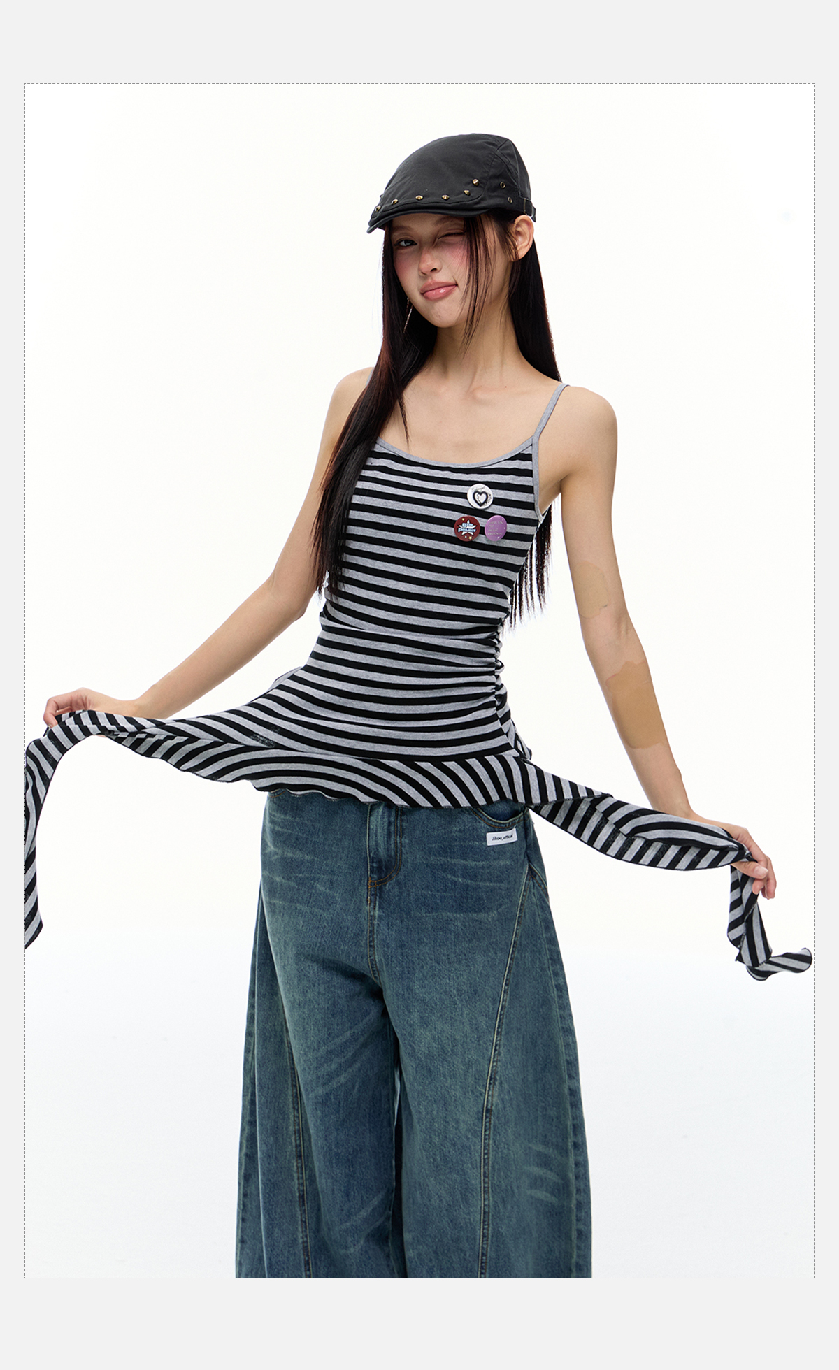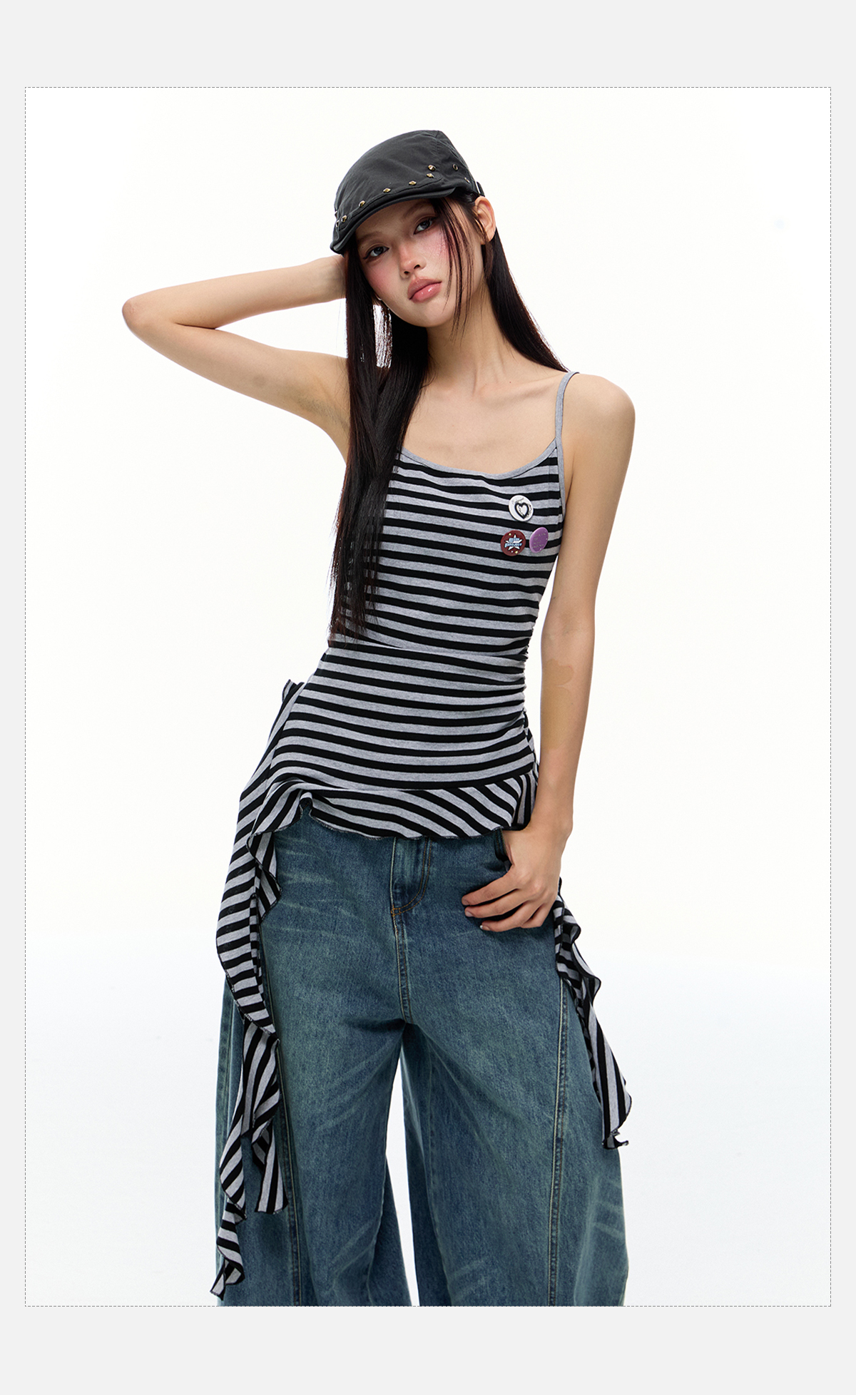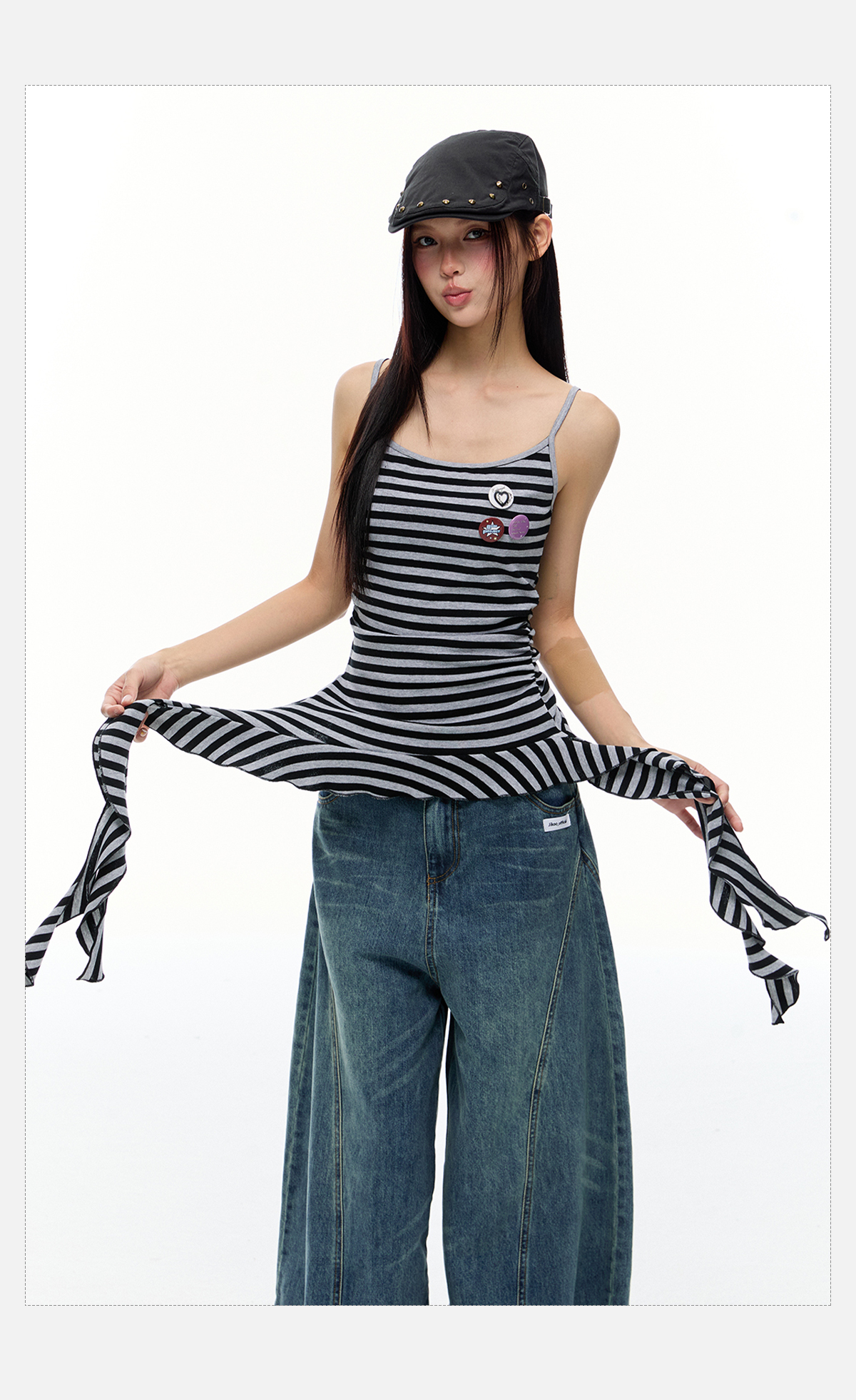 美式復古黑色流蘇飄帶條紋吊帶背心夏季新款辣妹修身顯瘦上衣