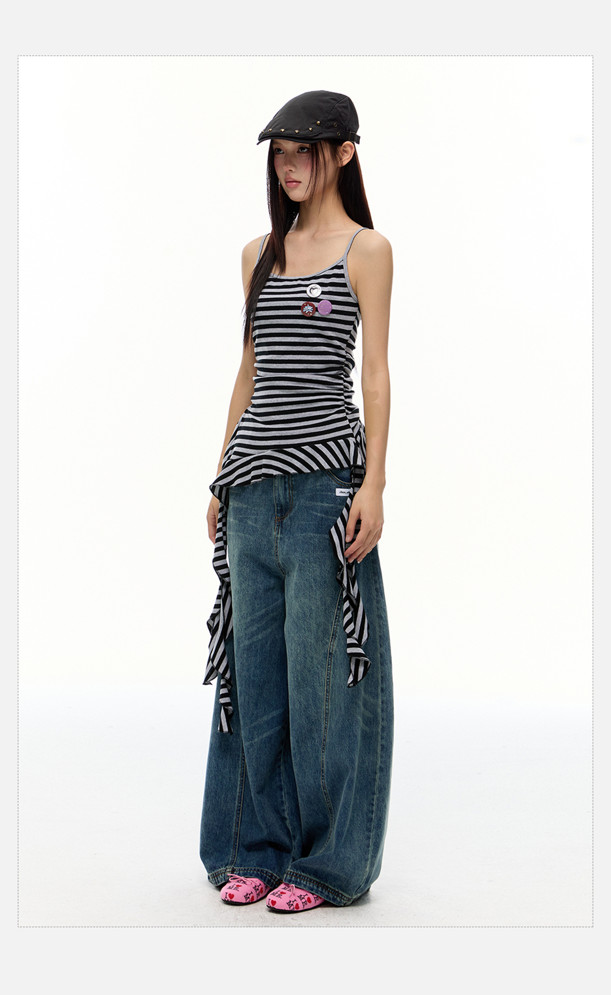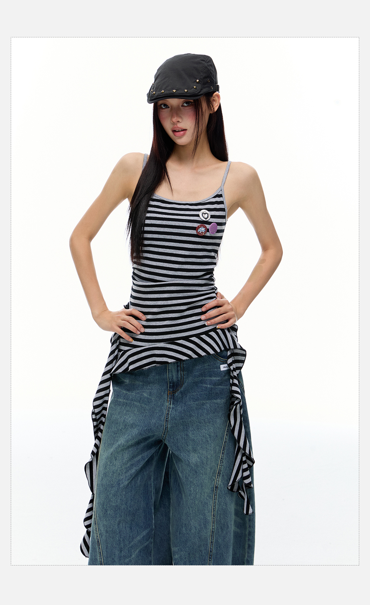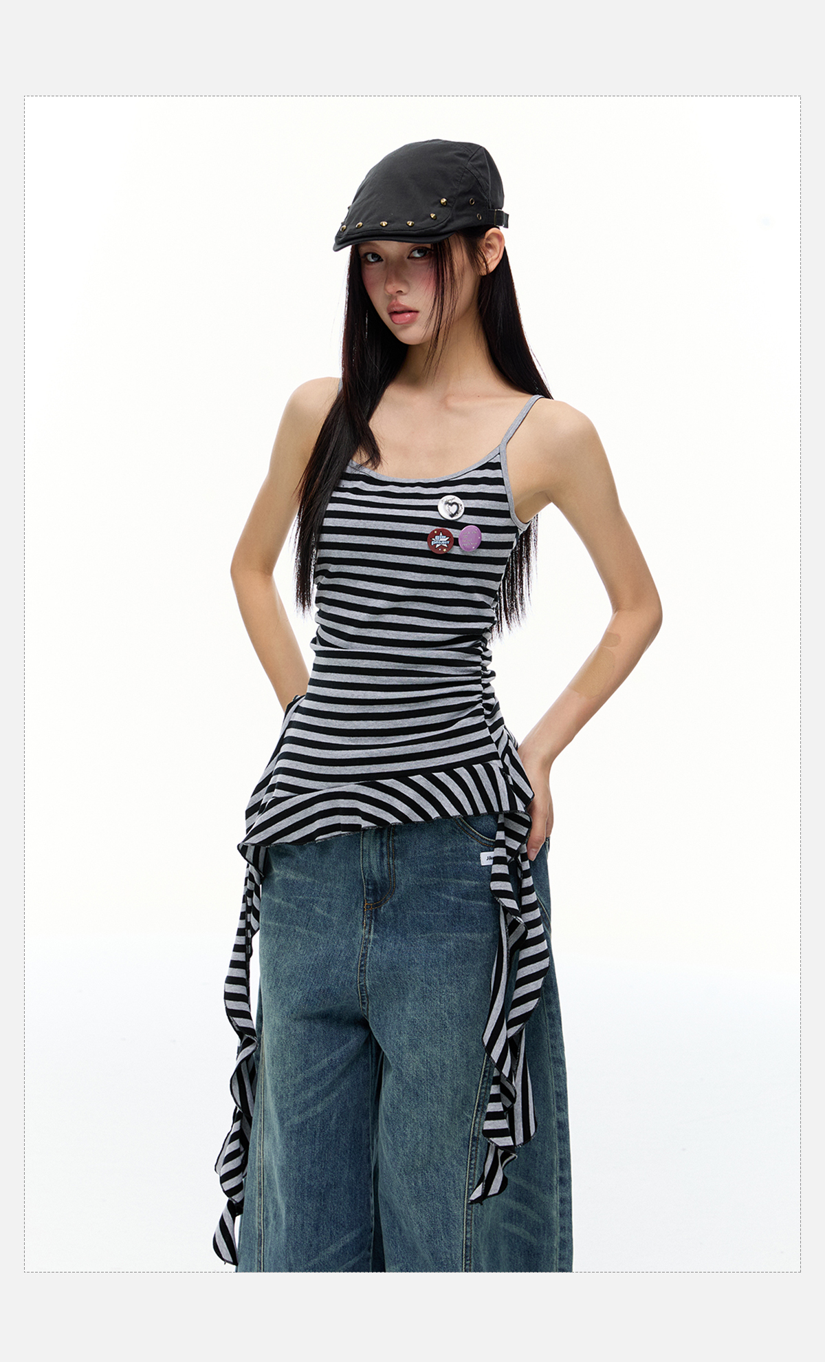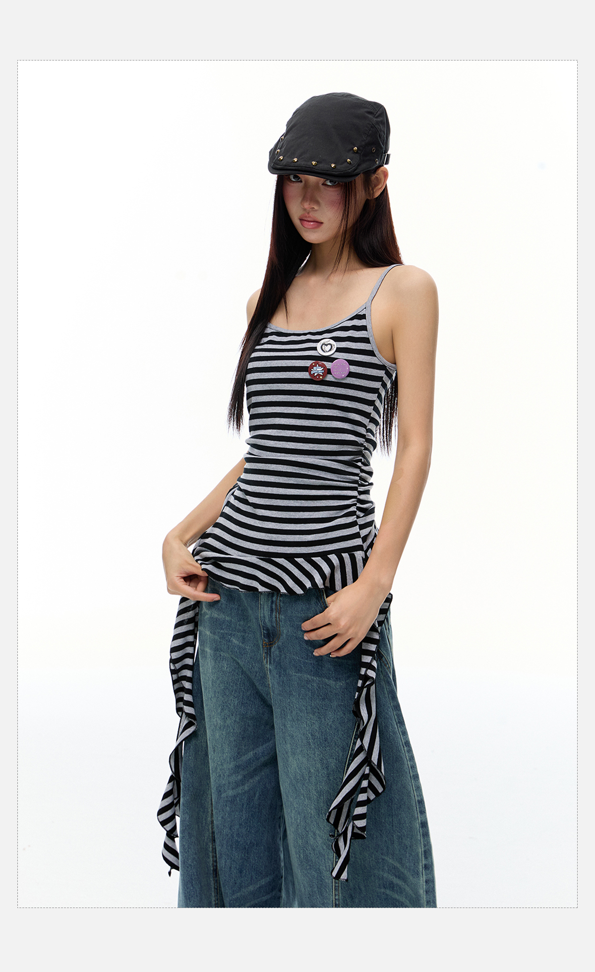 美式復古黑色流蘇飄帶條紋吊帶背心夏季新款辣妹修身顯瘦上衣