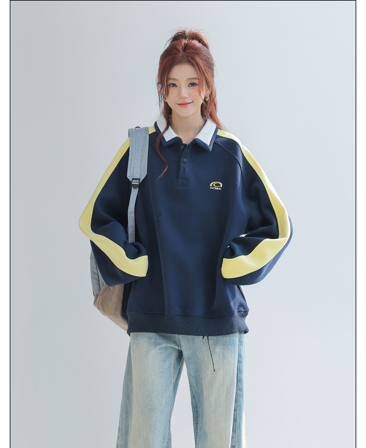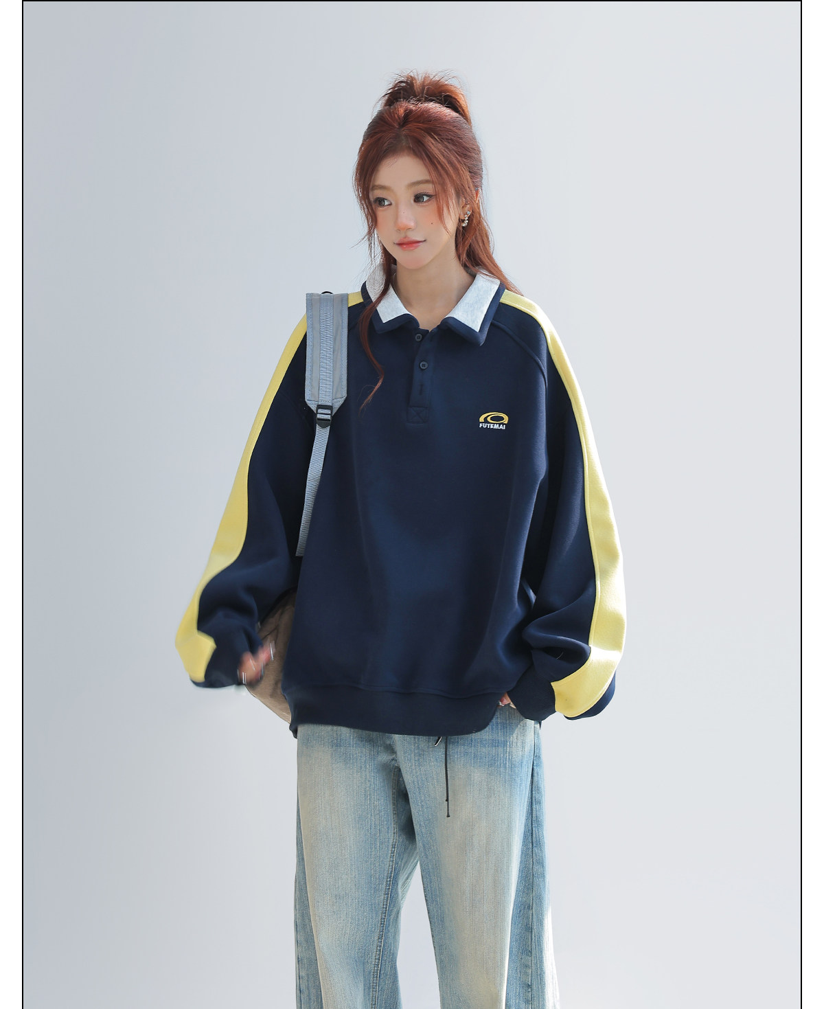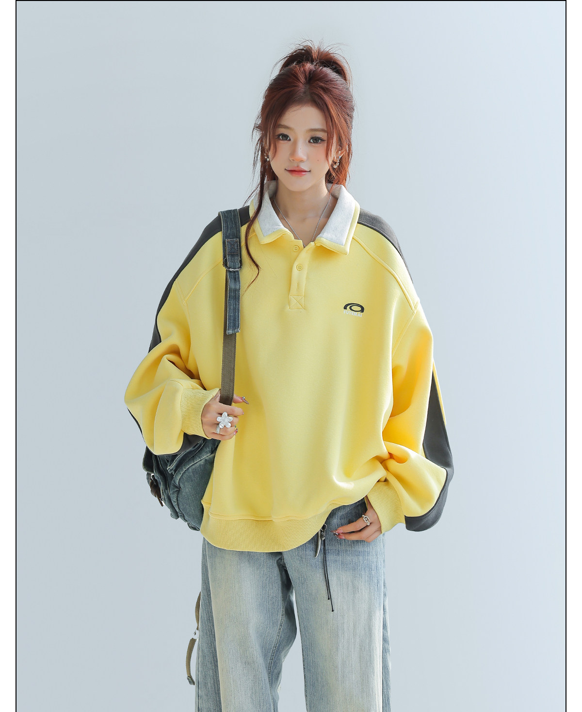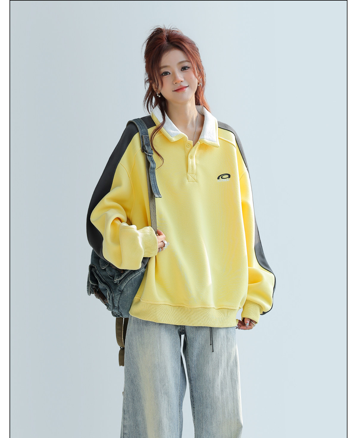 美式慵懶chic拼接翻領衛衣女款新款寬鬆上衣