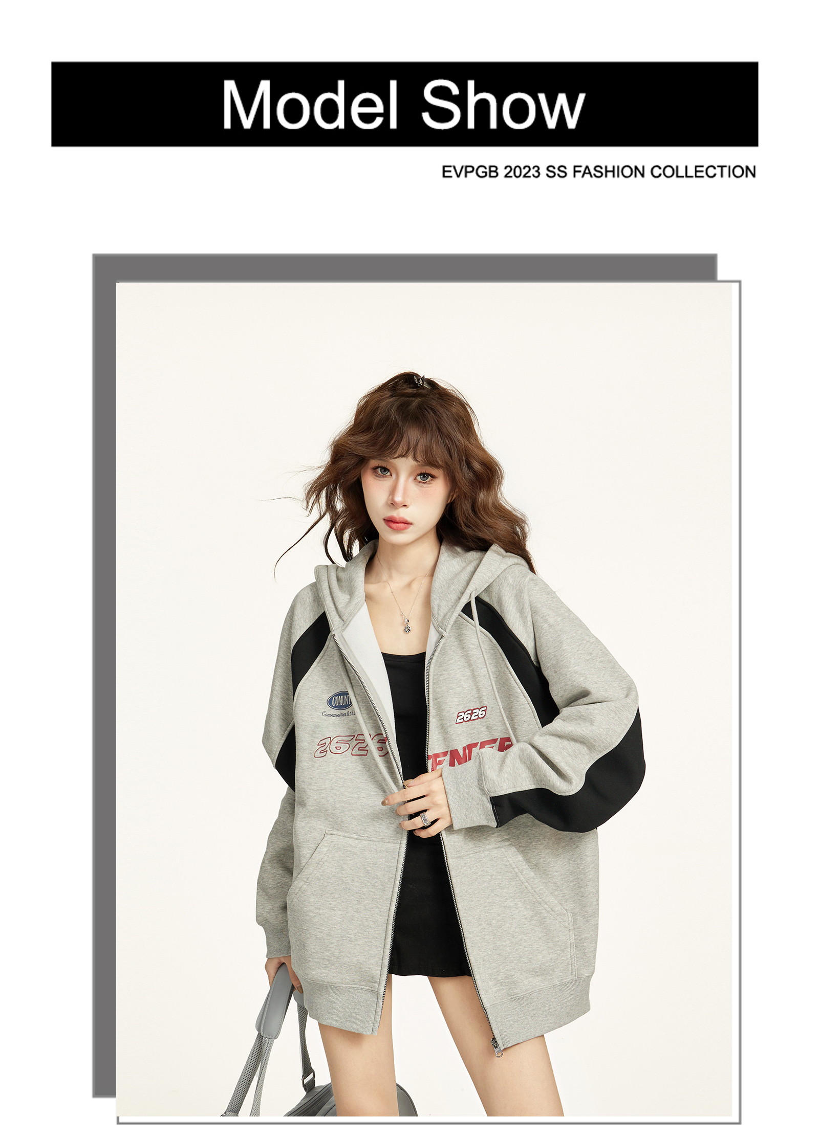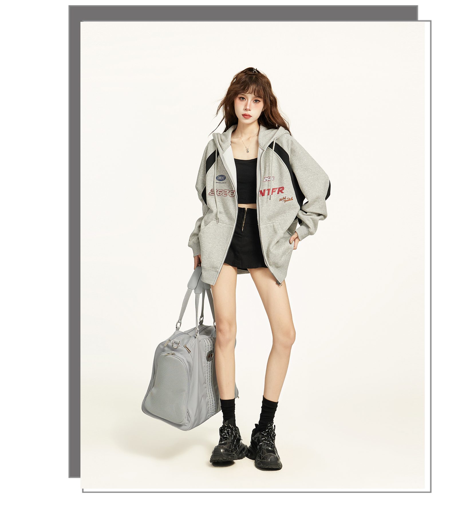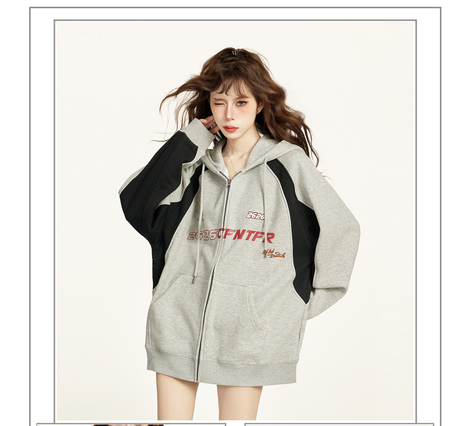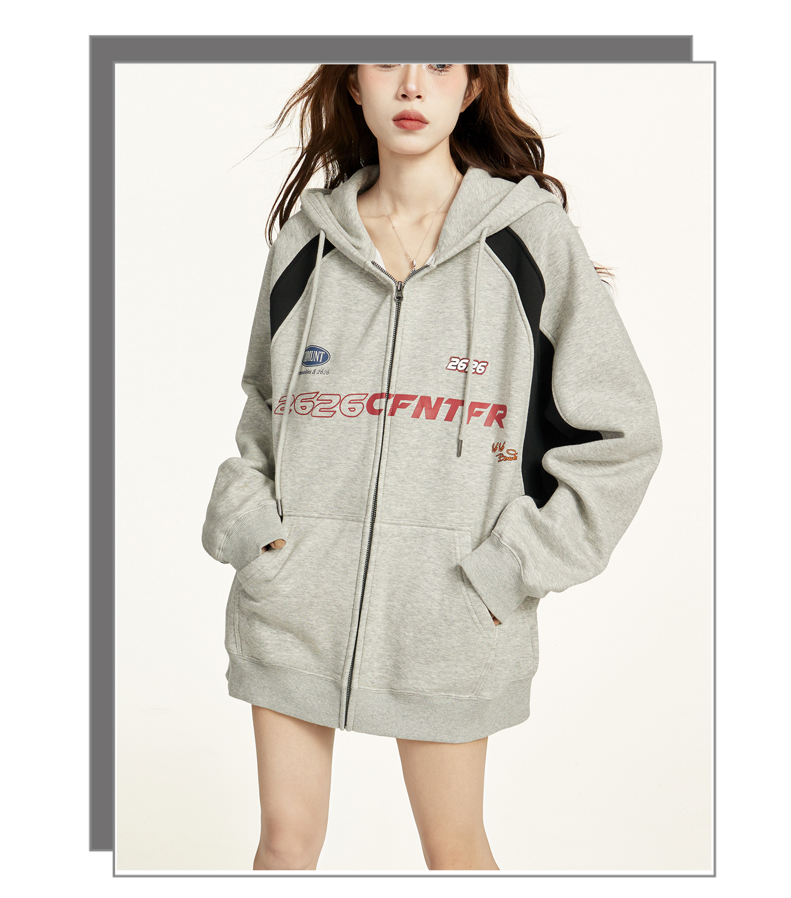 美式灰色拉鍊連帽衛衣外套女秋冬寬鬆慵懶風加絨加厚開衫