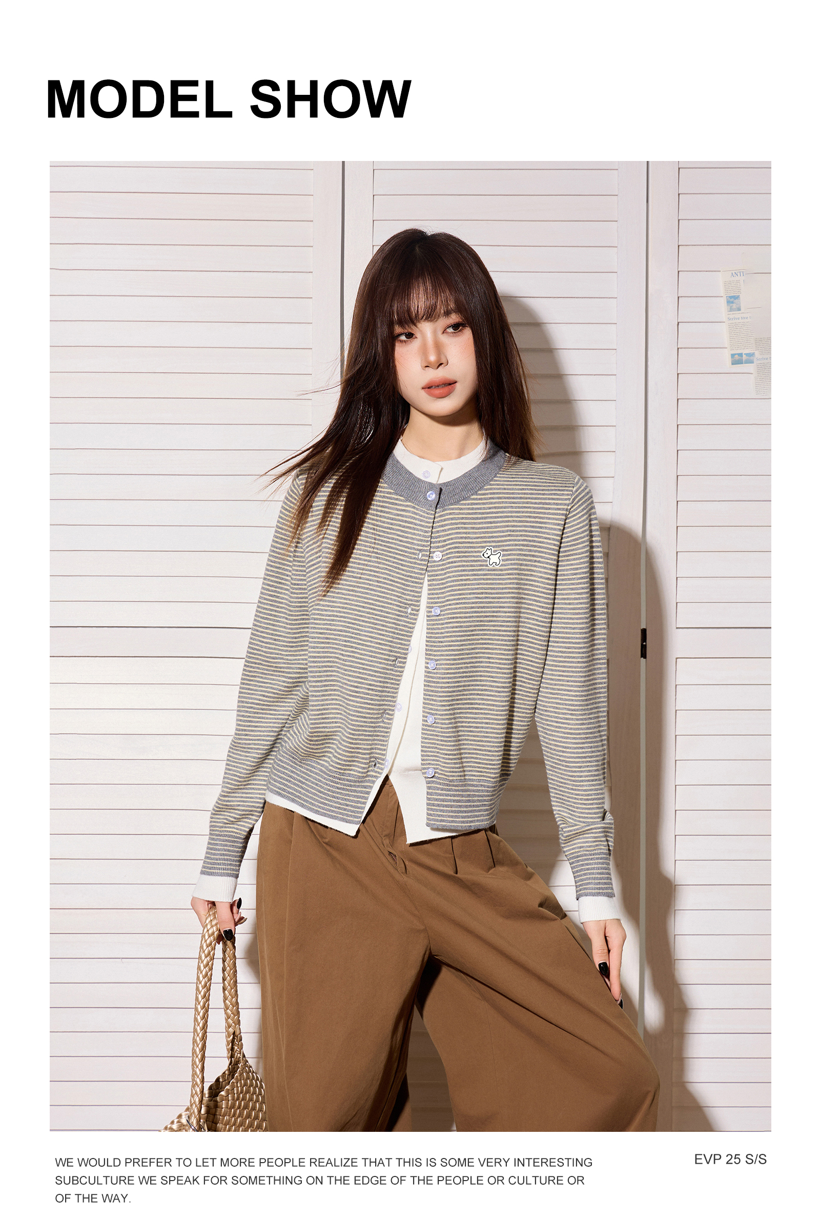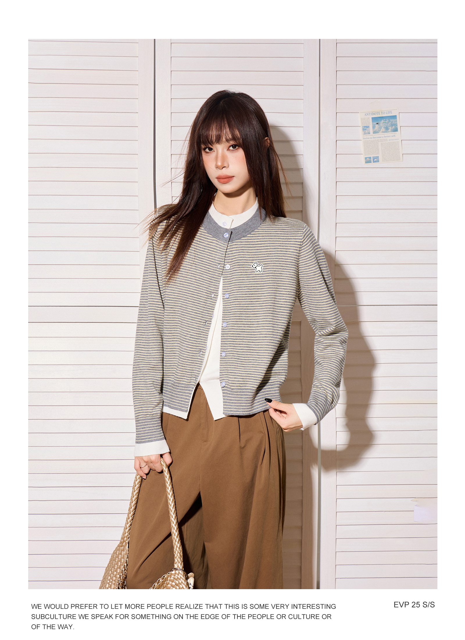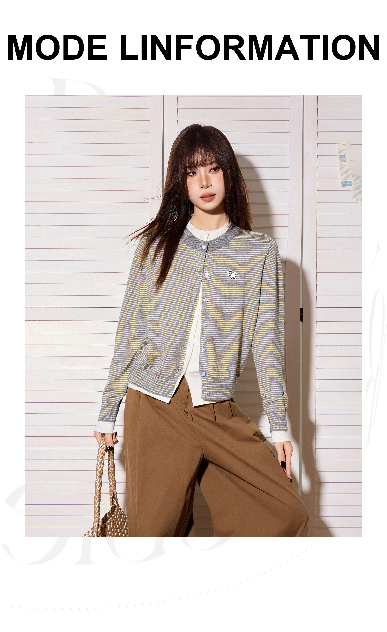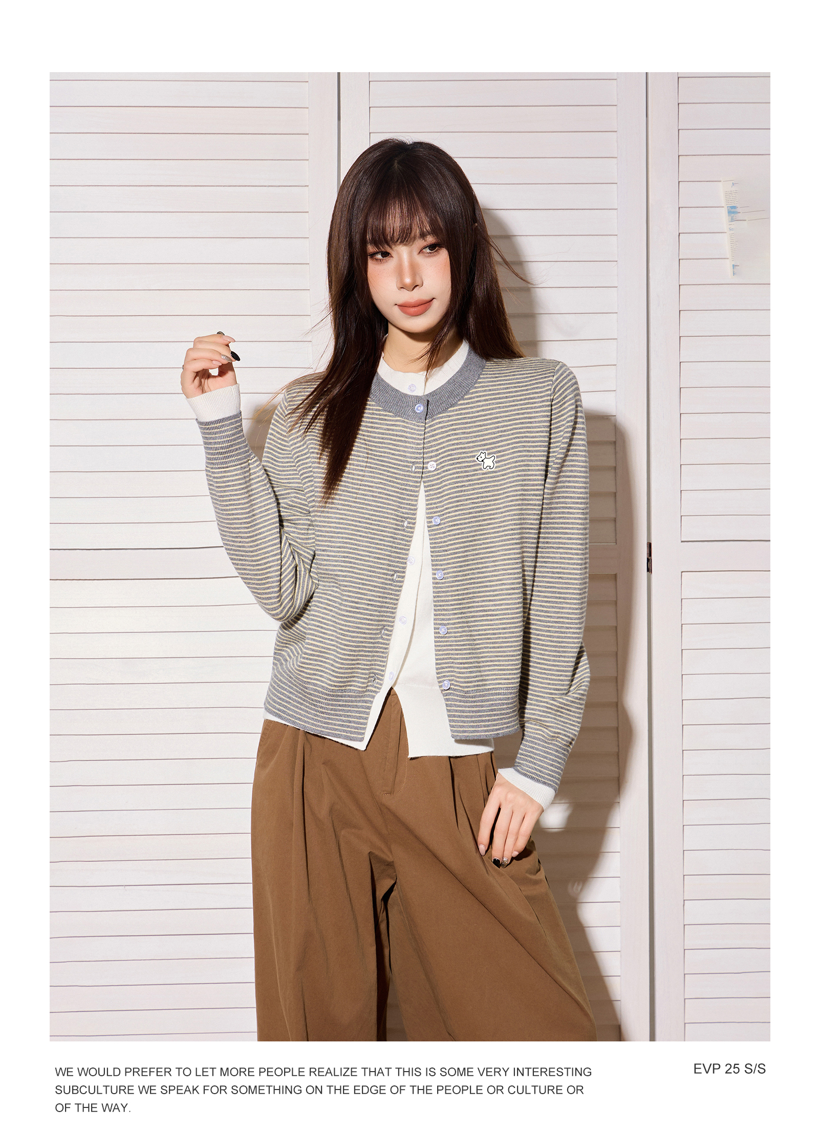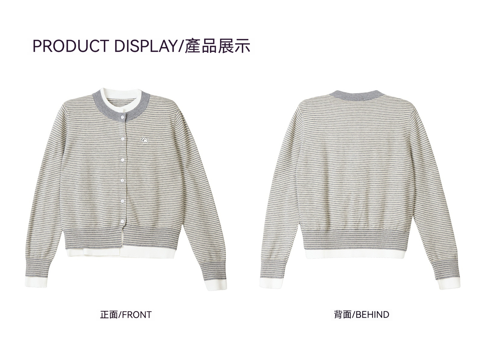 美式灰色條紋假兩件長袖針織開衫毛衣女秋冬短款內搭打底外套上衣