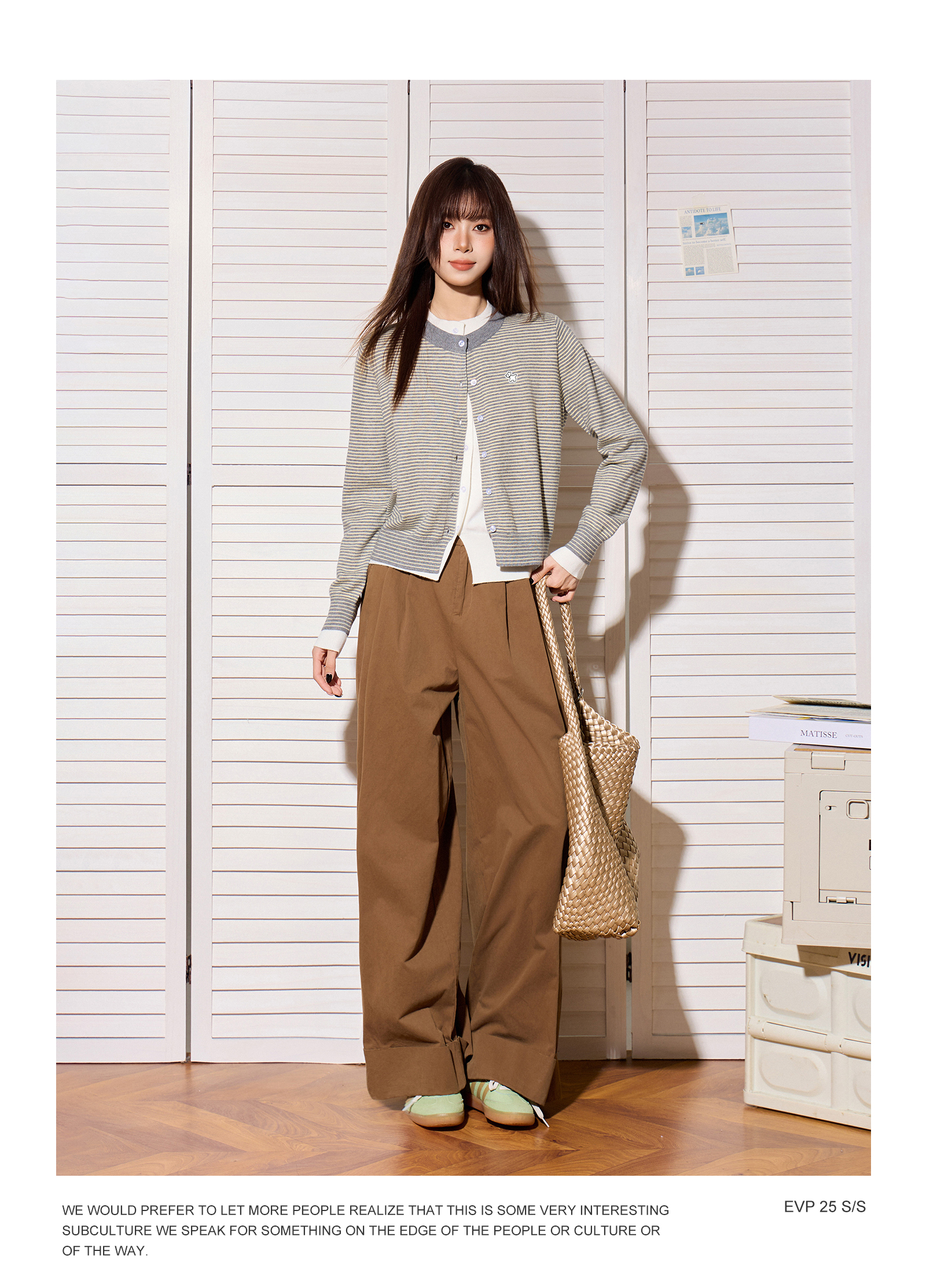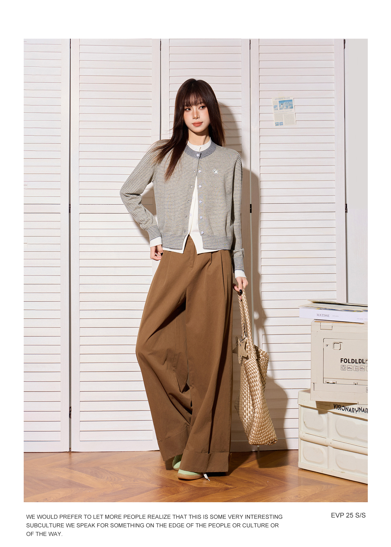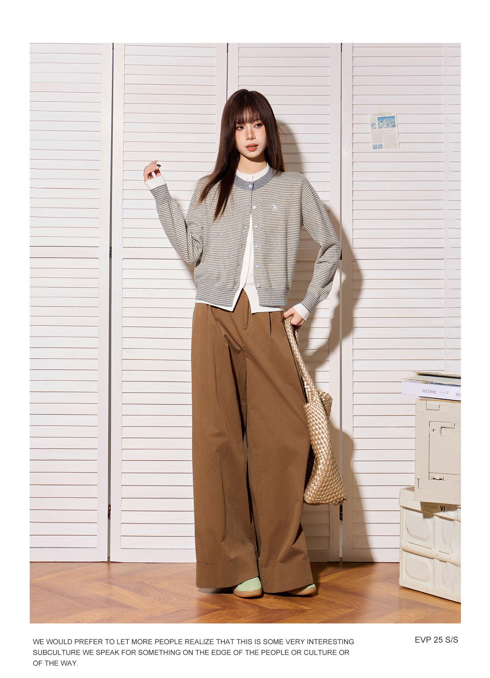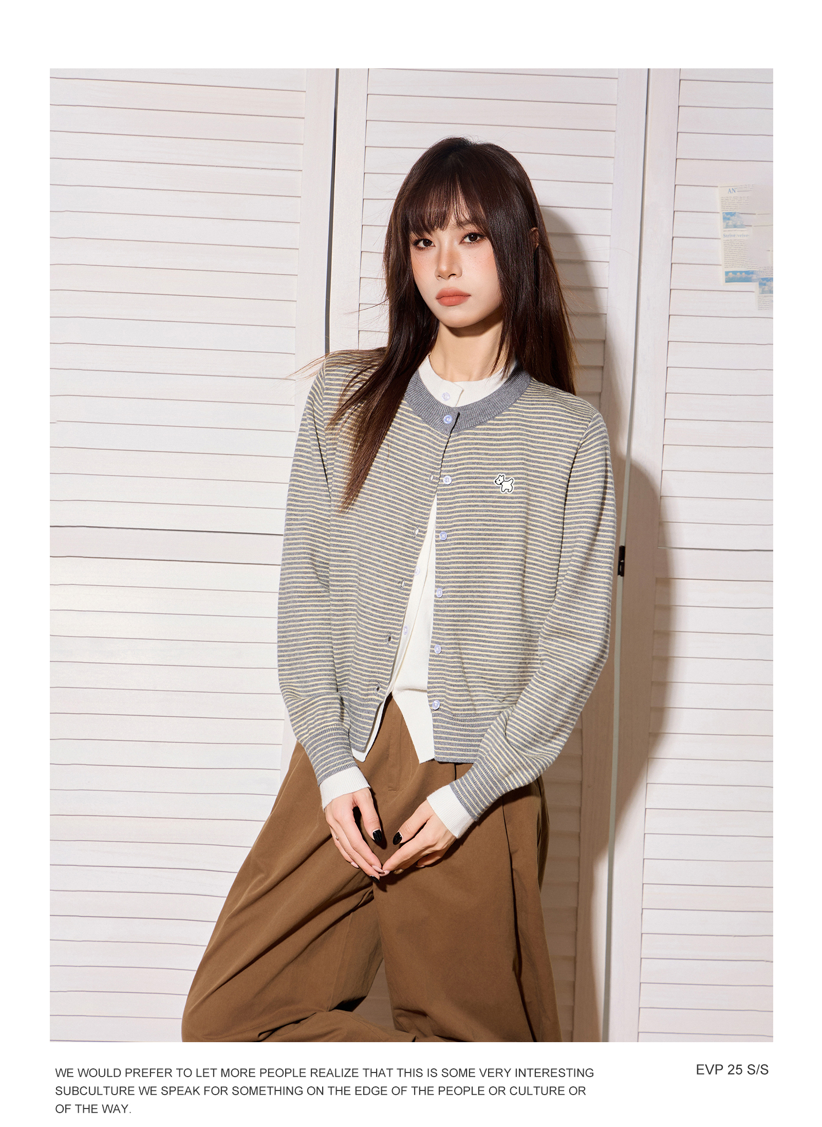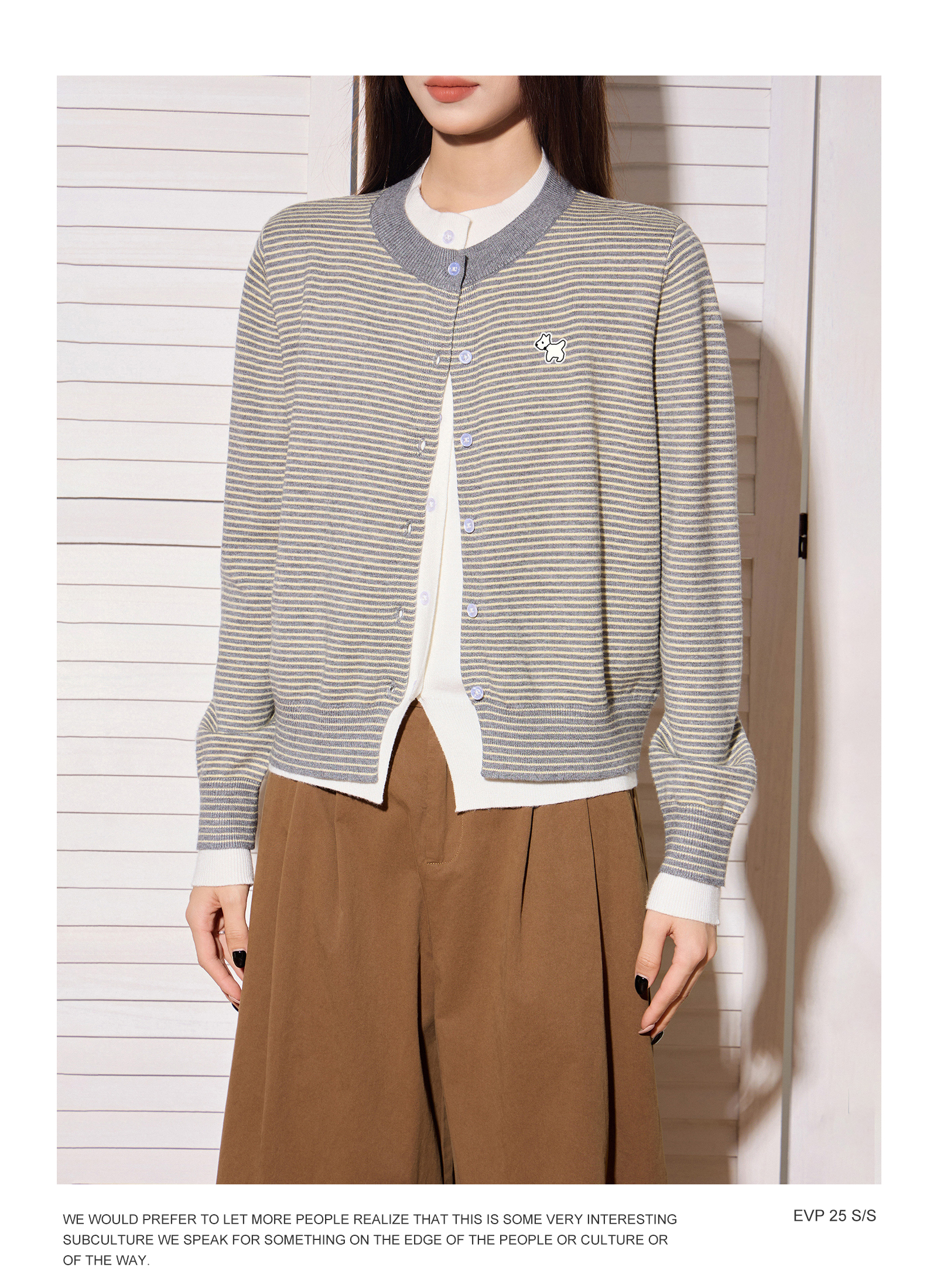 美式灰色條紋假兩件長袖針織開衫毛衣女秋冬短款內搭打底外套上衣