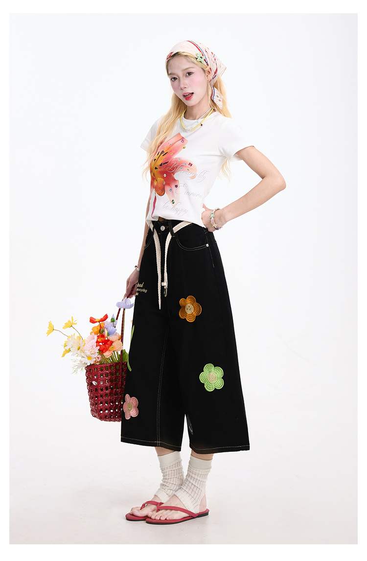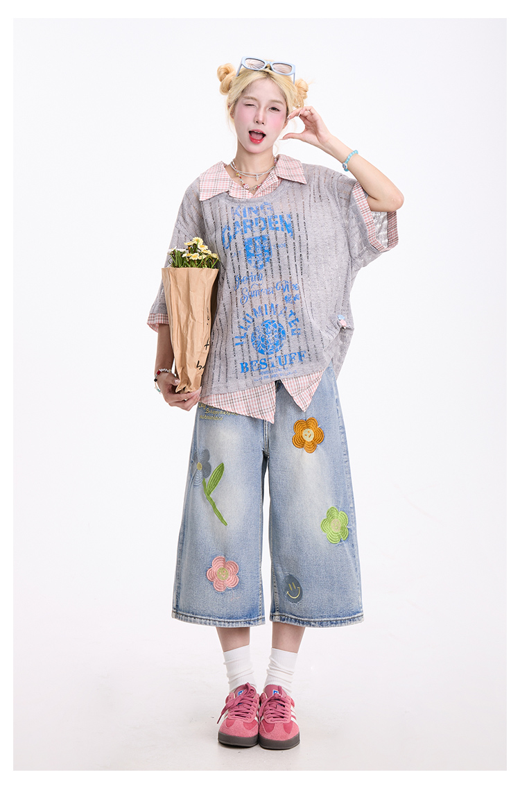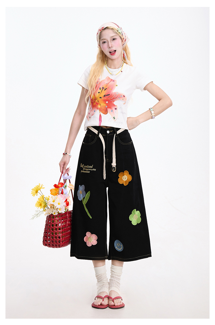 花朵刺繡藍色牛仔七分褲女美式復古慵懶小眾直筒夏季短褲