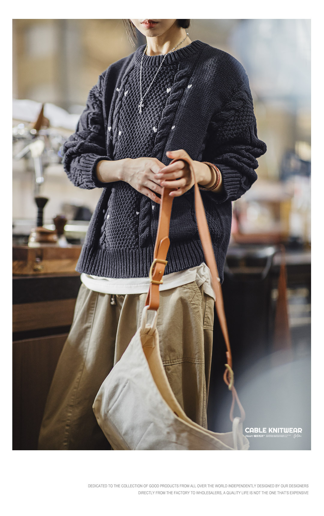 藍色圓領寬鬆加厚保暖套頭外穿粗麻花毛線針織上毛衣女士秋冬