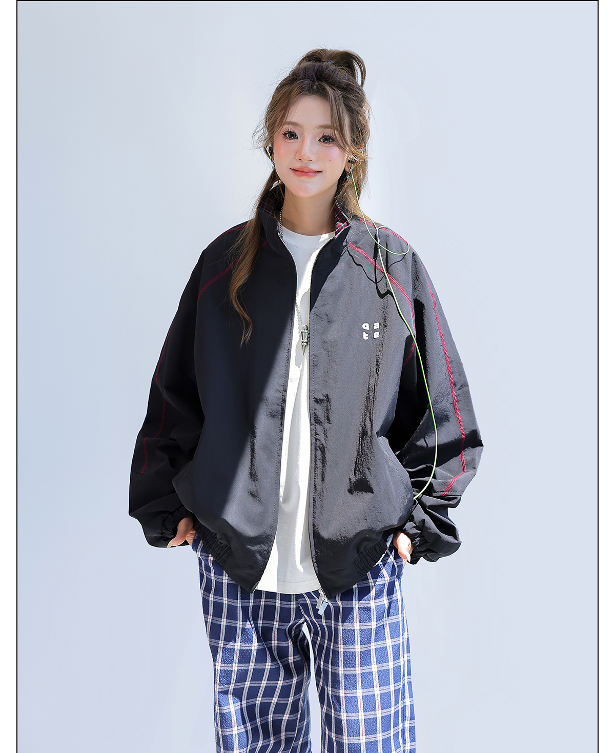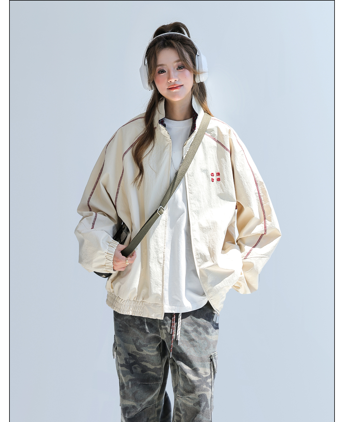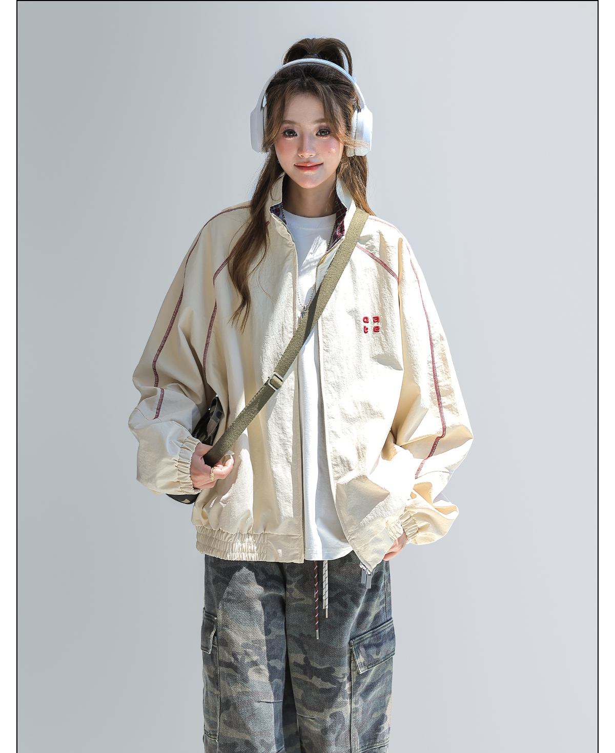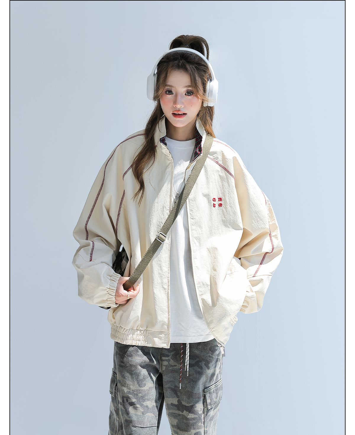 2025新款美式復古撞色拼接寬鬆立領休閒夾克女