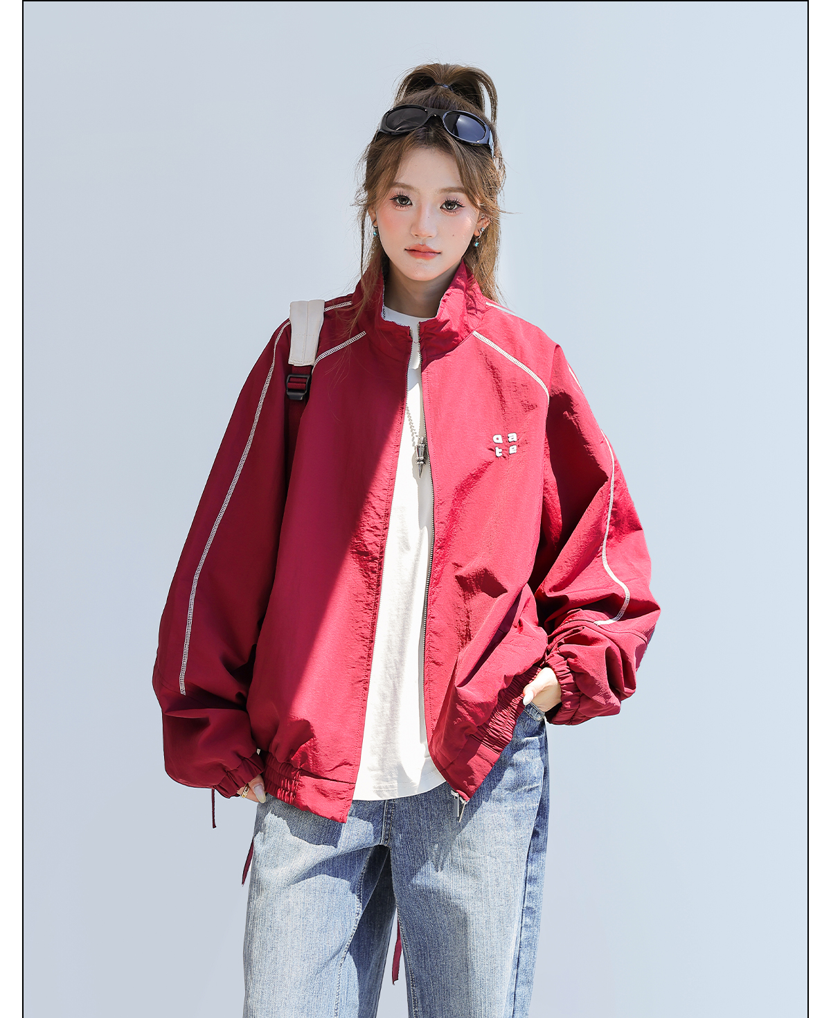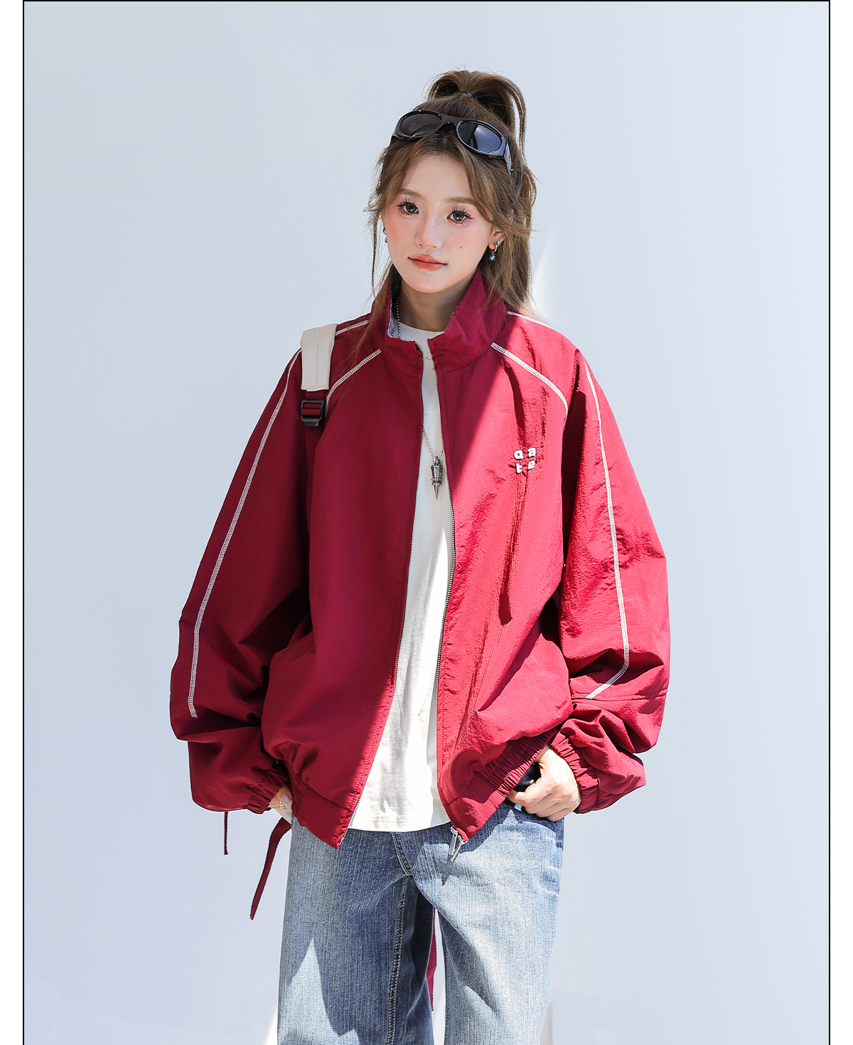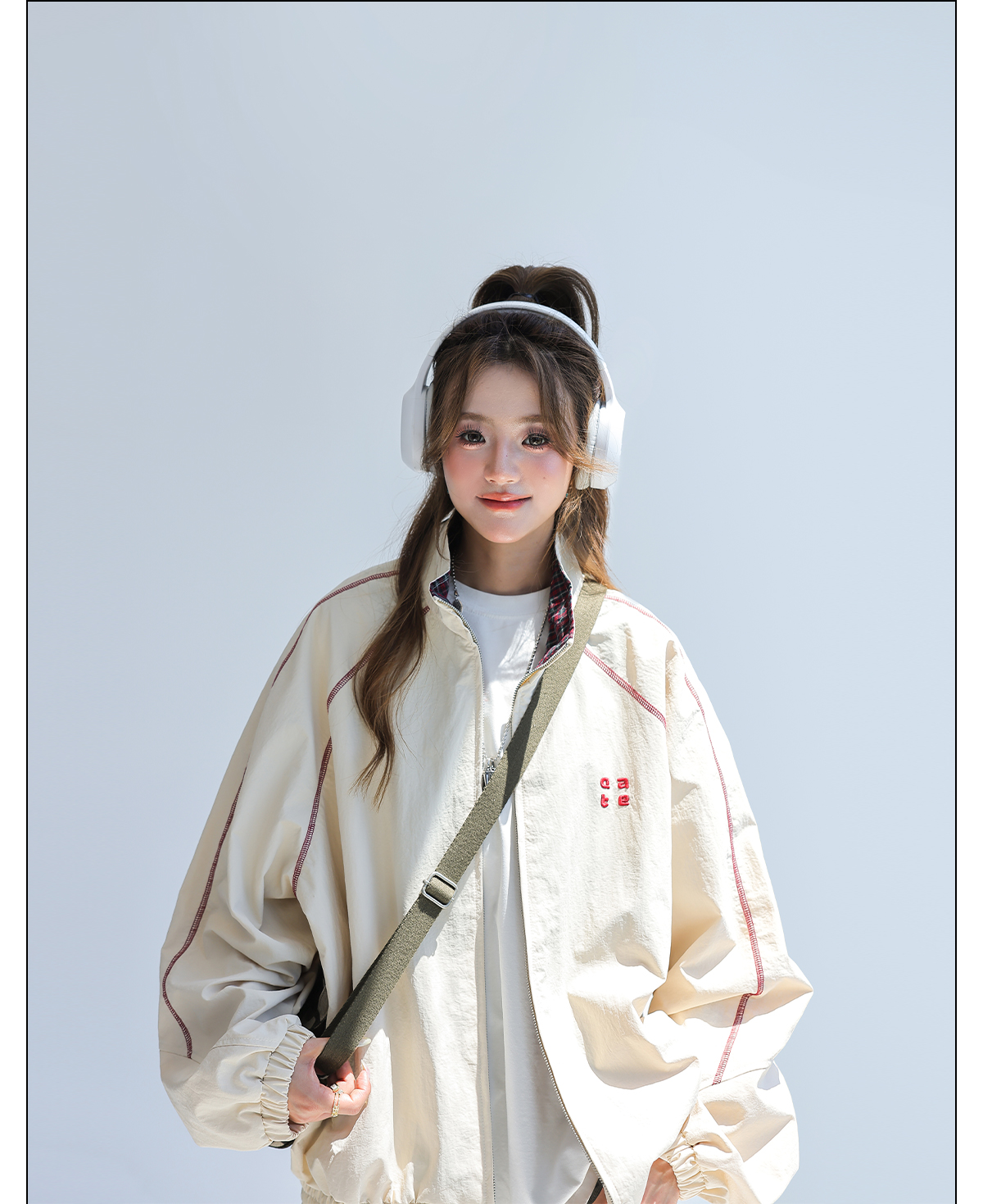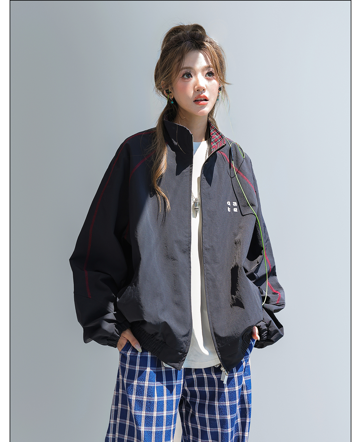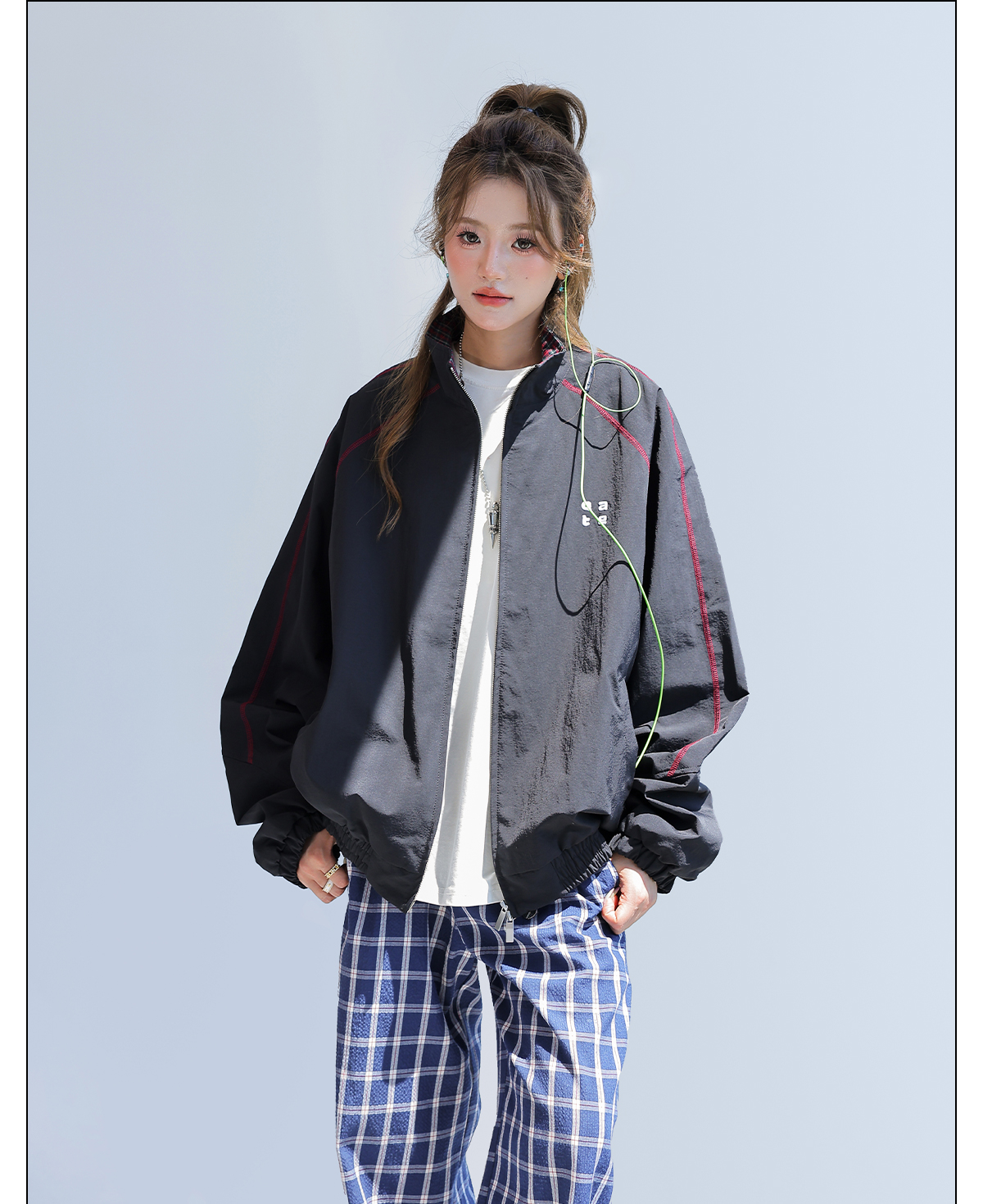 2025新款美式復古撞色拼接寬鬆立領休閒夾克女
