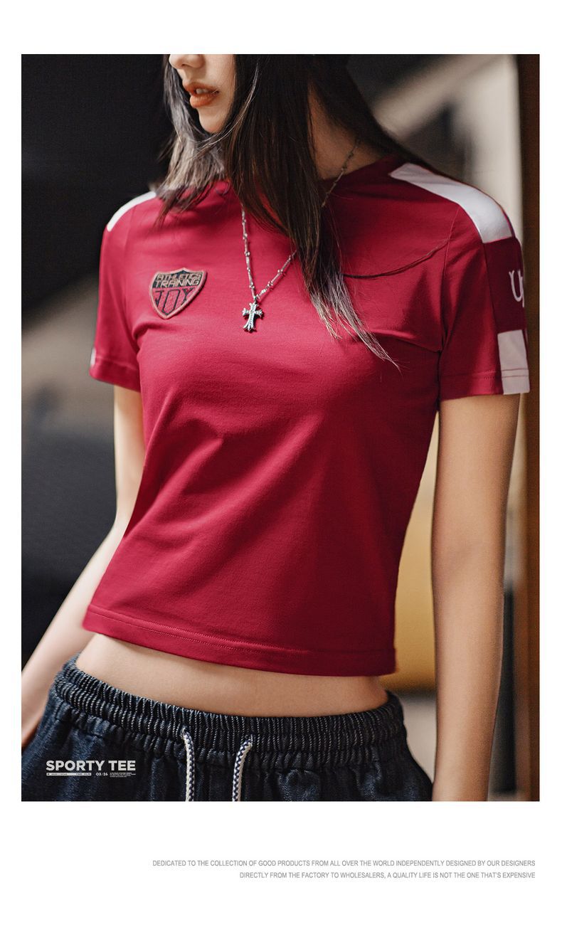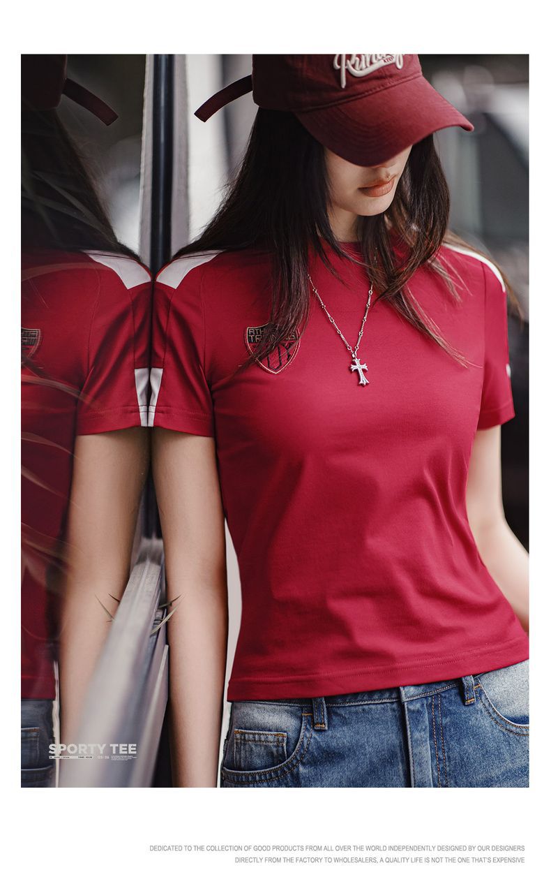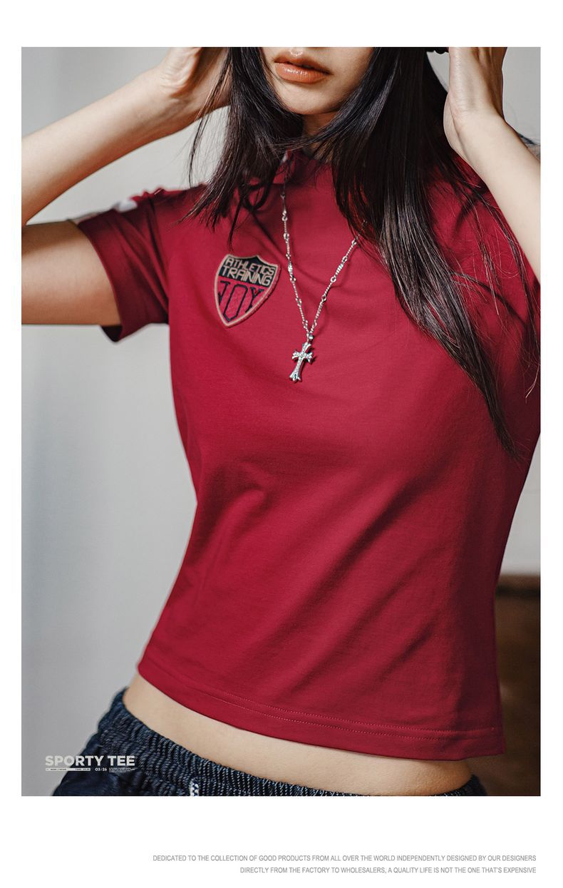 勃艮第紅美式復古運動短袖球衣休閒通勤修身足球寶貝上衣夏女