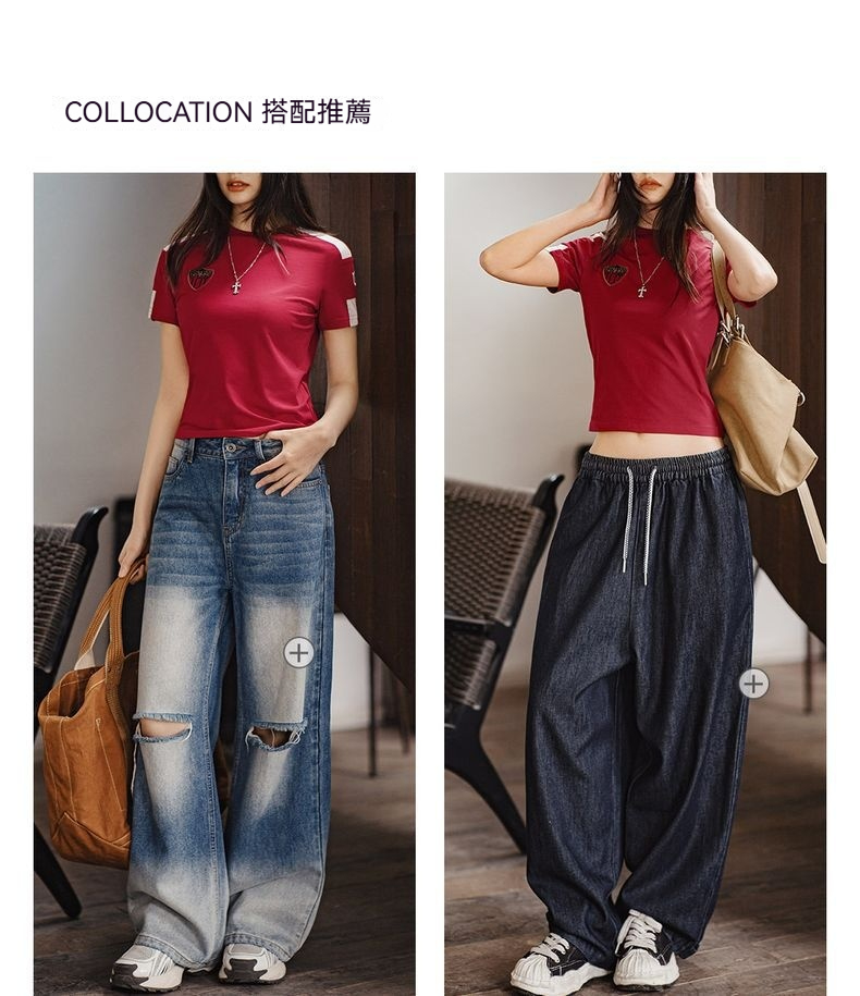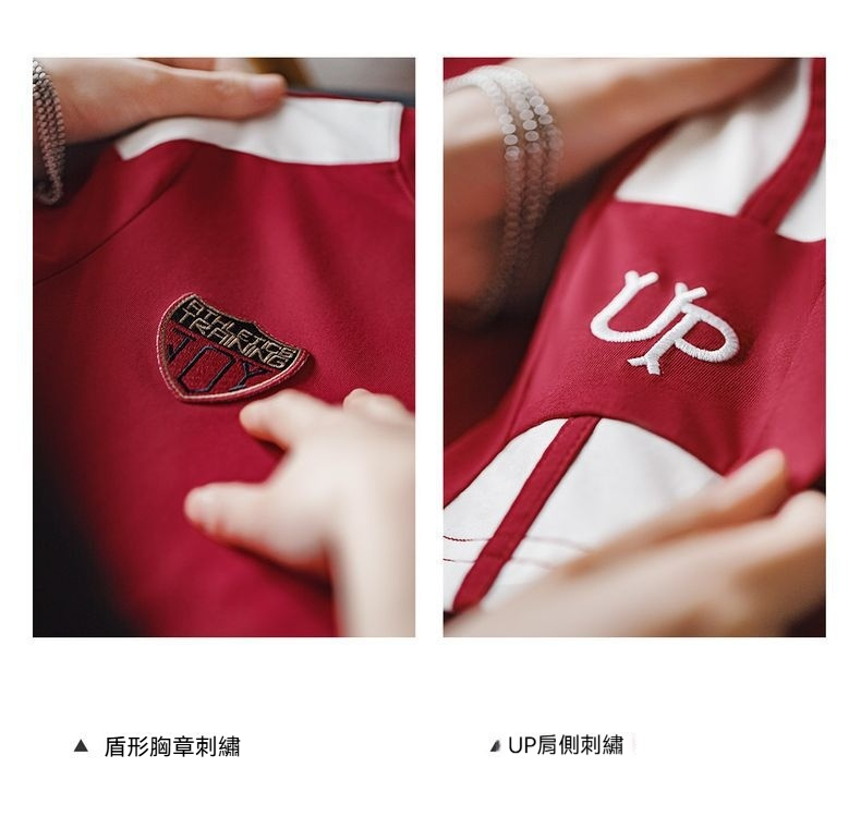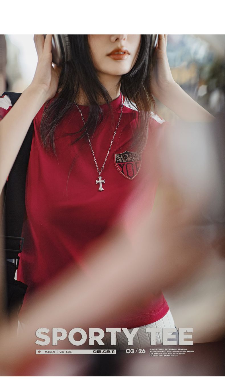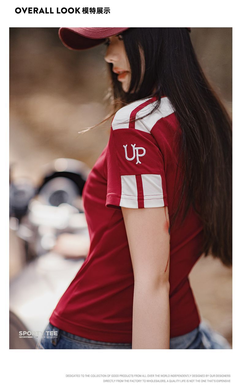勃艮第紅美式復古運動短袖球衣休閒通勤修身足球寶貝上衣夏女