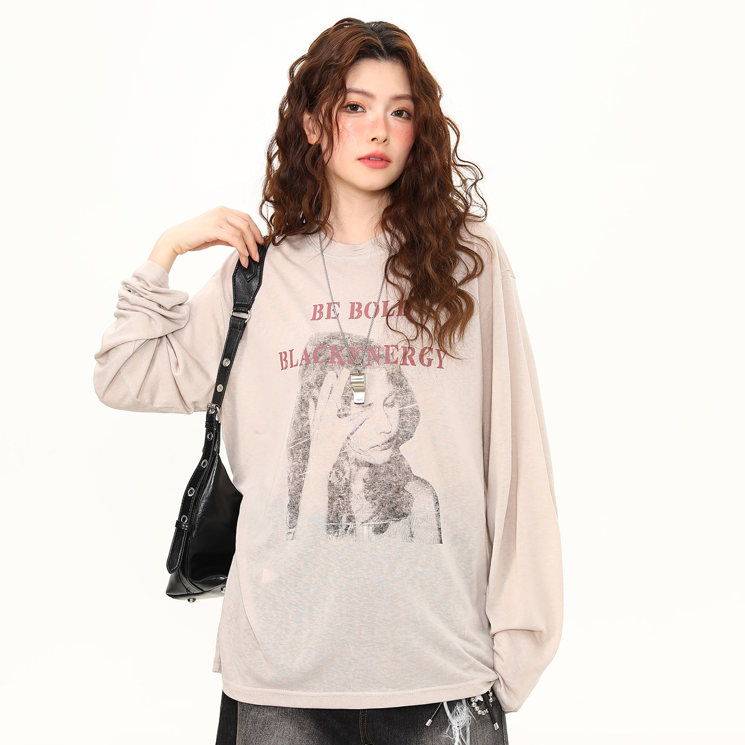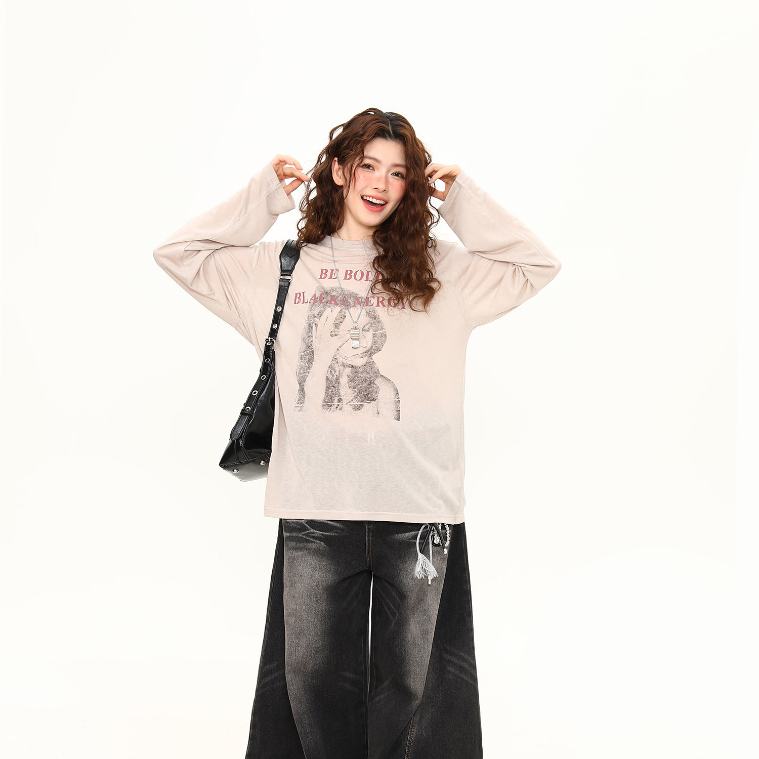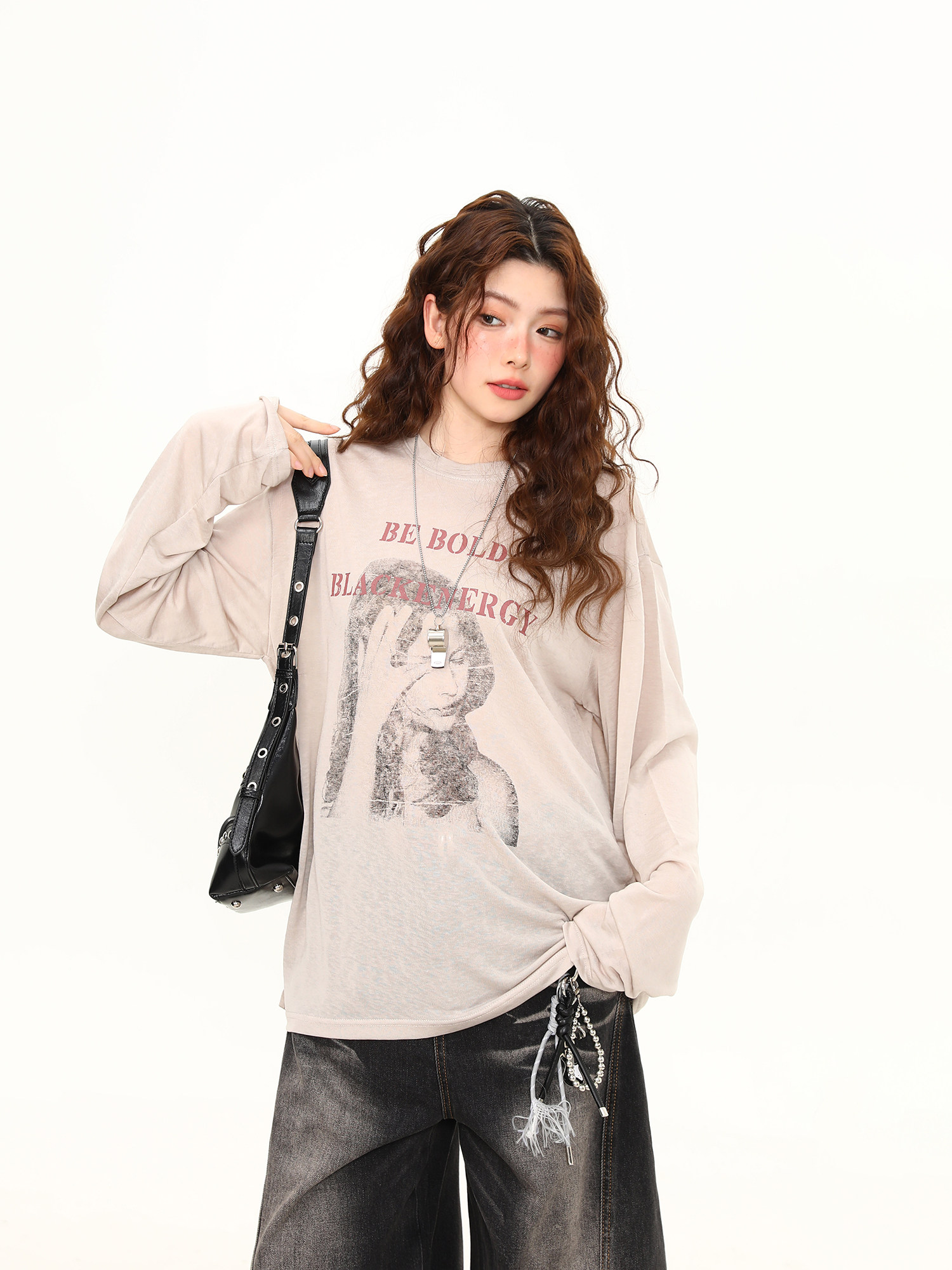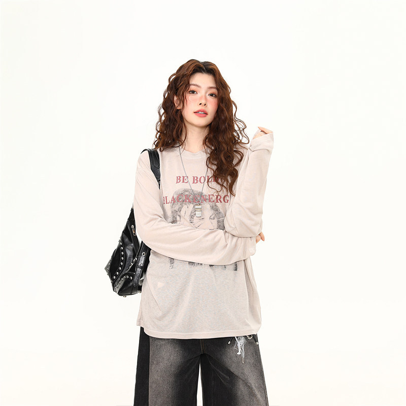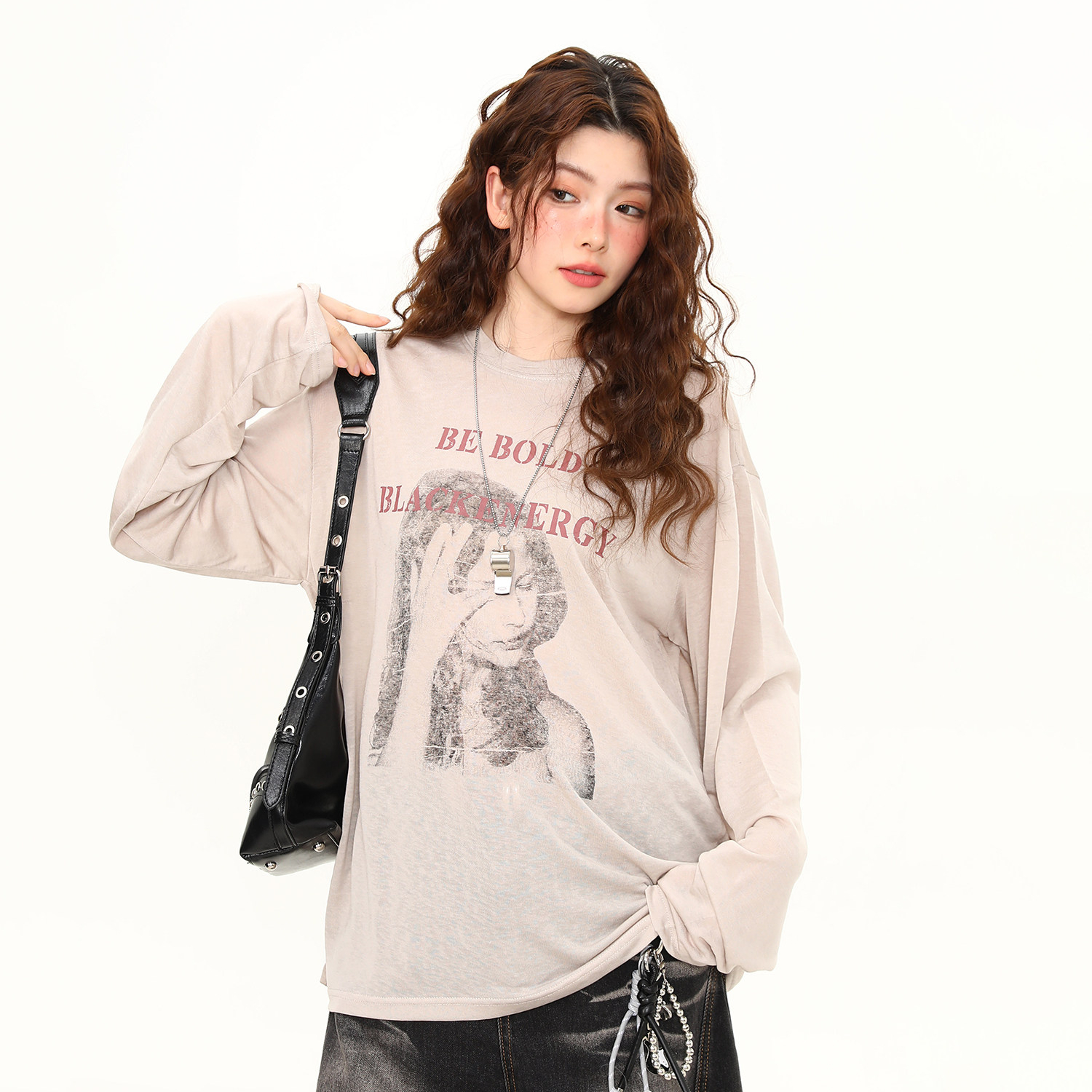 春夏新款模糊人像防曬罩衫女美式復古輕薄慵懶風長袖T恤