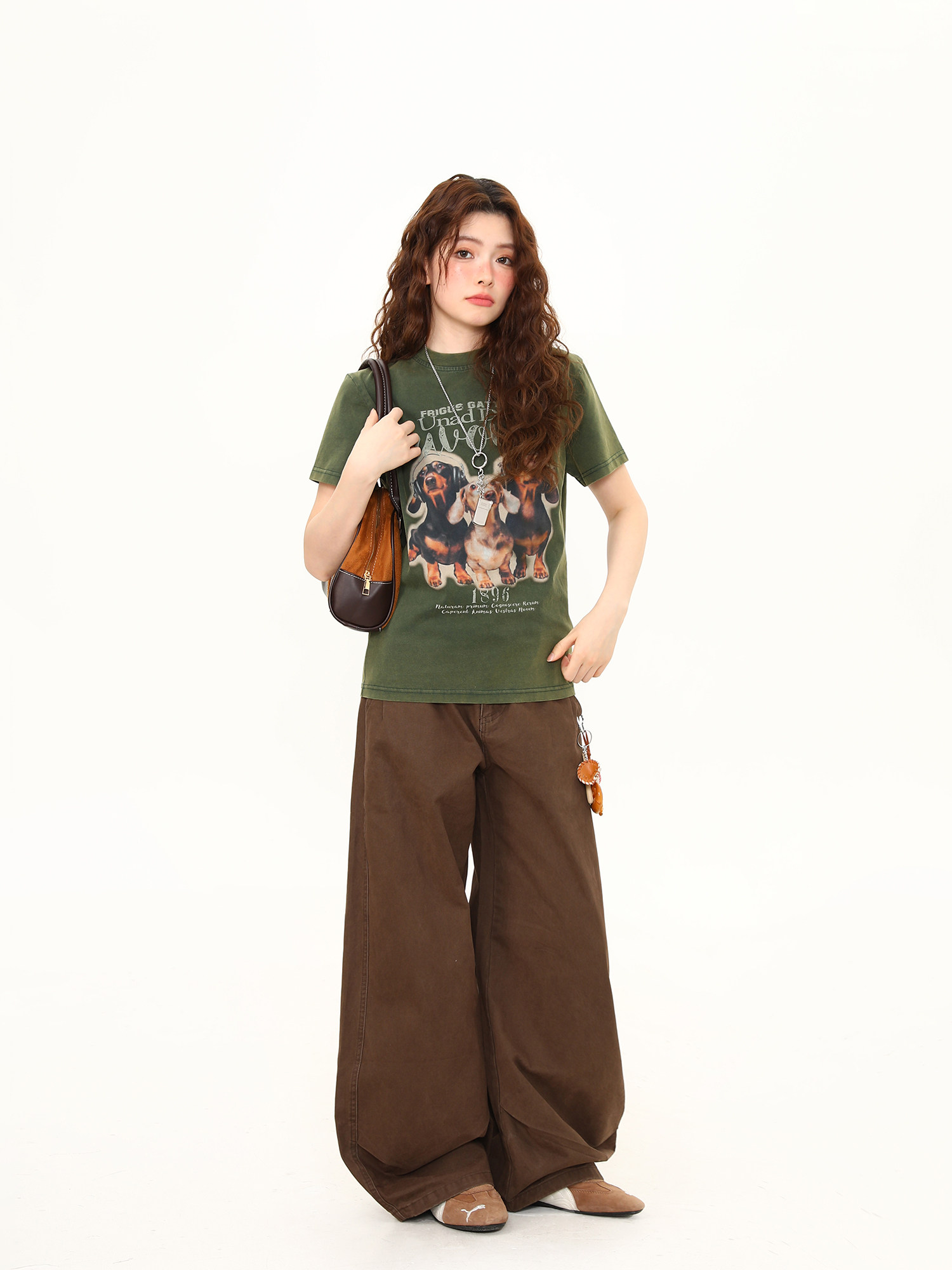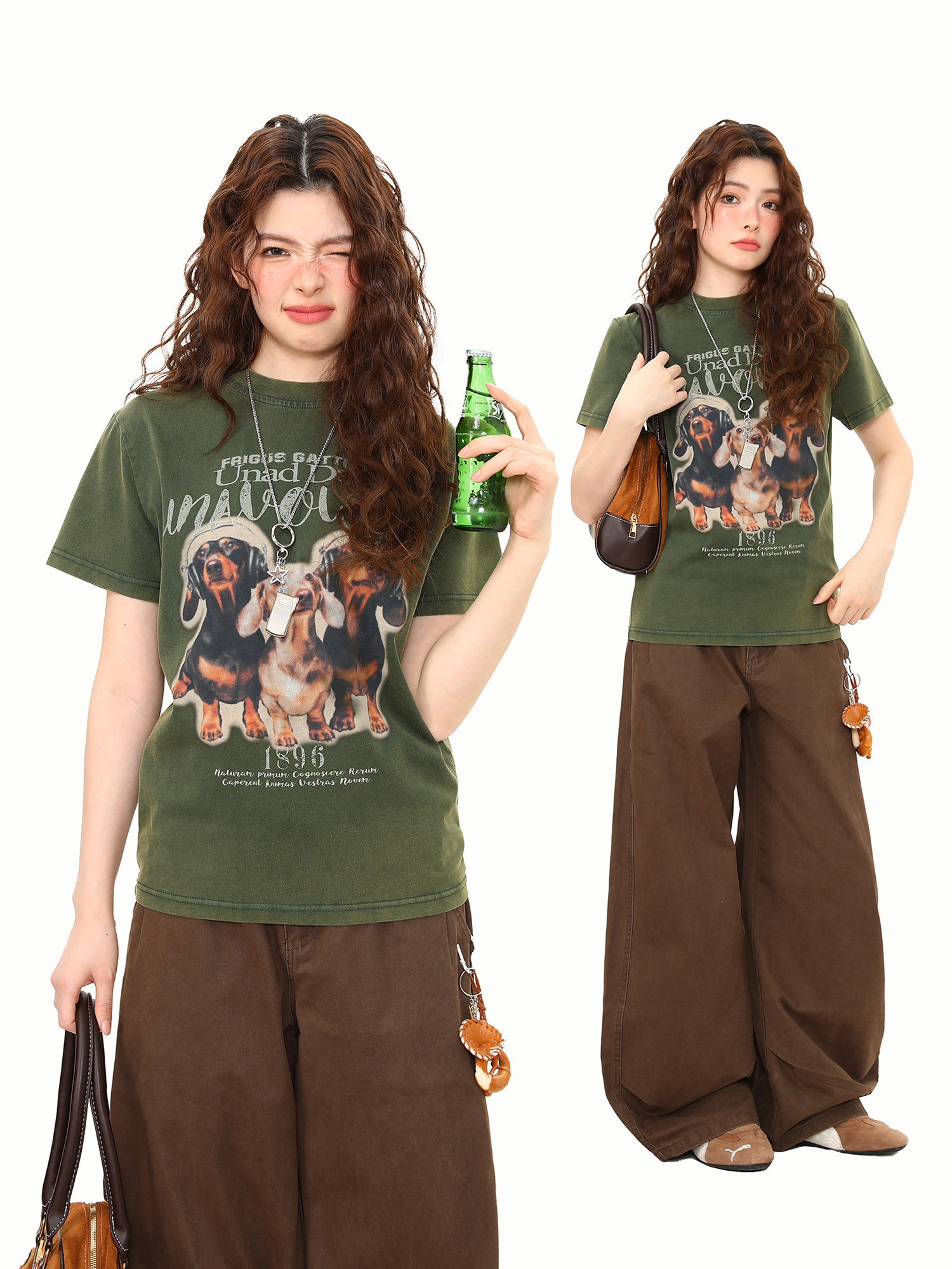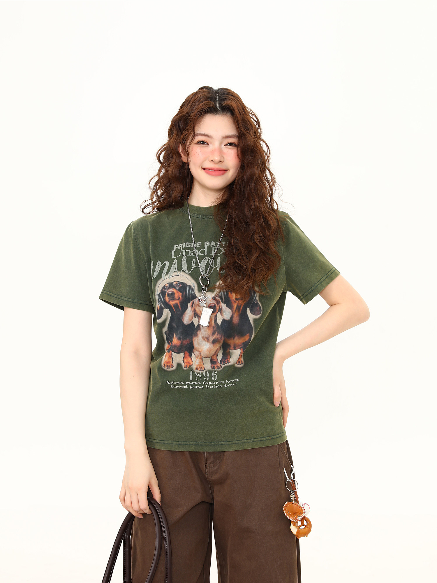 正肩T恤女美式復古水洗做舊臘腸狗印花短寬鬆百搭短袖