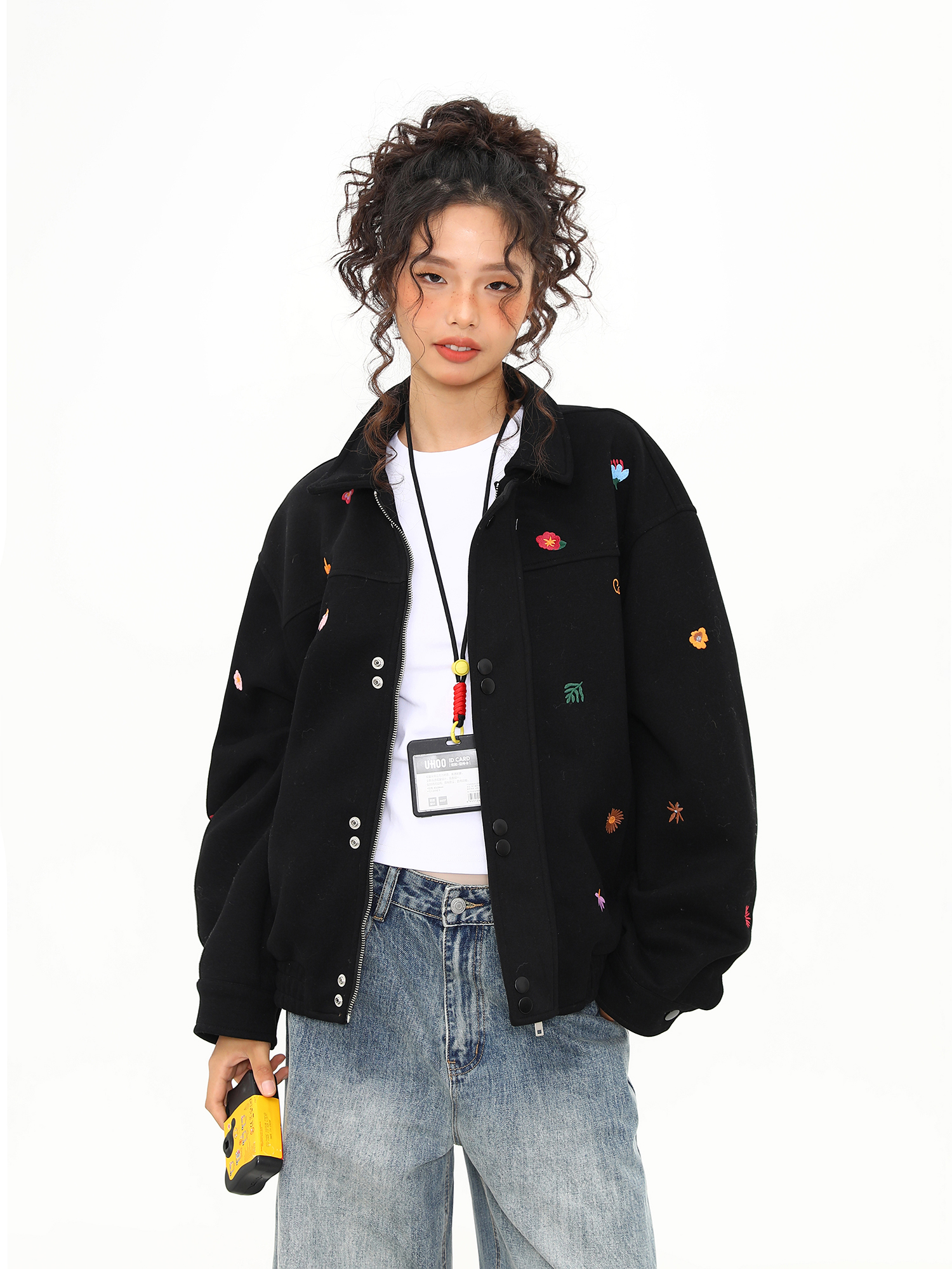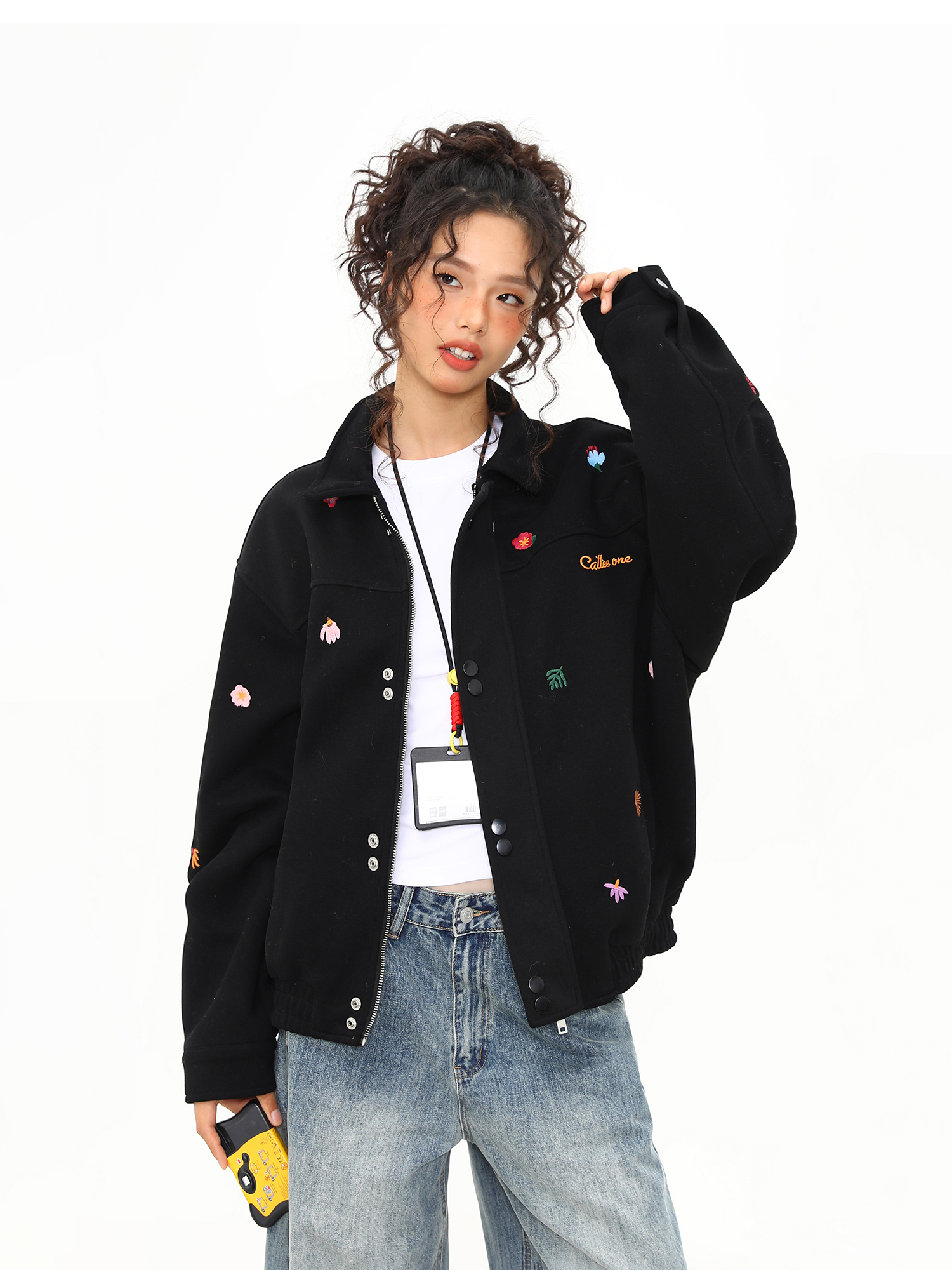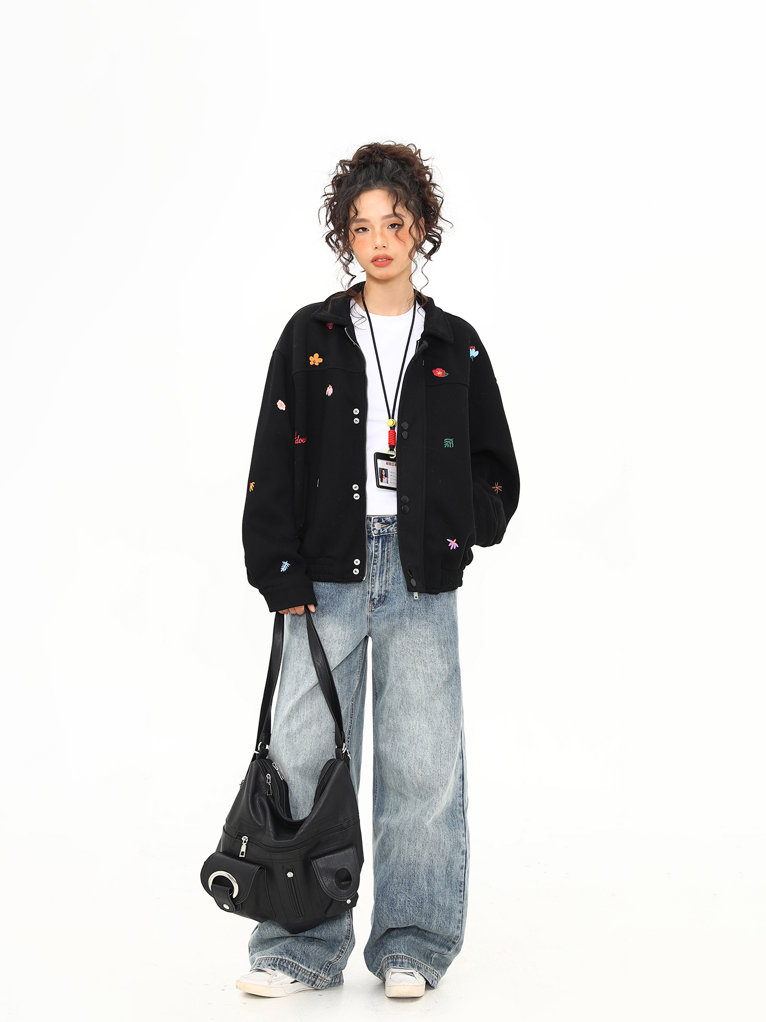 秋冬新款美式復古刺繡小標夾克外套女百搭翻領上衣