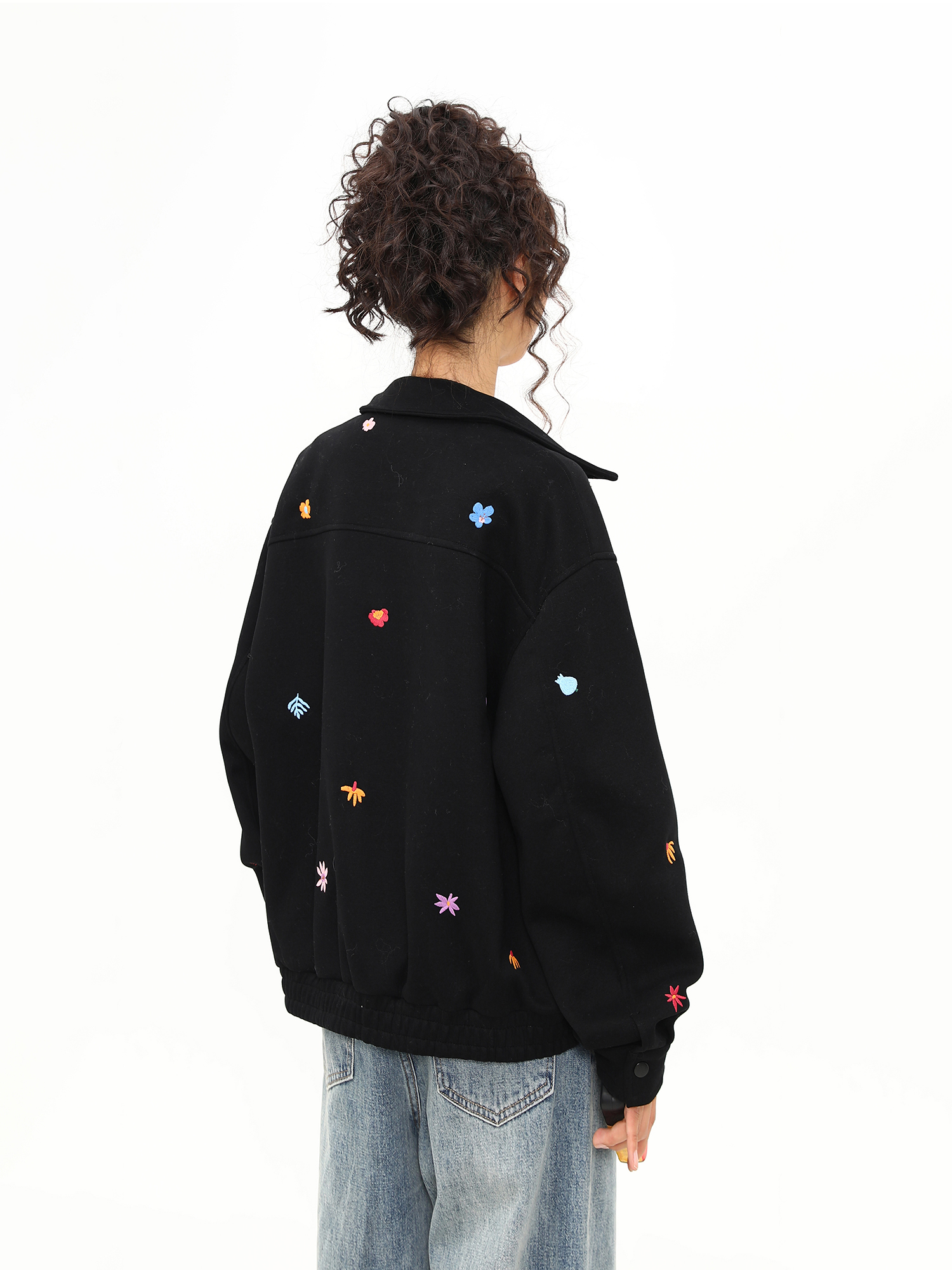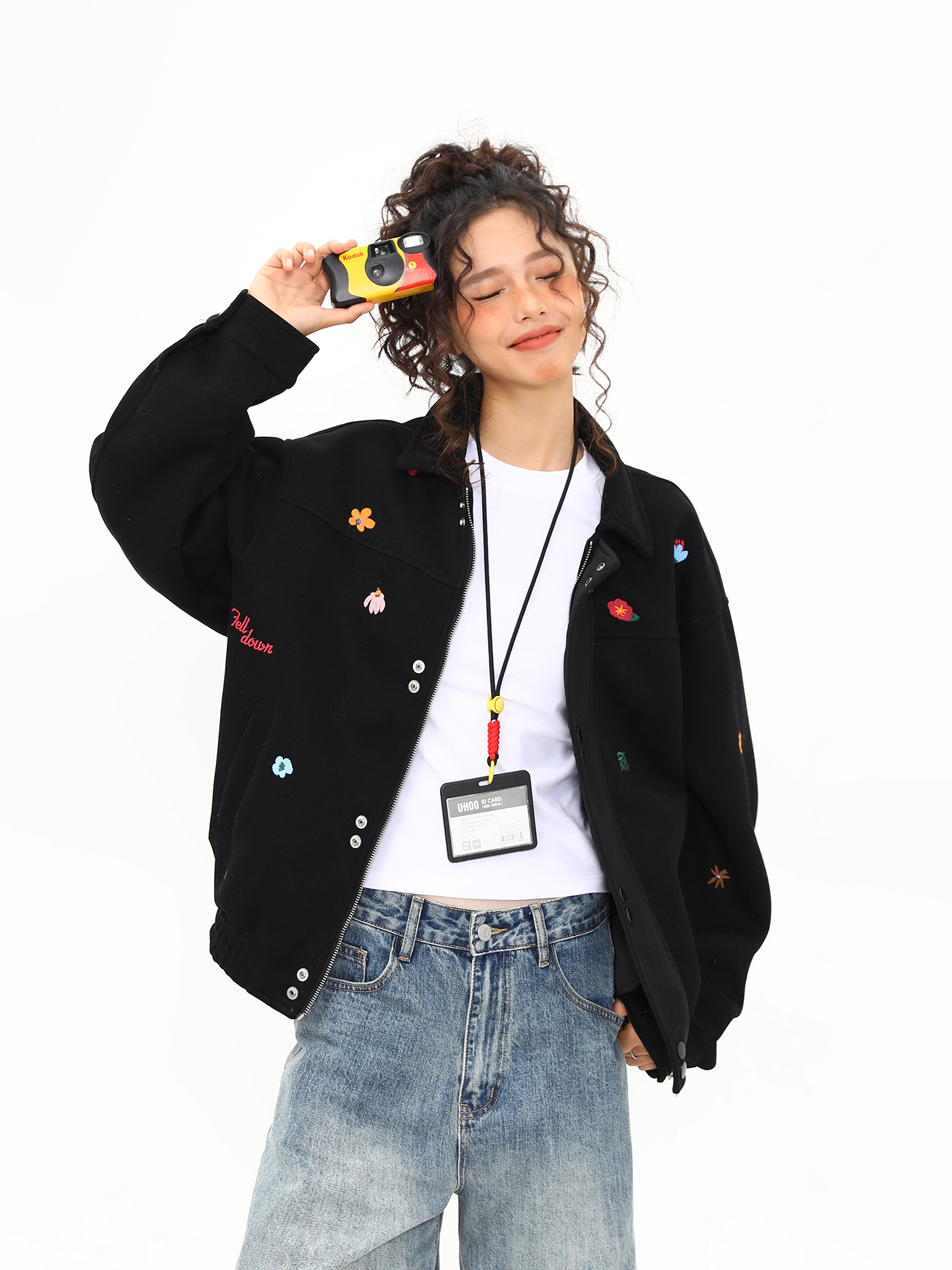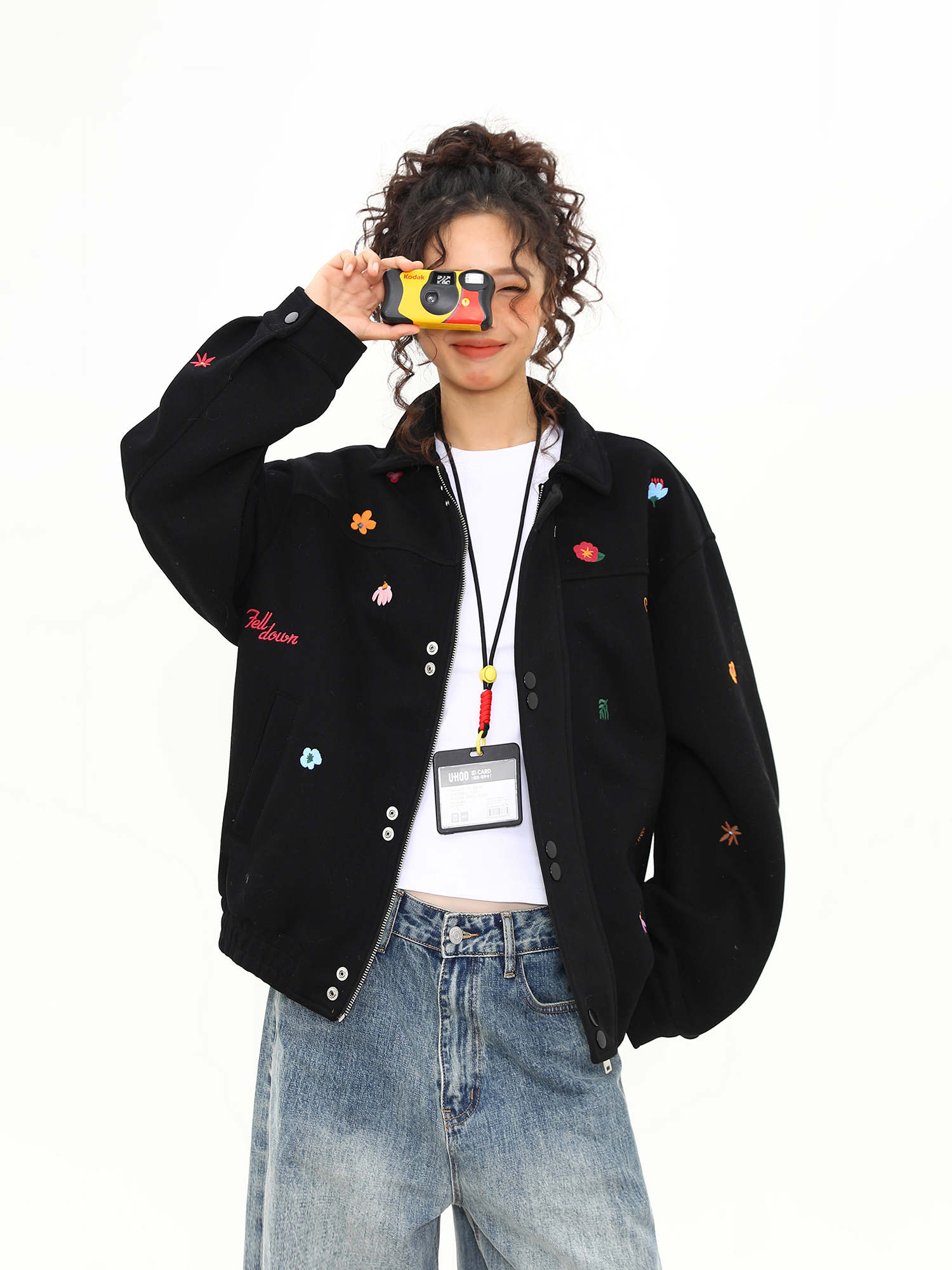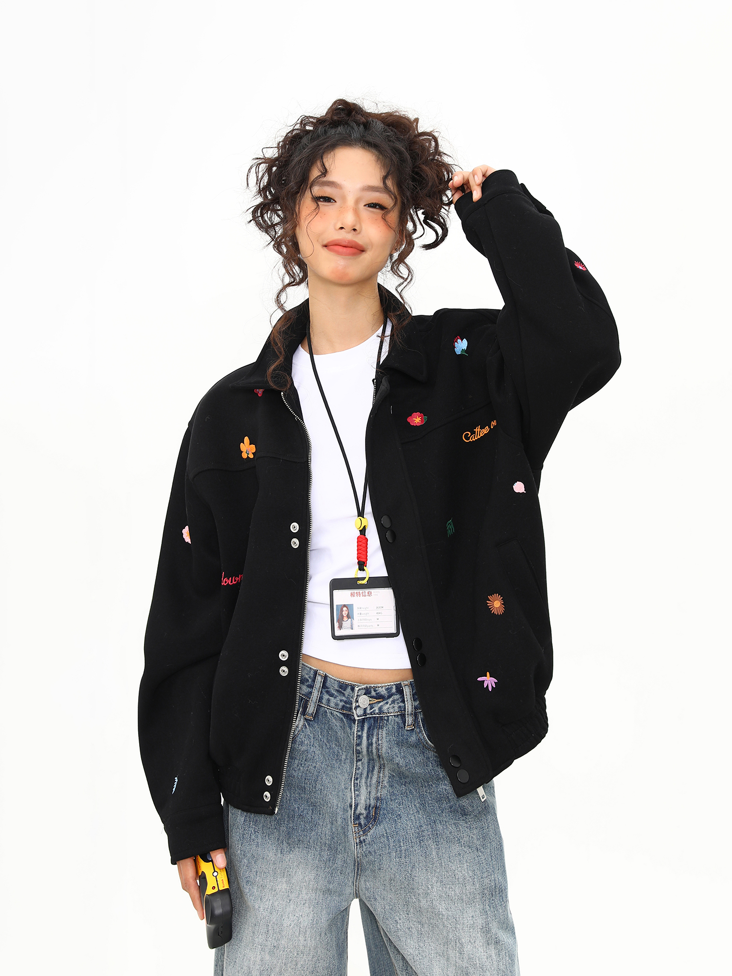 秋冬新款美式復古刺繡小標夾克外套女百搭翻領上衣