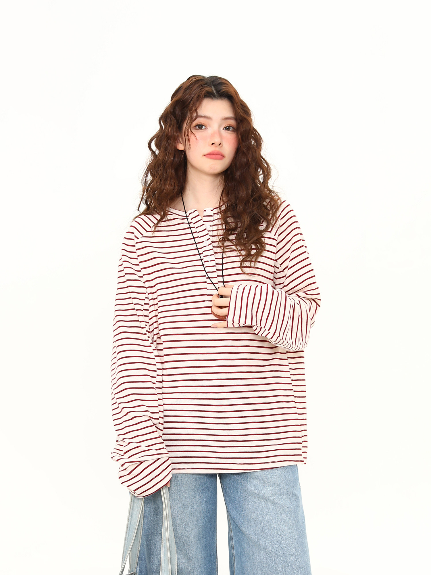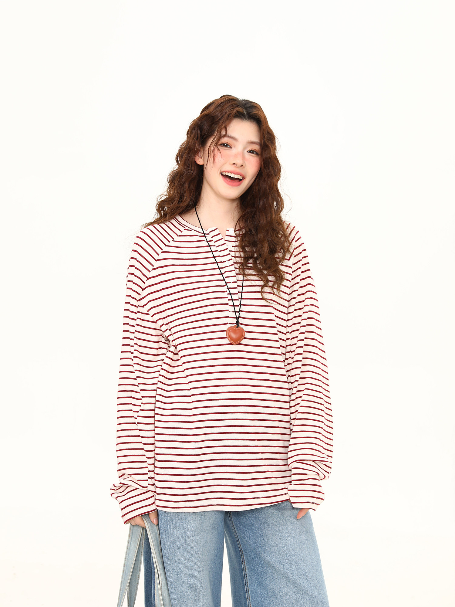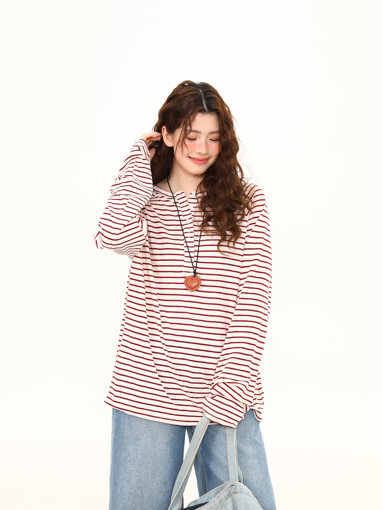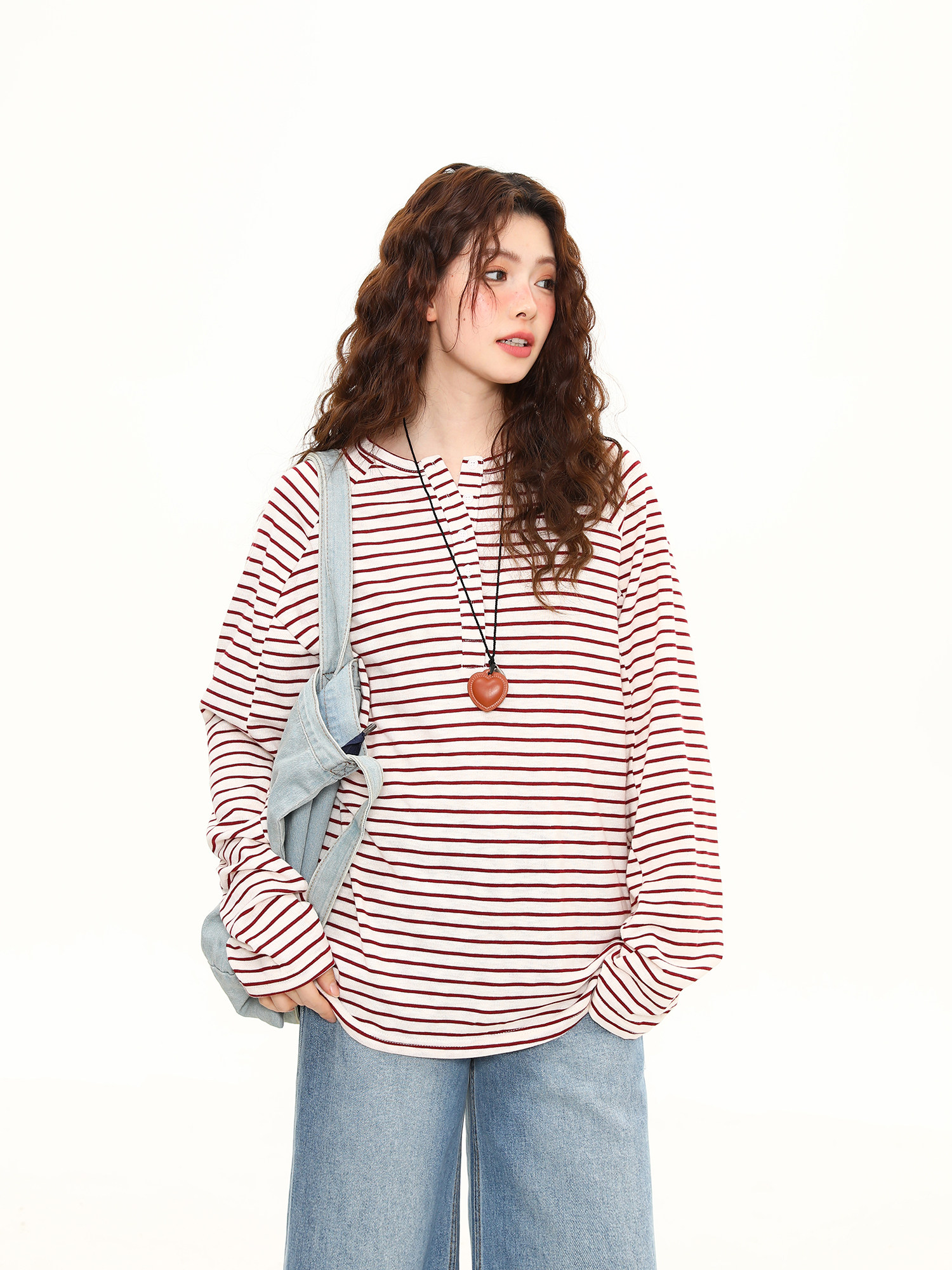 美式復古亨利領條紋長袖T恤女春夏輕薄寬鬆慵懶防曬罩衫