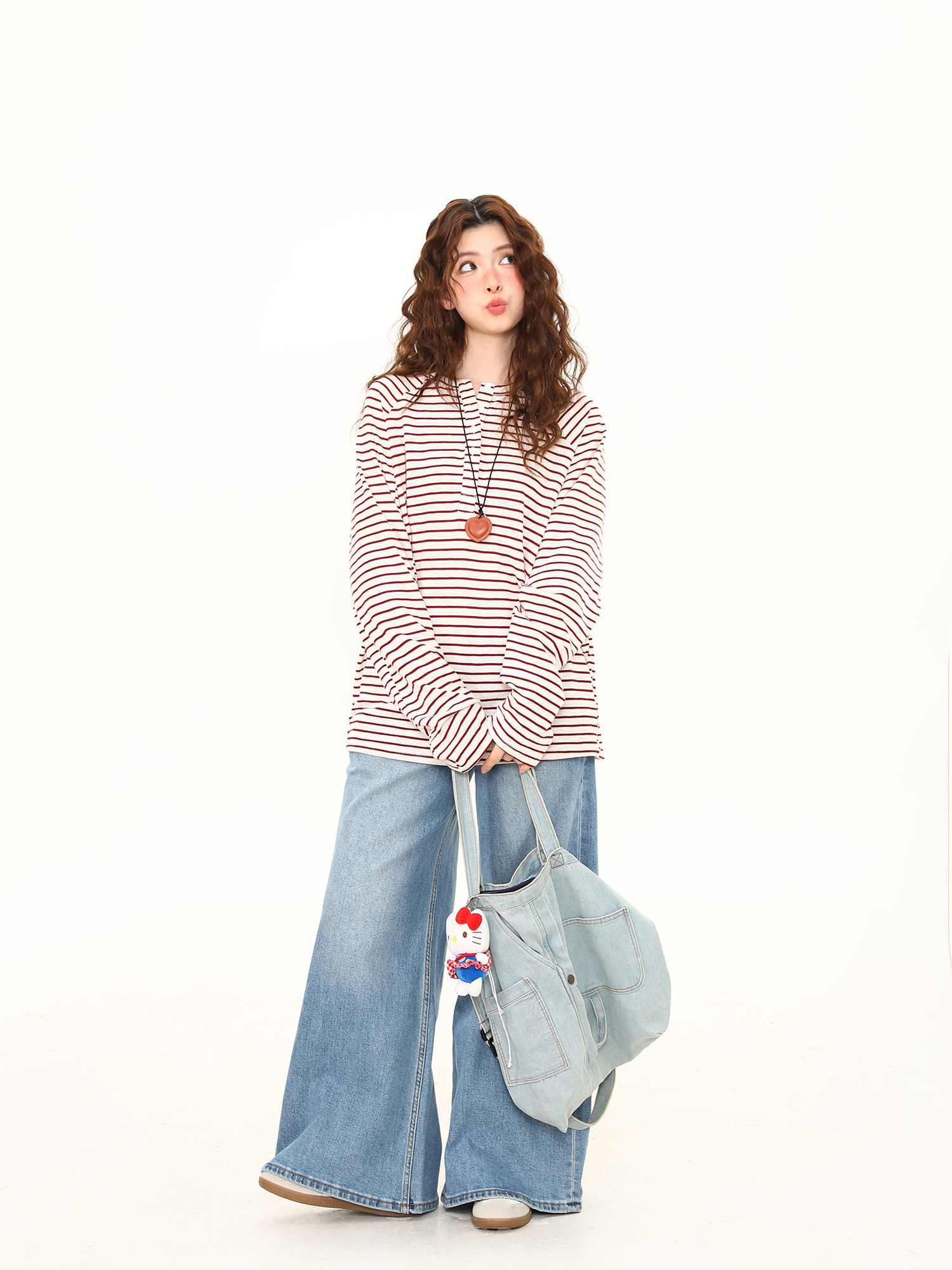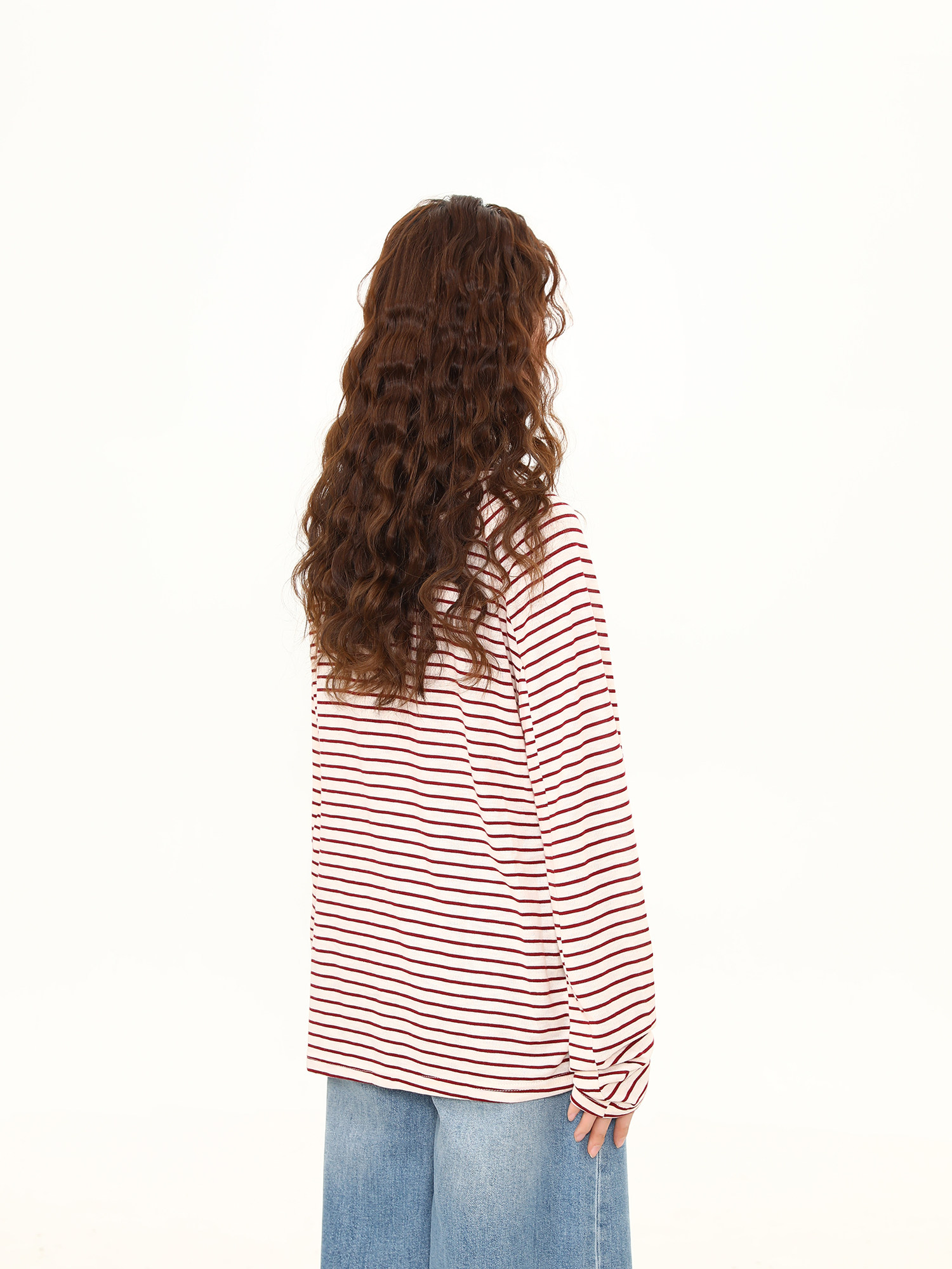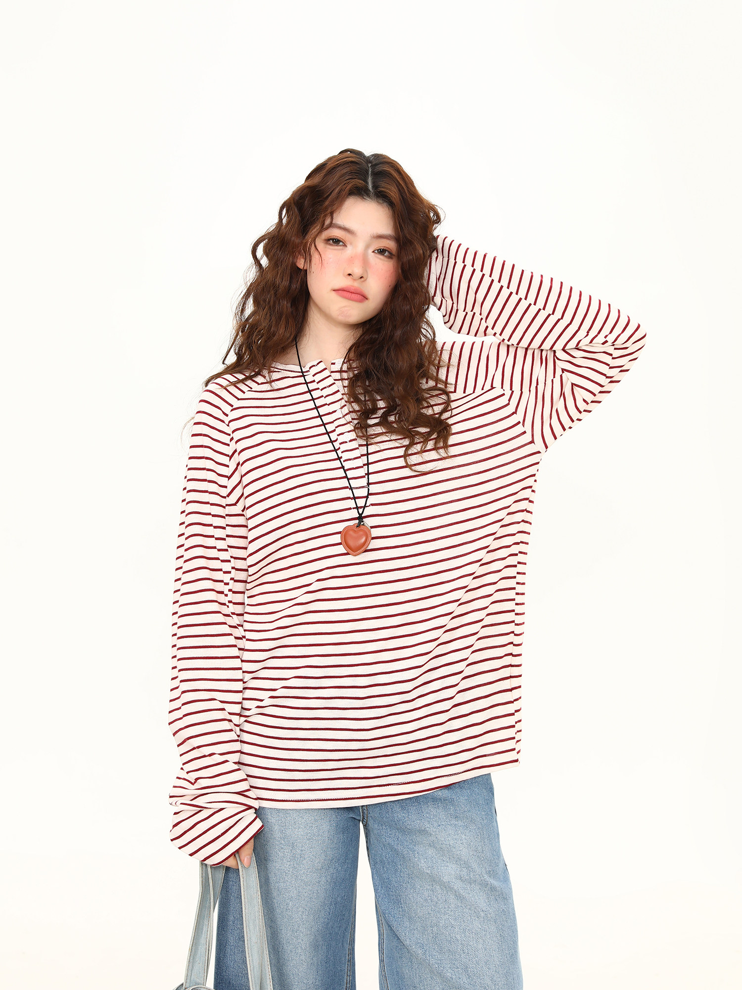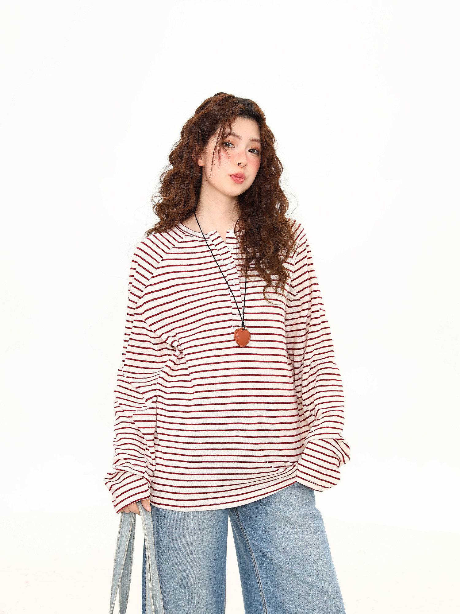 美式復古亨利領條紋長袖T恤女春夏輕薄寬鬆慵懶防曬罩衫